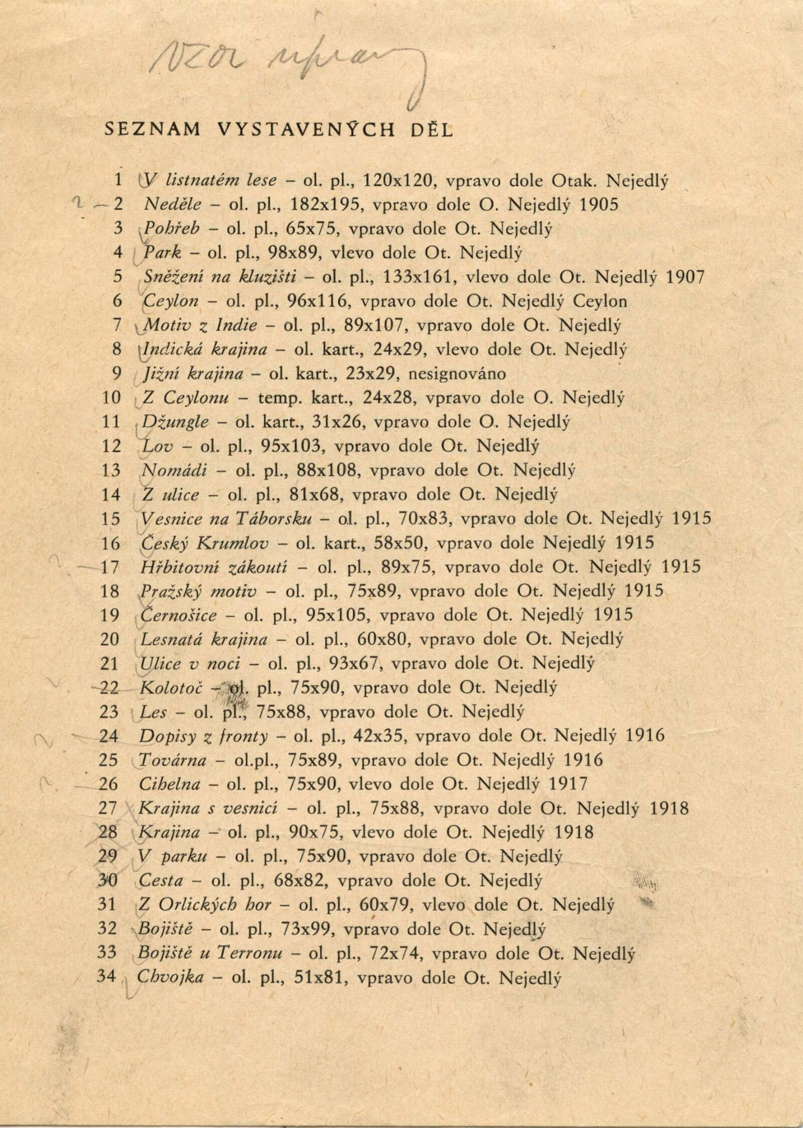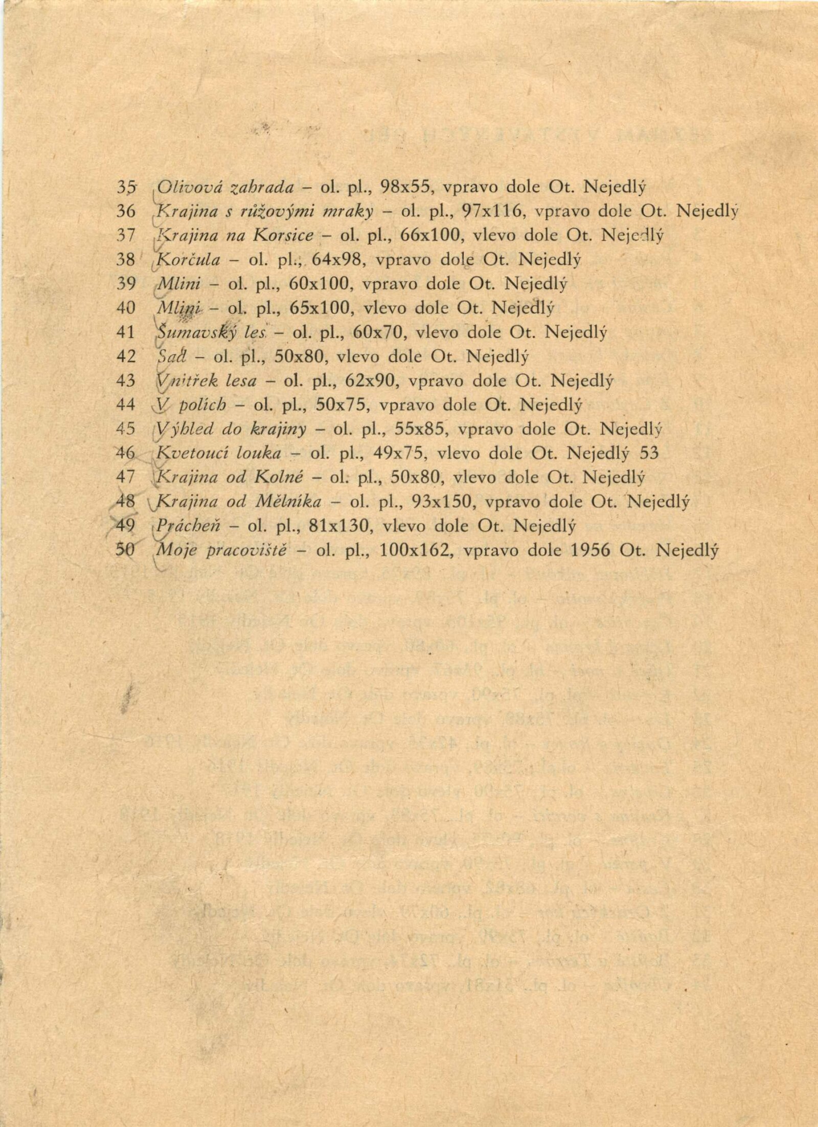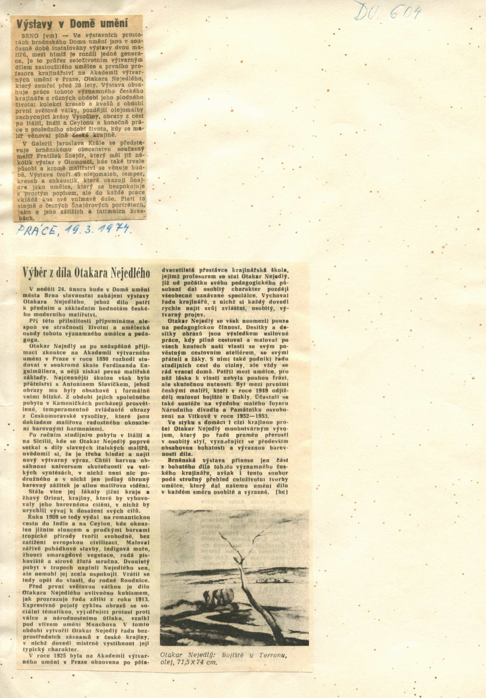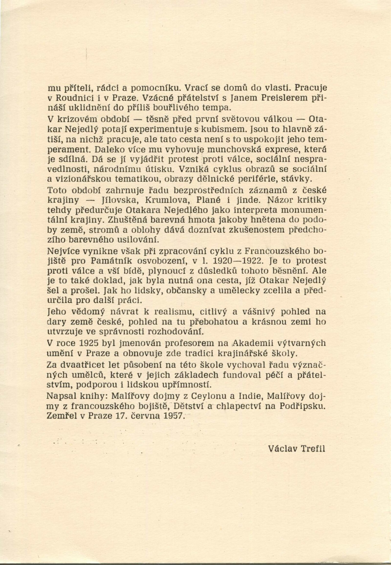 Otakar Nejedlý. Výběr z díla: Dům umění města Brna, 24. 2. – 31. 3. 1974 / Text: Václav Trefil. – Praha: Středočeská galerie, 1974. – skládačka 6 s., volně 6 l. obr. příl., seznam vystavených děl 2 s., životopisná data, DU 604. – MZK; MG; MMB