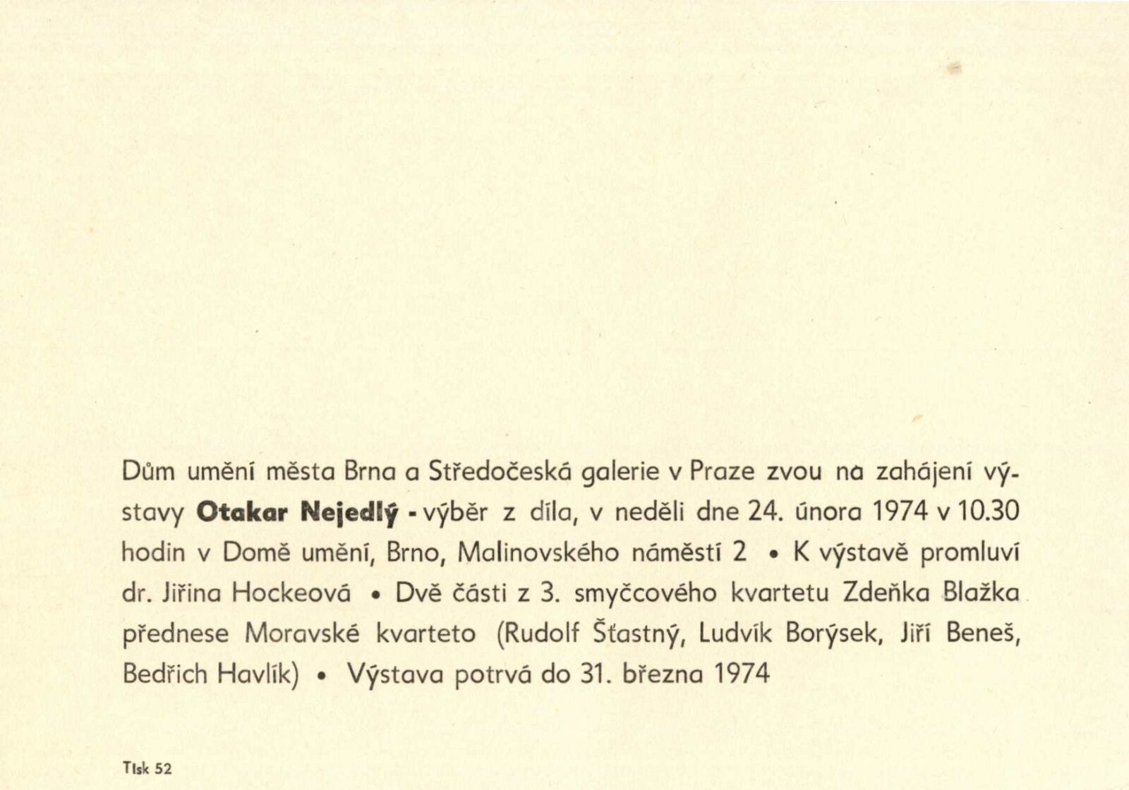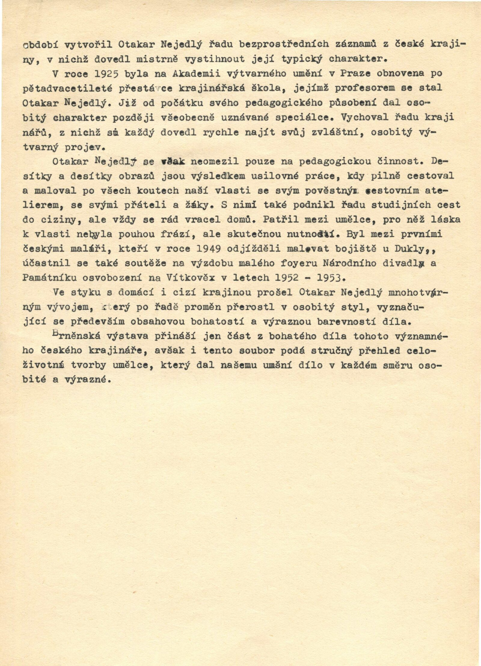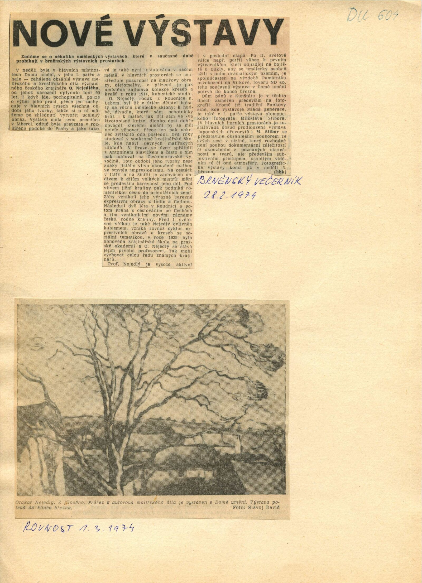 Otakar Nejedlý. Výběr z díla: Dům umění města Brna, 24. 2. – 31. 3. 1974 / Text: Václav Trefil. – Praha: Středočeská galerie, 1974. – skládačka 6 s., volně 6 l. obr. příl., seznam vystavených děl 2 s., životopisná data, DU 604. – MZK; MG; MMB