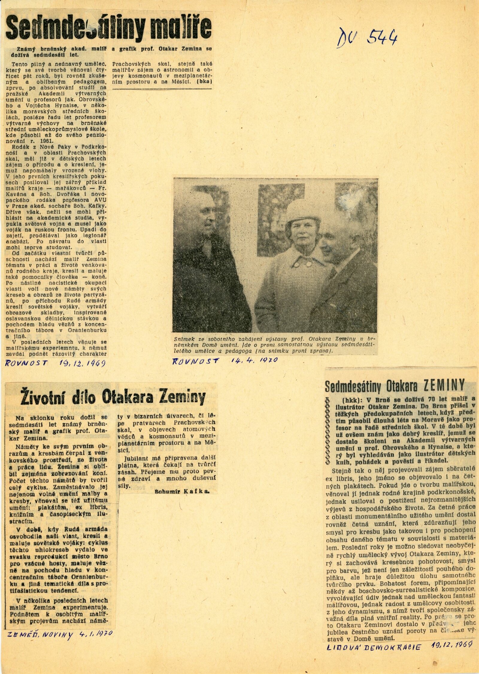 Otakar Zemina. Obrazy 1968–1969: Dům umění, 32. výstava v Galerii Jaroslava Krále, 11. 4. 1970 – 17. 5. 1970 / Text: Jaromír Zemina. – Brno: ČFVU, 1970. – 10 s., obr., portrét, životopis, DU 544. – MZK; MG; MMB