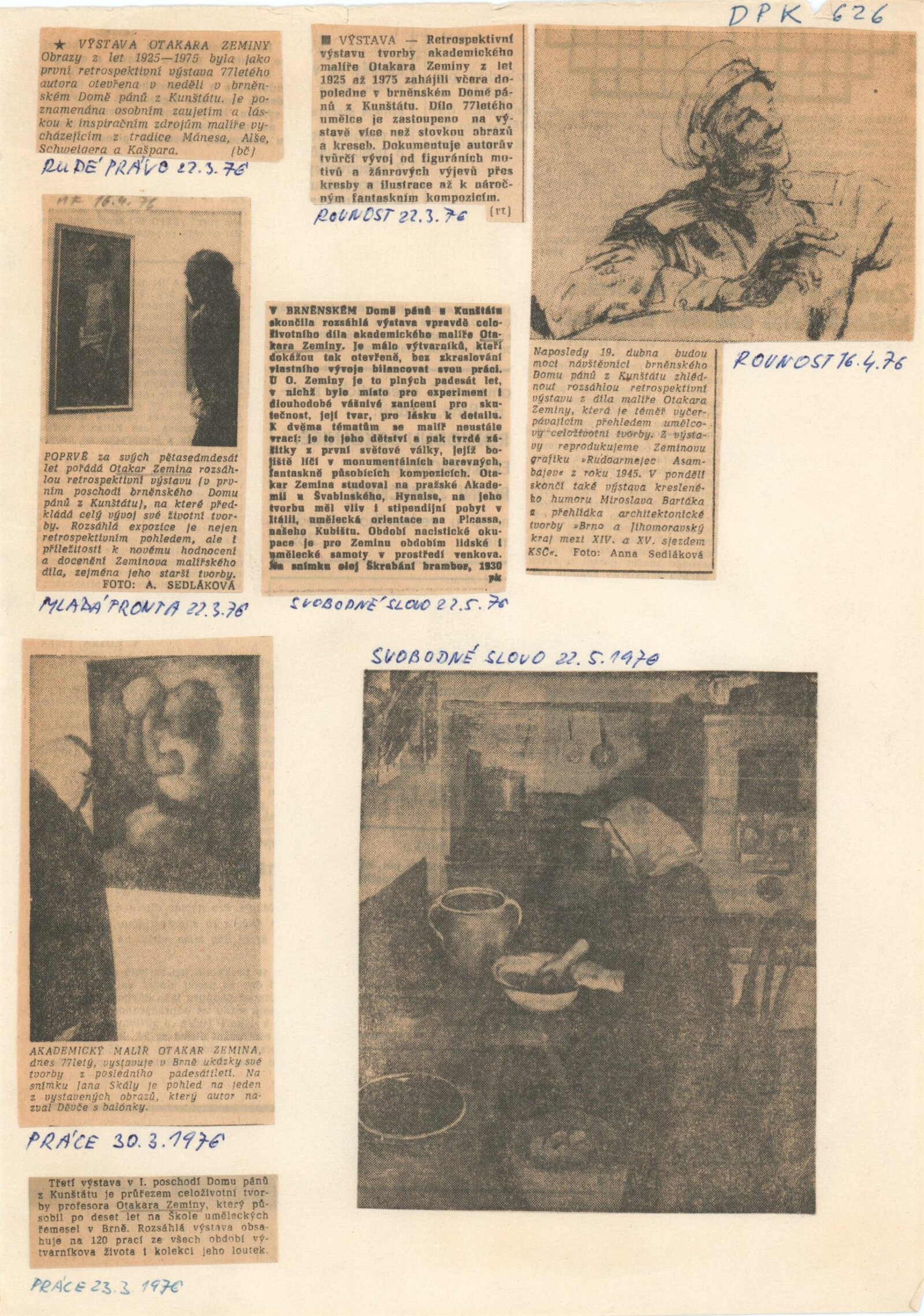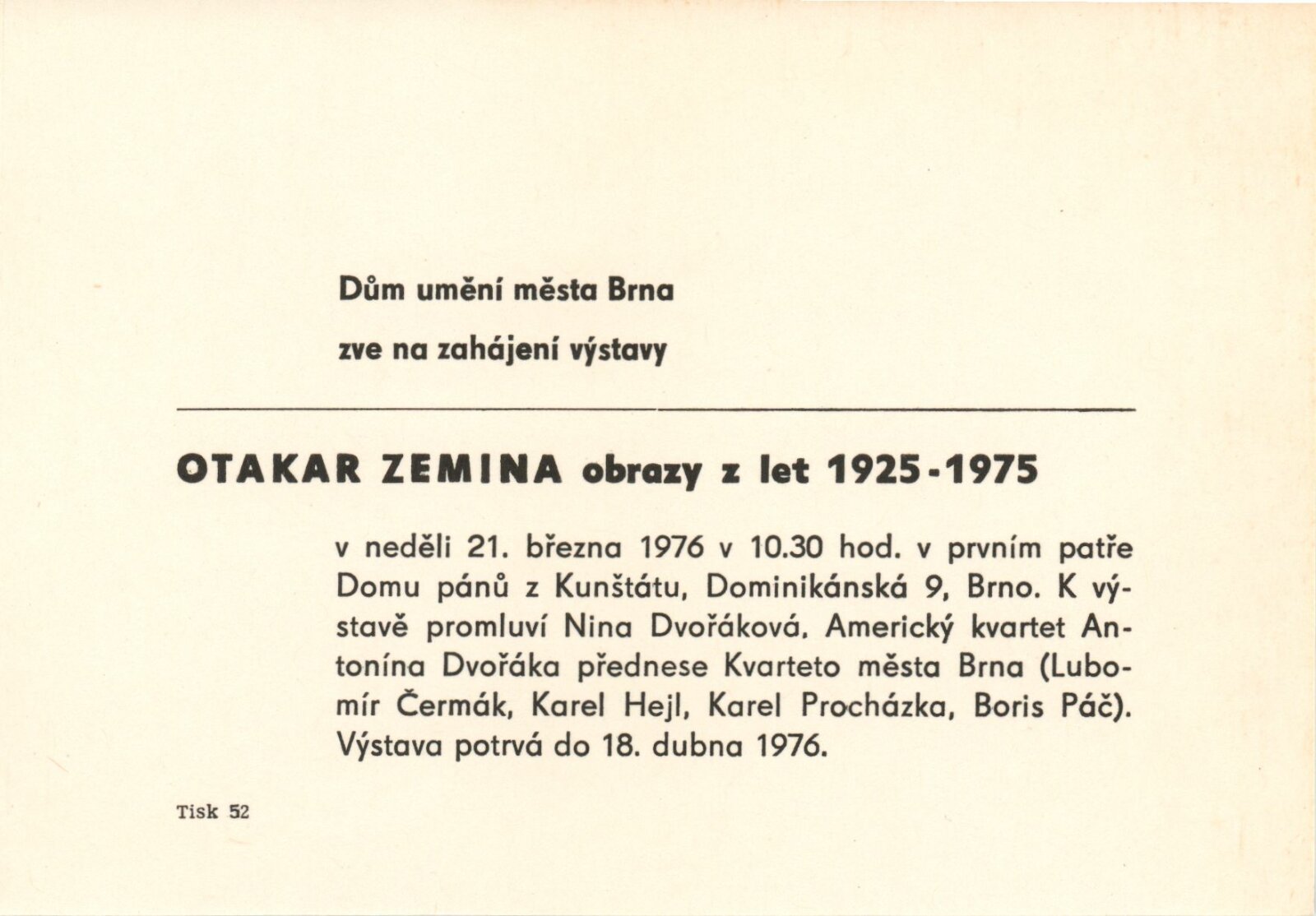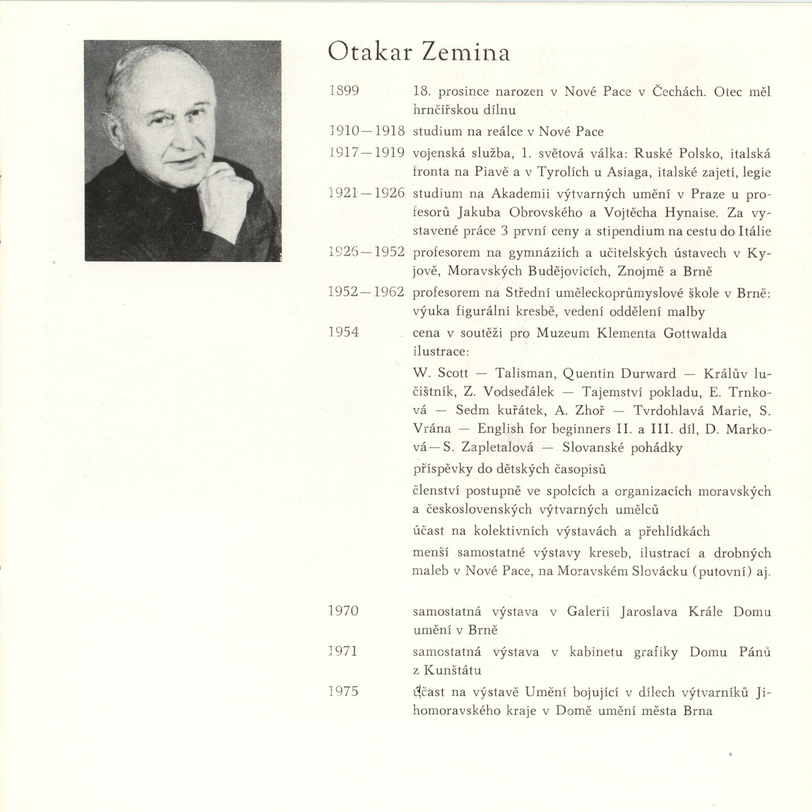 Otakar Zemina. Obrazy z let 1925–1975: Dům umění / Dům pánů z Kunštátu, 21. 3. – 18. 4. 1976 / Text: Nina Dvořáková. – Brno: DUmB, 1976. – 20 s., obr., portrét, životní data, DPK 626. – MZK; MG; MMB