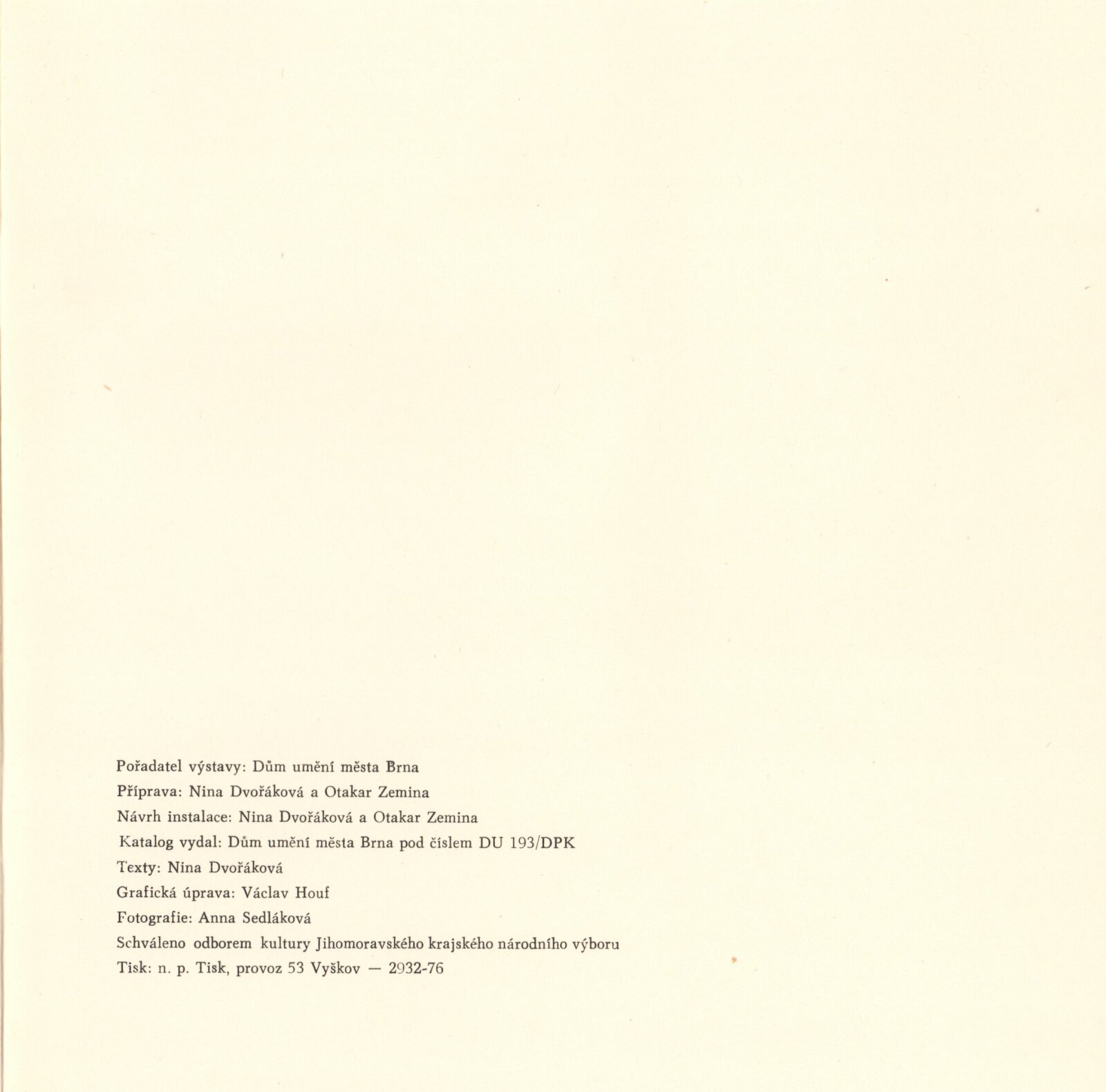 pozvánka, katalog, fotografie děl, fotografie výstavy a z vernisáže, seznam vystavených děl, úvodní slovo, strojopis textu pro katalog + překlad (AJ, NJ, RJ), osobní korespondence (Jiří Krejčí / Nina Dvořáková / Albert Kutal), provozní korespondence, žádost o uspořádání výstavy, vyjádření SČVU, koncepce výstavy, prezenční listina z tiskové konference (19. 3. 1976), smlouva k výstavě, žádost o povolení výstavy, recenze v tisku