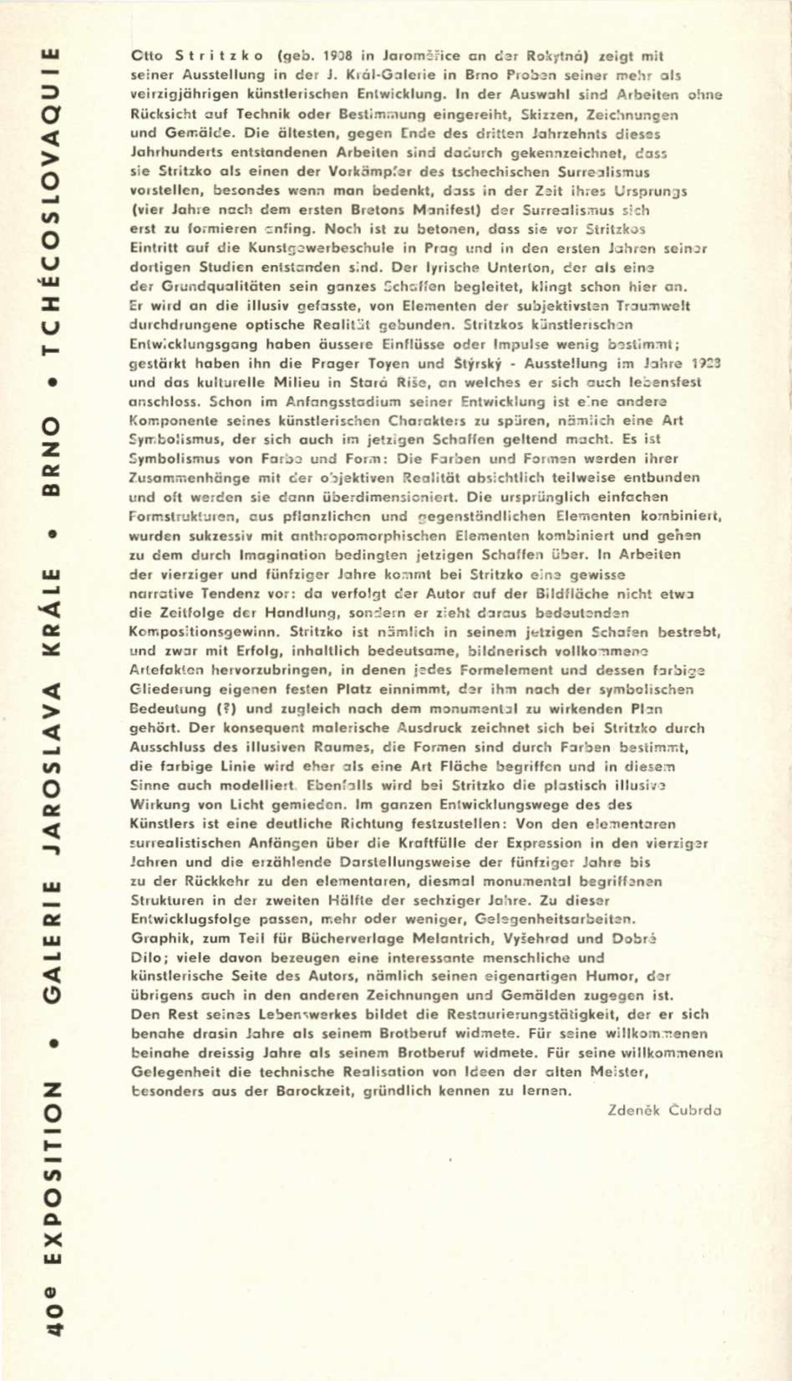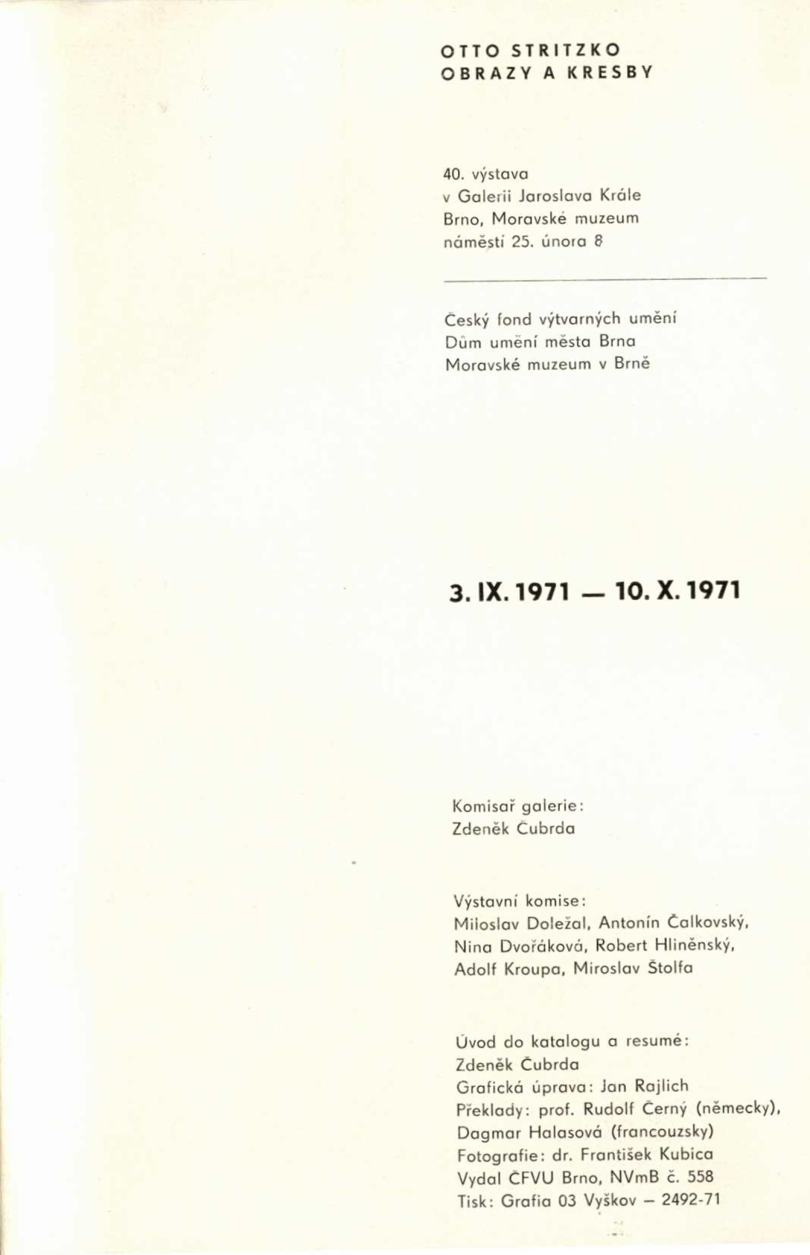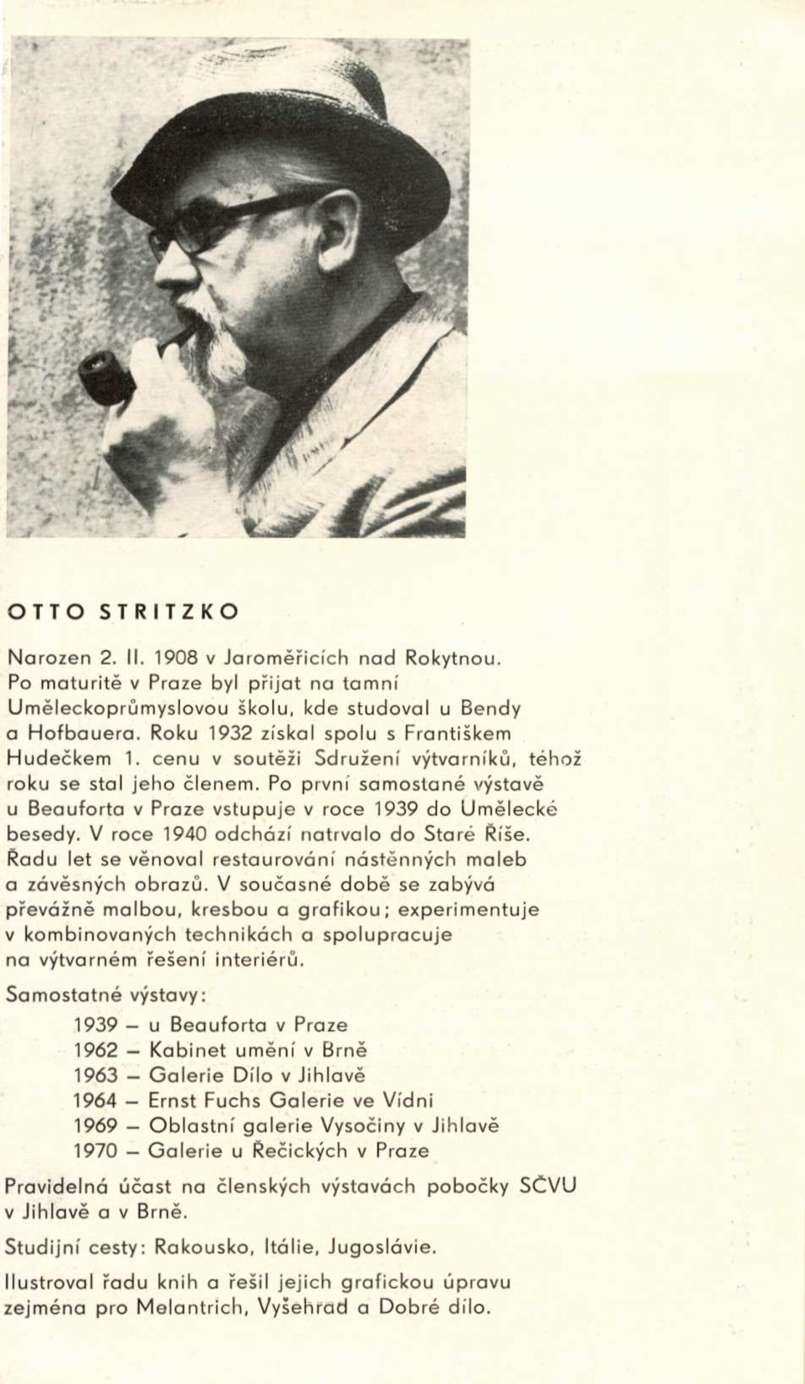 Otto Stritzko. Obrazy a kresby: Dům umění, 40. výstava v Galerii Jaroslava Krále, 3. 9. – 10. 10. 1971 / Text: Zdeněk Čubrda. – Brno: ČFVU, 1971. – 10 s., obr., portrét, životopis. – MZK; MG; MMB