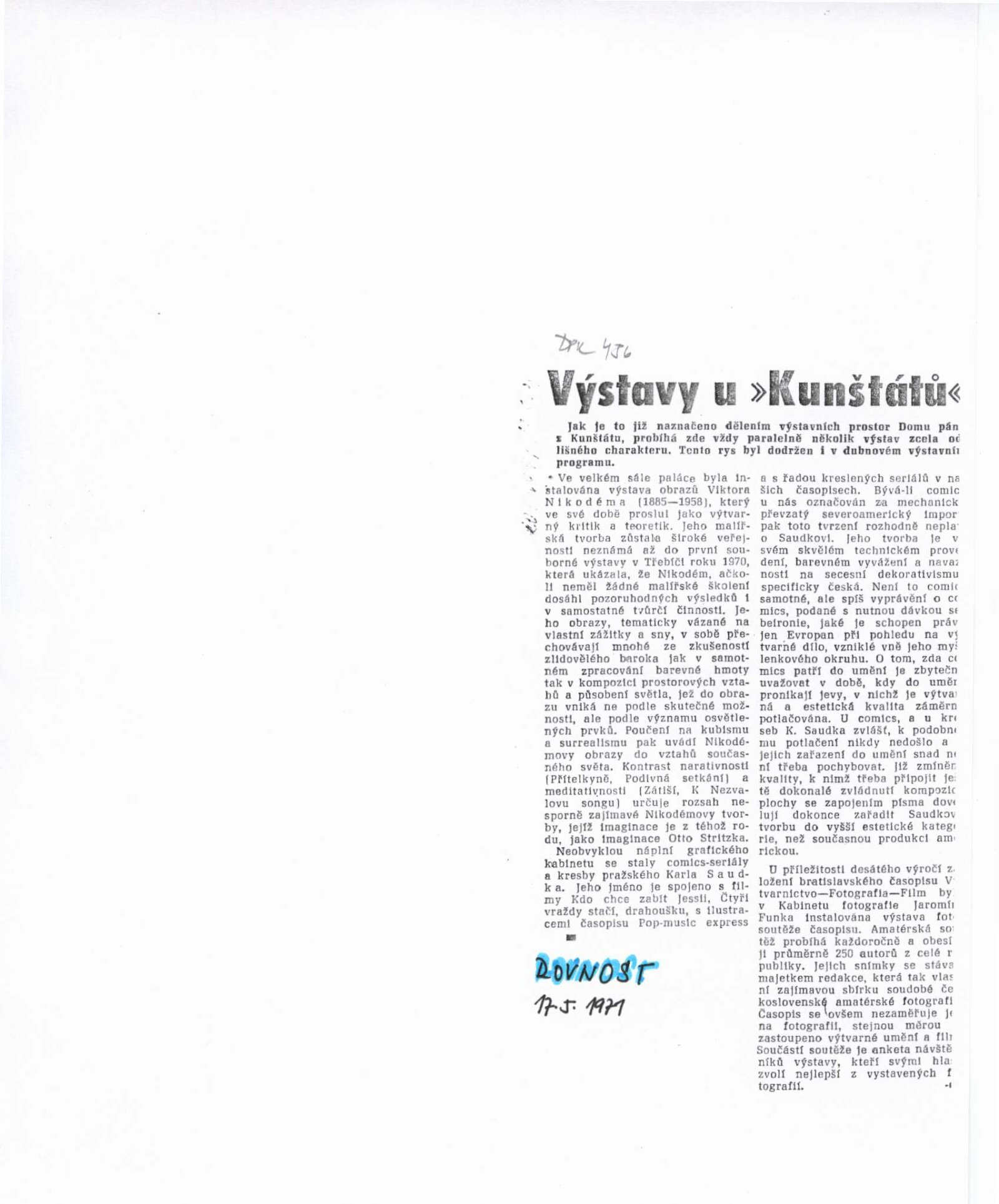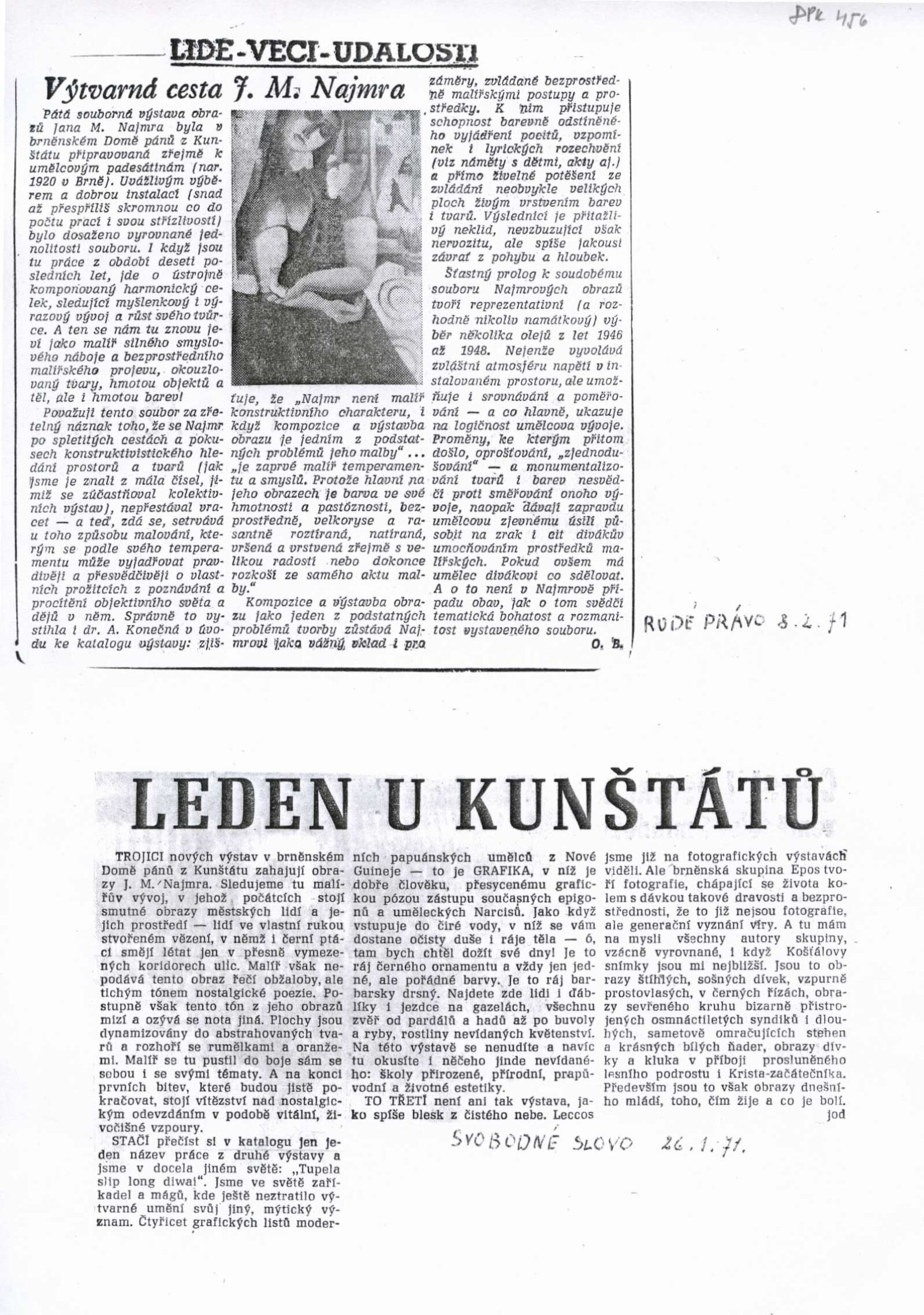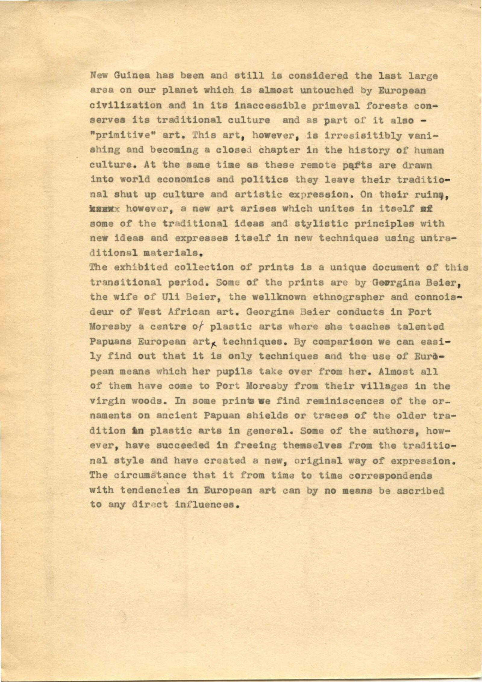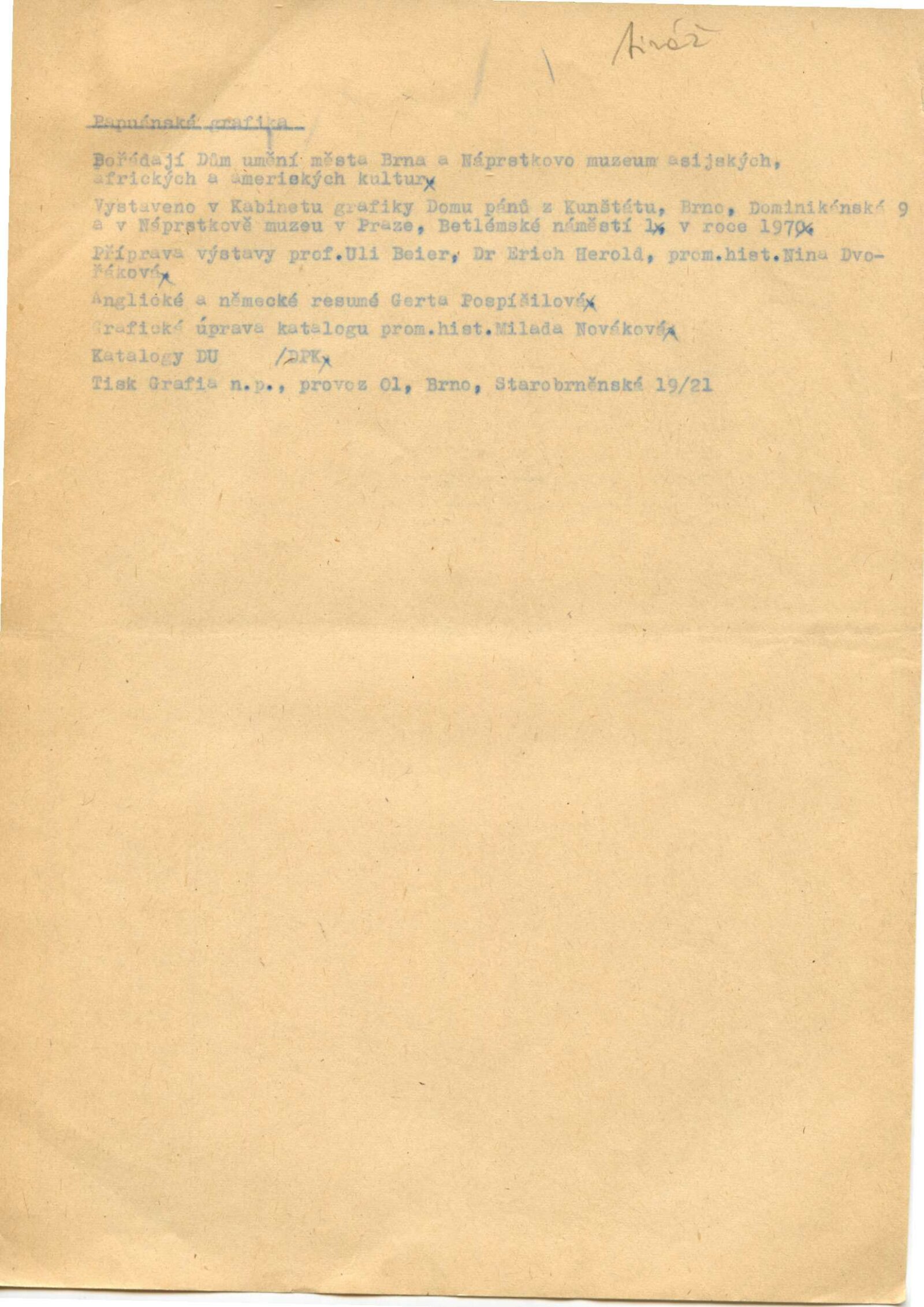 spol. pozvánka DPK 454–456, katalog, fotografie děl a výstavy, strojopis textu pro katalog, překlady (NJ, AJ, SJ), seznam vystavených grafik, provozní korespondence (Erich Herald / Dům umění), potvrzení o výpůjčce a převzetí výstavy se soupisem děl (Náprstkovo muzeum), žádost o povolení výstavy, recenze v tisku, pozvánka "Exhibition of Prints" (Papua Nová Guinea, 1970)