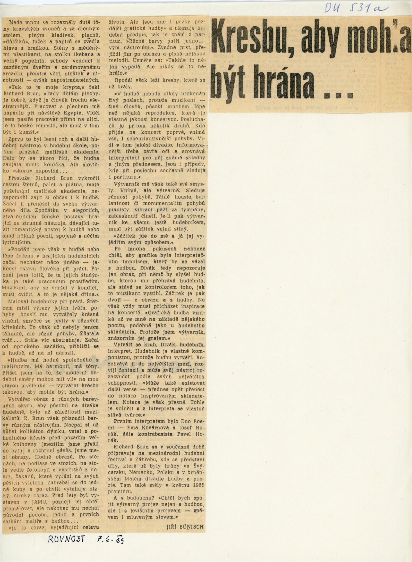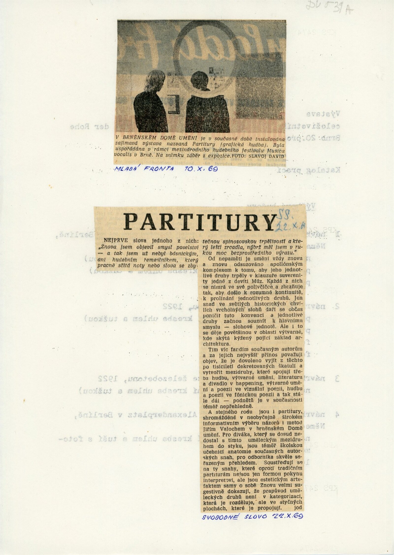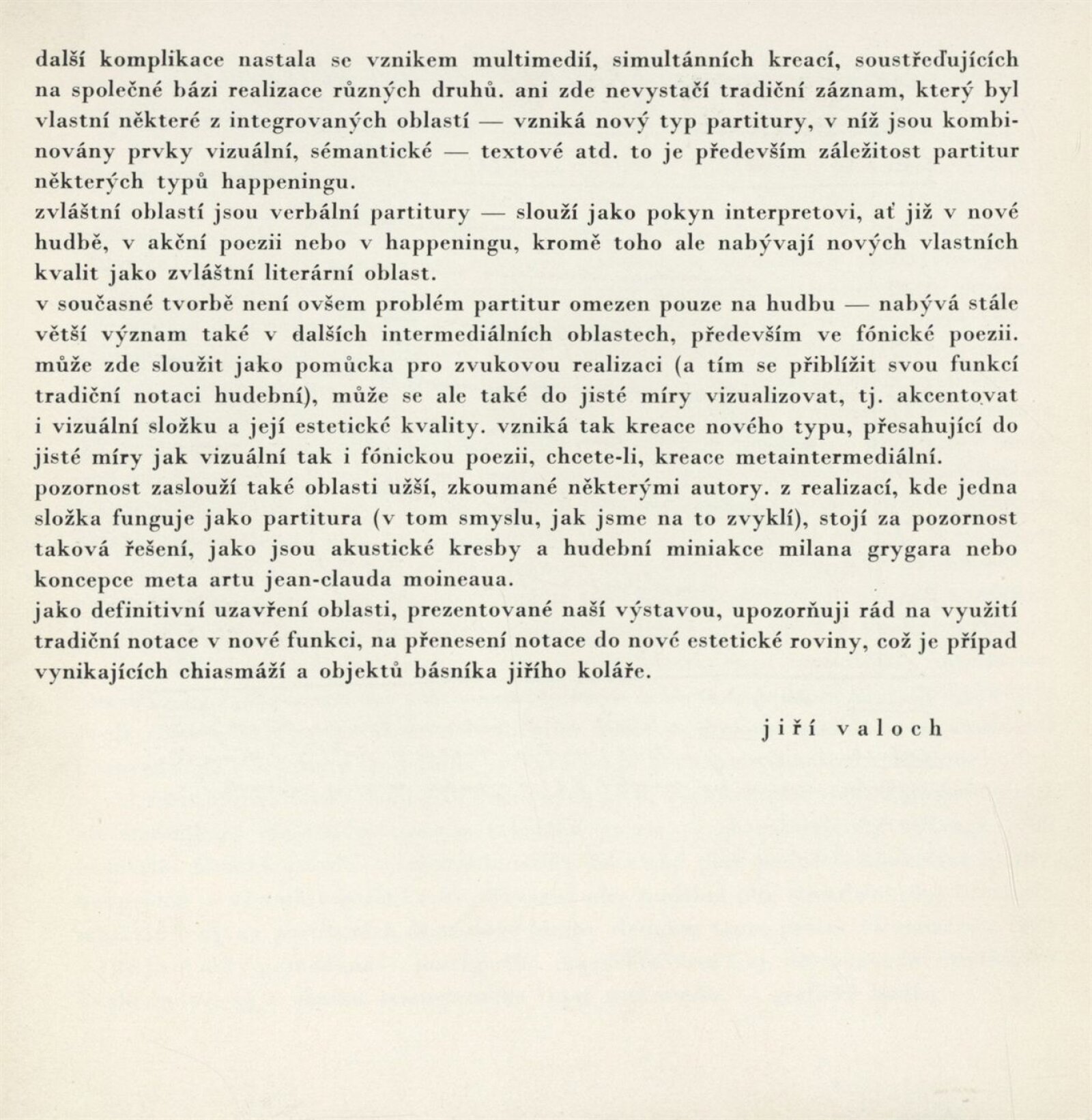 Partitury. Hudební grafika, u příležitosti IV. Mezinárodního hudebního festivalu v Brně Musica vocalis: Dům umění města Brna, hala, 27. 9. – 6. 11. 1969 / Text: Jiří Valoch. – Brno: DUmB, 1969. – 14 s., obr., DU 531a. – MZK ; MG