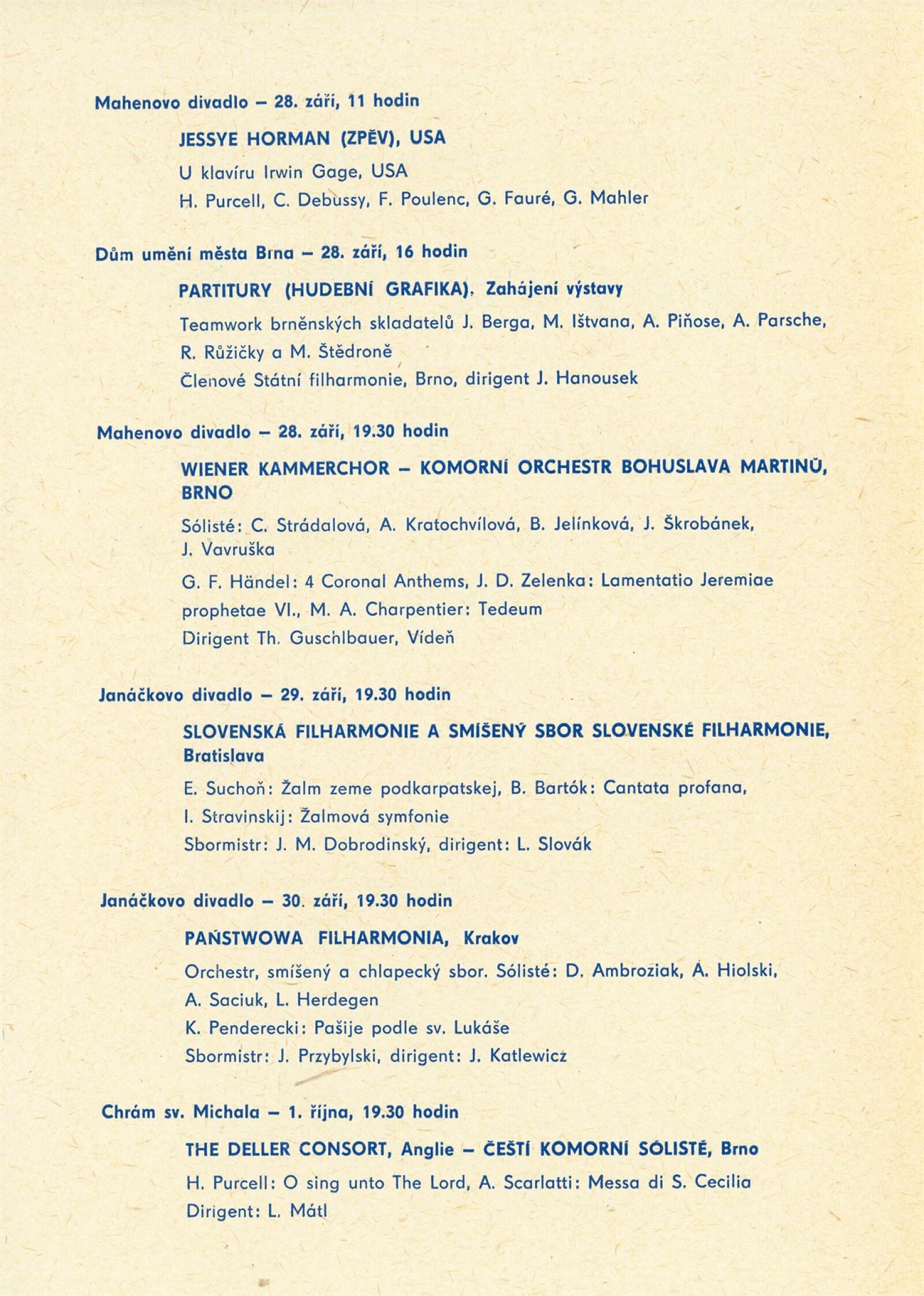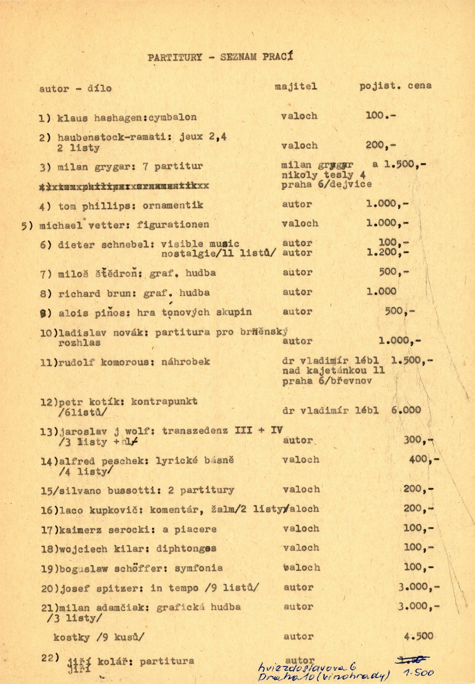 Milan Adamčiak, Eric Andersen, Louis Andriessen, Günter Becker, Xavier Benguerel, Silvano Bussotti, George Brecht, Earle Brown, Richard Brun, Ton Bruynèl, John Cage, Cornelius Cardew, Nicollo Castiglioni, Sergio Cervetti, Bob Cobbing, Róbert Cyprich, James Drew, Luc Ferrari, Ken Friedman, Milan Grygar, Brion Gysin, Klaus Hashagen, Roman Haubenstock-Ramati, Bernard Heidsieck, Henri Chopin, Bengt Emil Johnson, Roland Kayn, Peter Kiesewetter, Wojciech Kilar, Jiří Kolář, Rudolf Komorous, Petr Kotík, Wlodzimier Kotoński, Ladislav Kupkovič, Anestis Logothetis, George Maciunas, Yoriaki Matsudiara, Ladislav Novák, Arnošt Parsch, Krzysztof Penderecki, Alfred Peschek, Tom Phillips, Alois Piňos, Steve Reich, Paolo Renosto, Josef Anton Riedl, Willem de Ridder, Rudolf Růžička, Dieter Salbert, Kaimerz Serocki, Boguslaw Schäffer, Henryk Schiller, Irmin Schmidt, Dieter Schnebel, Josef Spitzer, Jan Steklík, Vladimír Šrámek, Miloš Štědroň, Yasunato Tone, Jiří Valoch, Ben Vautier, Edgar Verèse, Michael Vetter, Wolf Vostell, Paul De Vree, Robert Watts, Jaroslav J. Wolf, Bernd Alois Zimmerman