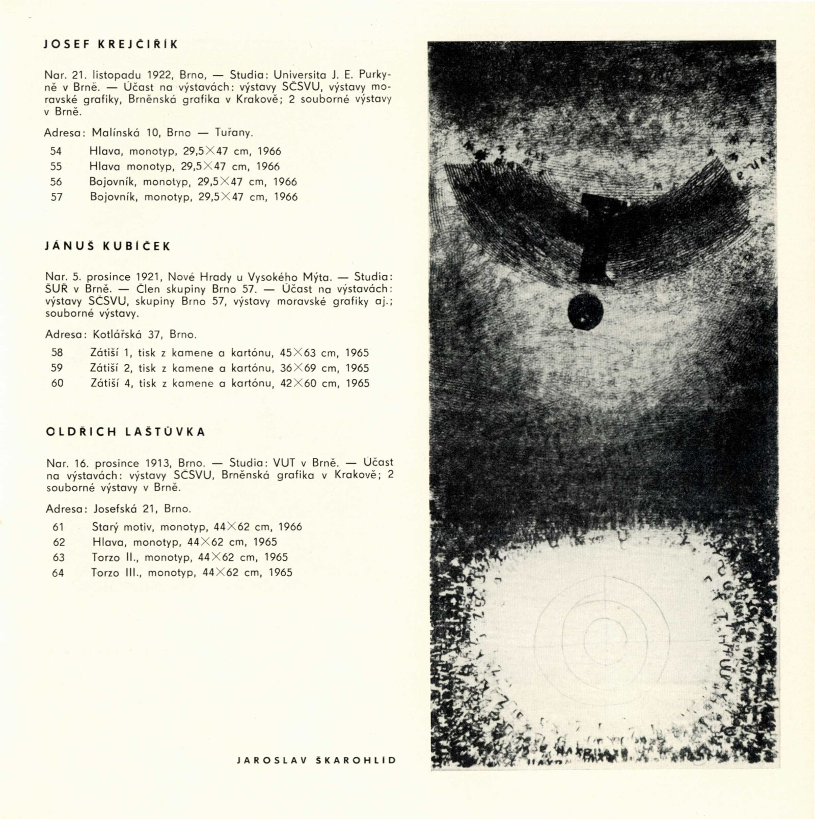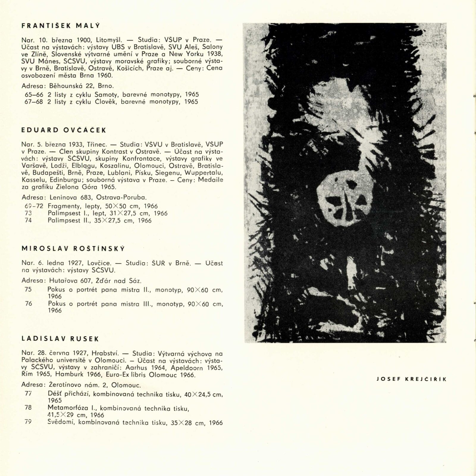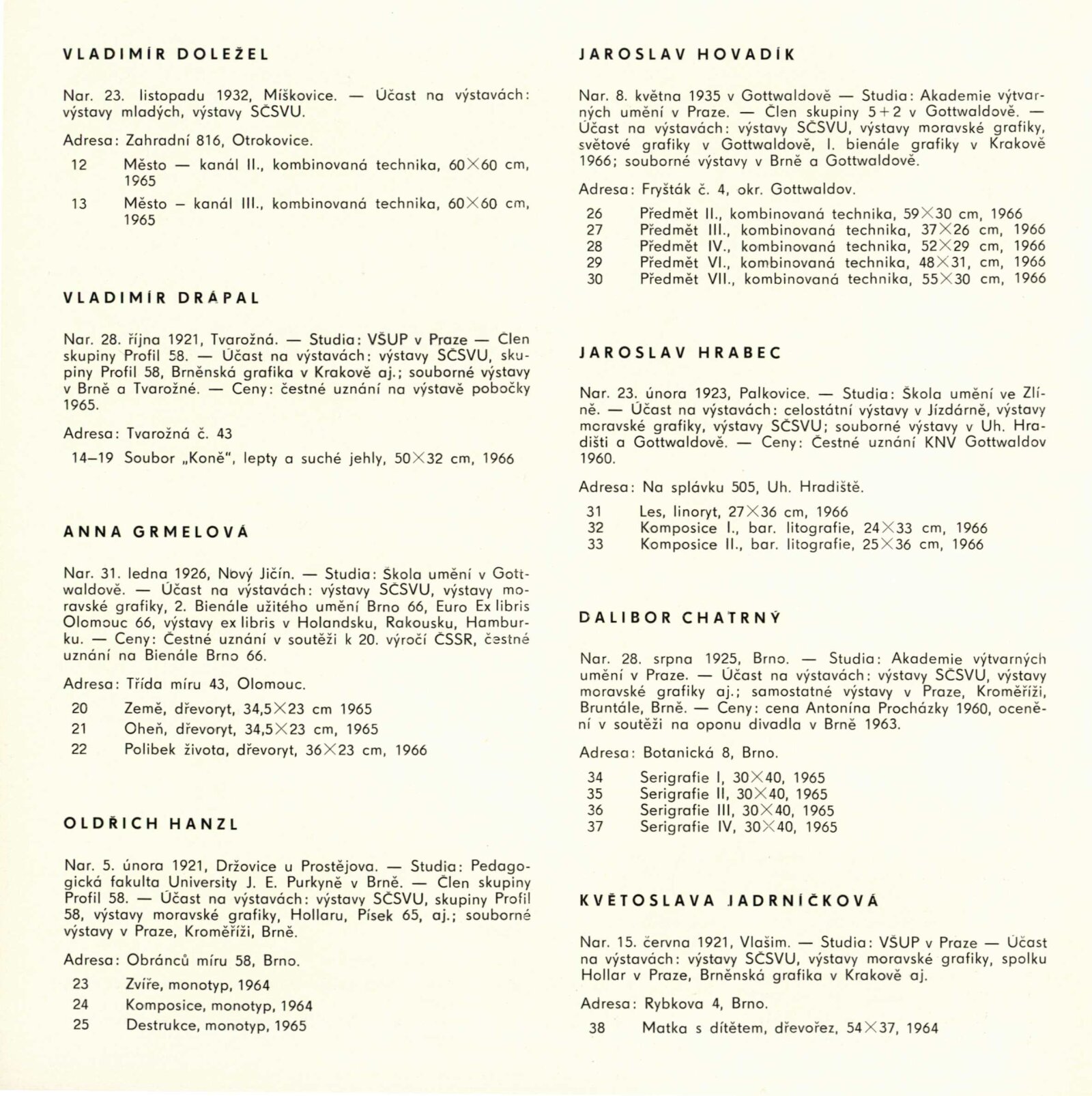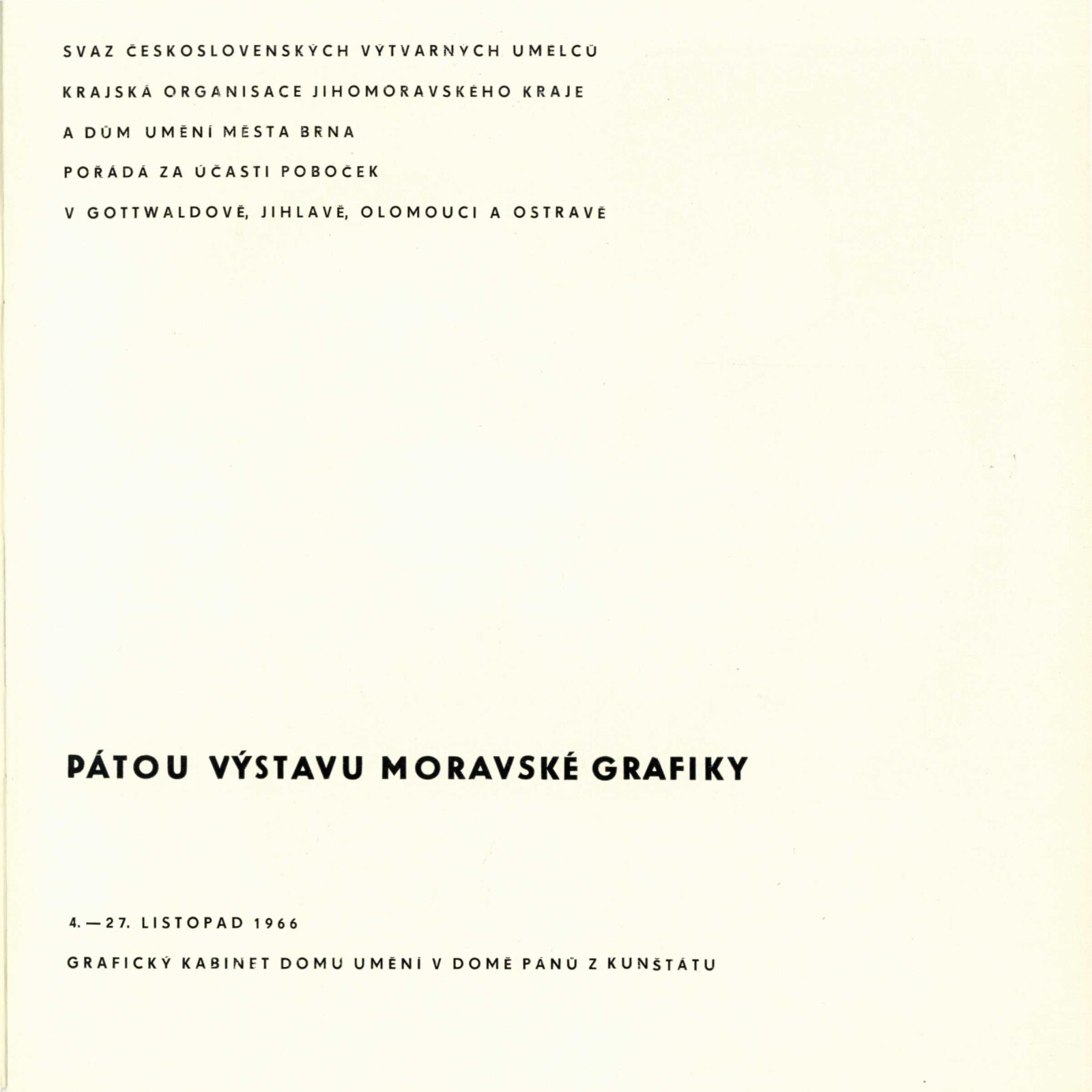 Pátá výstava moravské grafiky: Dům umění města Brna / Dům pánů z Kunštátu, 77. výstava Kabinetu grafiky, 4. 11. – 27. 11. 1966 / Text: Helena Kusáková-Knozová. – Brno: SČSVU, 1966. – 18 s., obr., životní data vystavujících, DPK 314. – MZK; MG