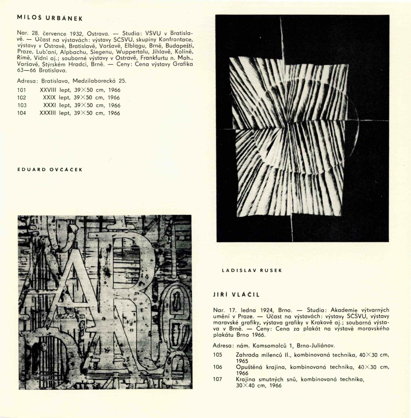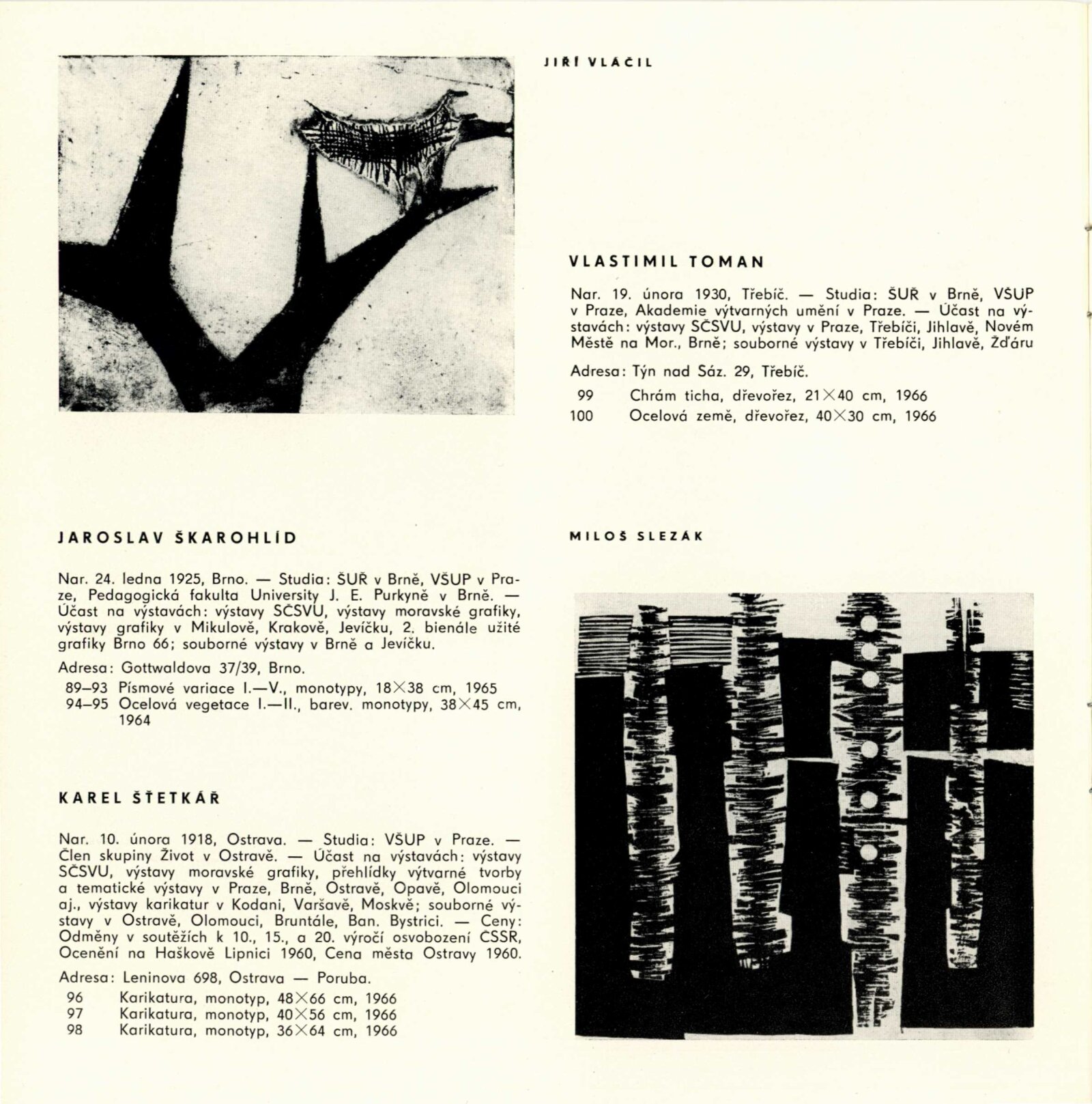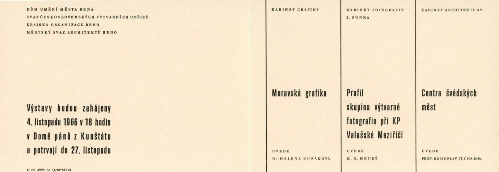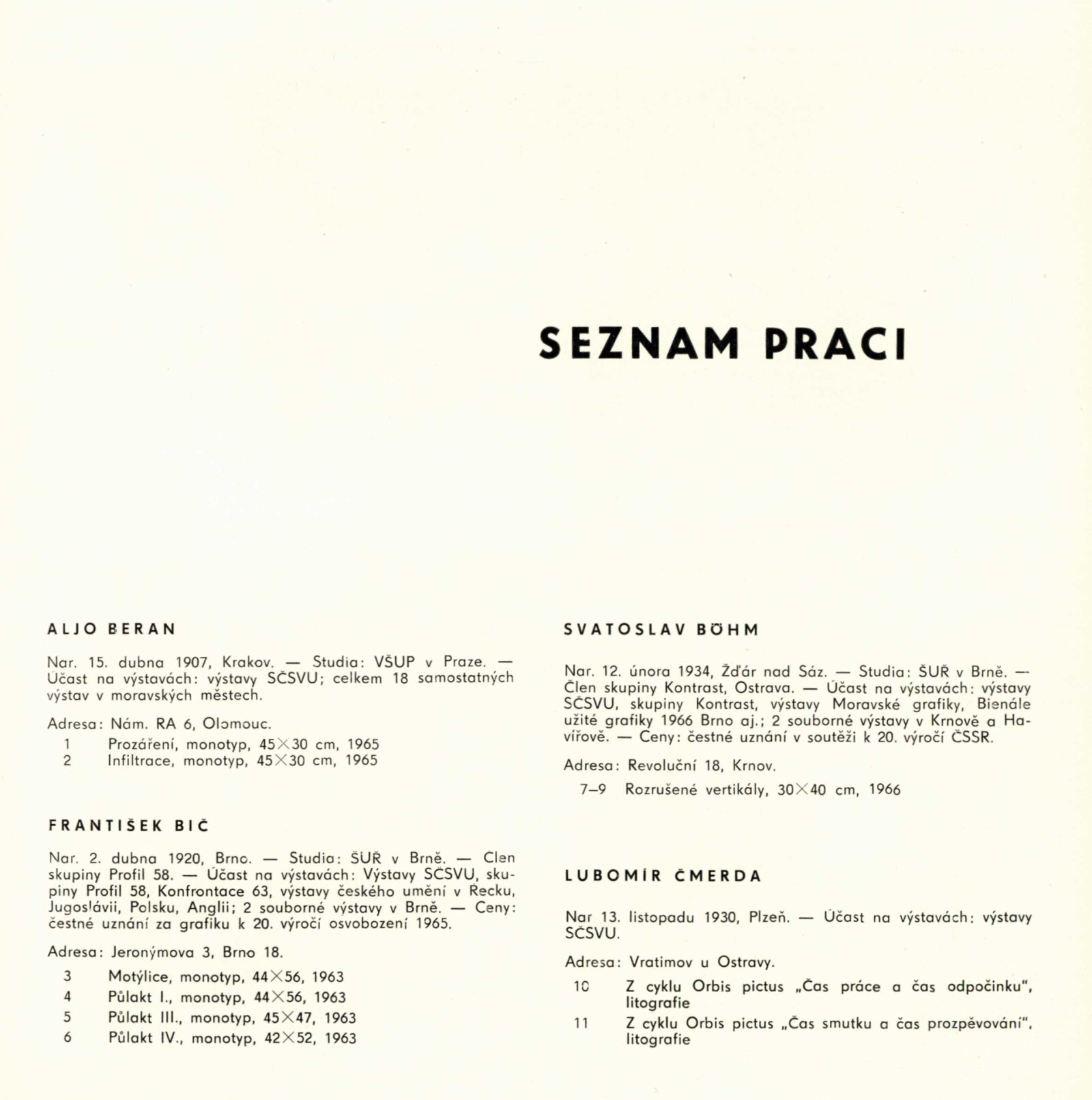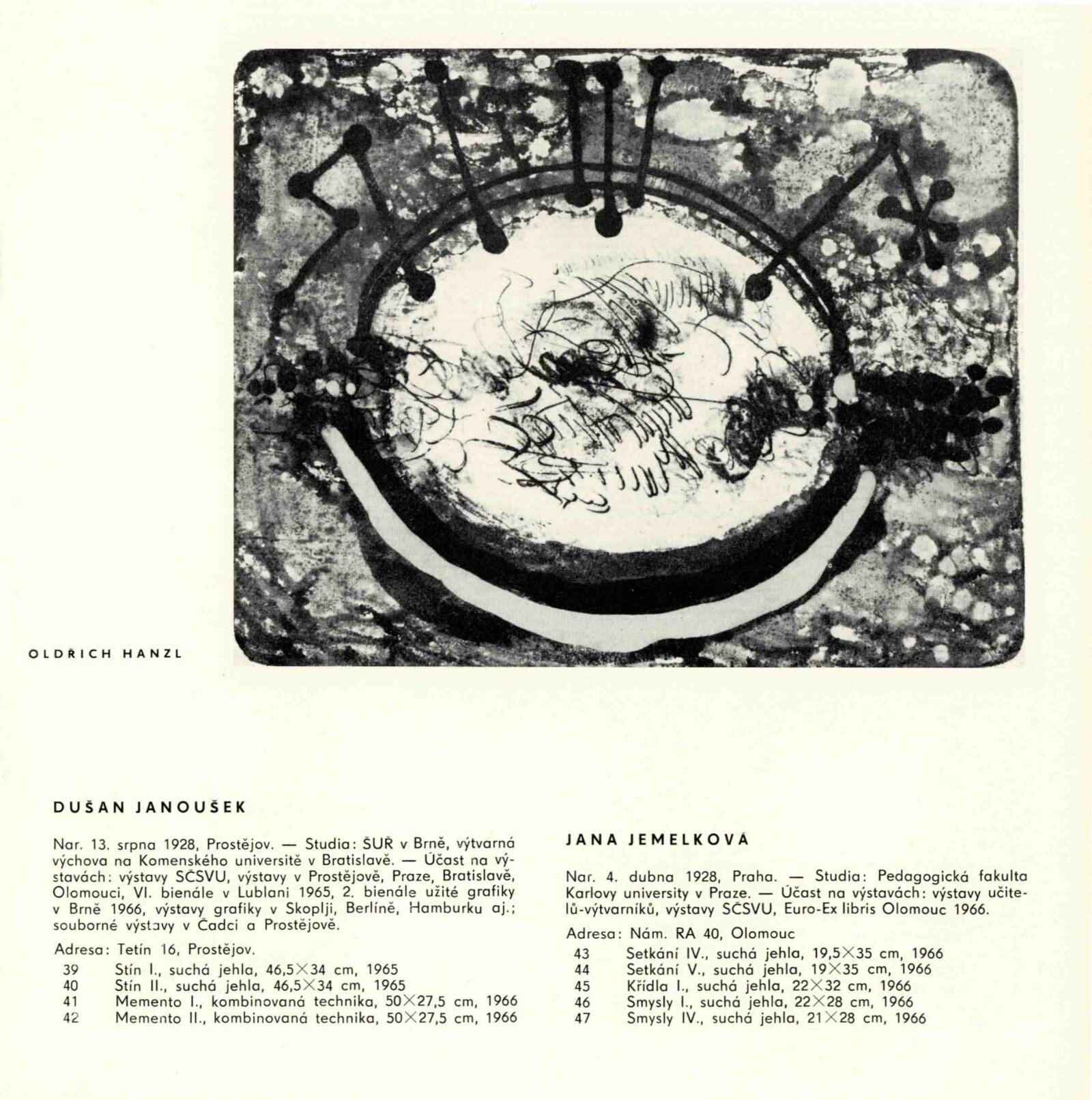 Pátá výstava moravské grafiky: Dům umění města Brna / Dům pánů z Kunštátu, 77. výstava Kabinetu grafiky, 4. 11. – 27. 11. 1966 / Text: Helena Kusáková-Knozová. – Brno: SČSVU, 1966. – 18 s., obr., životní data vystavujících, DPK 314. – MZK; MG