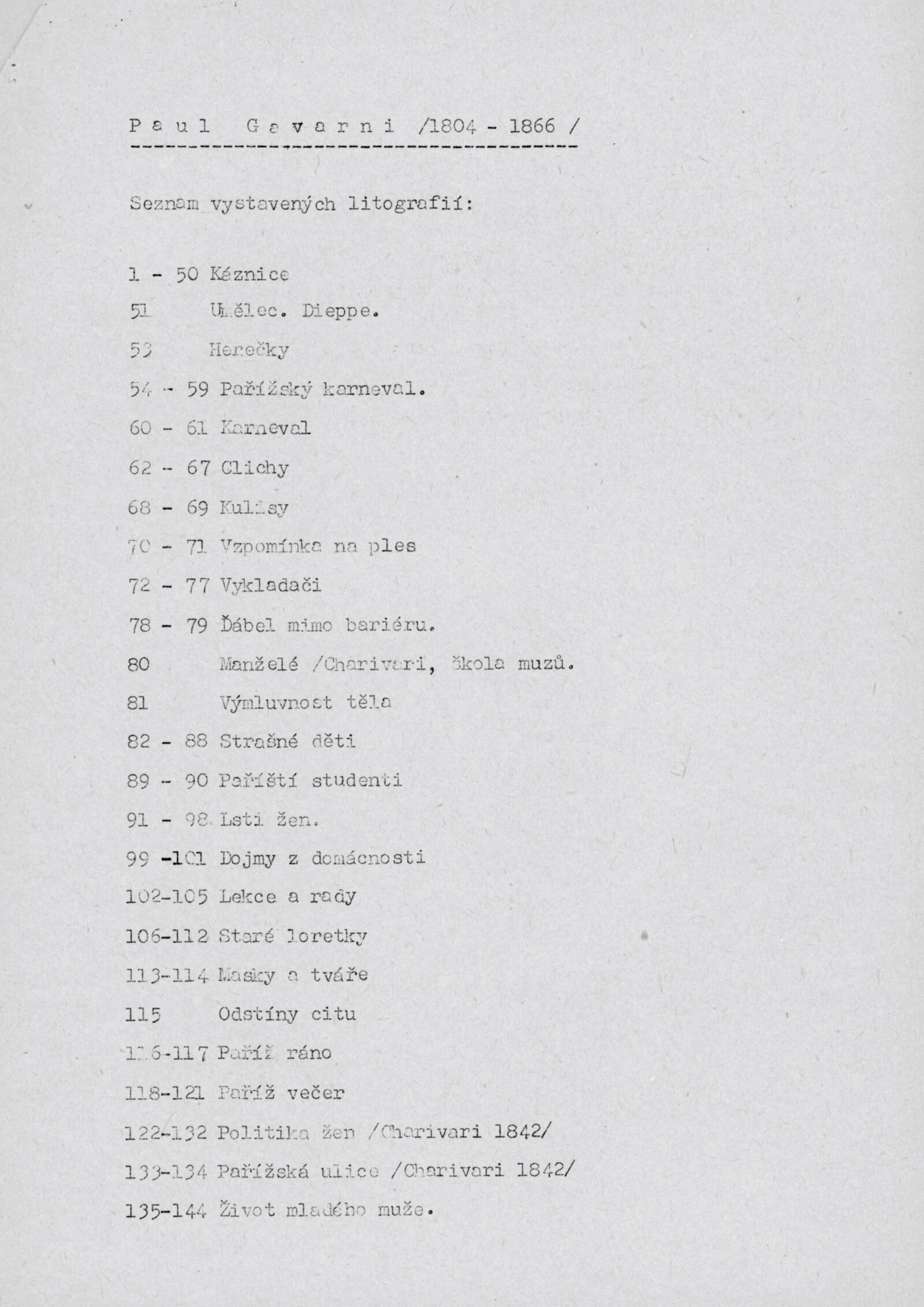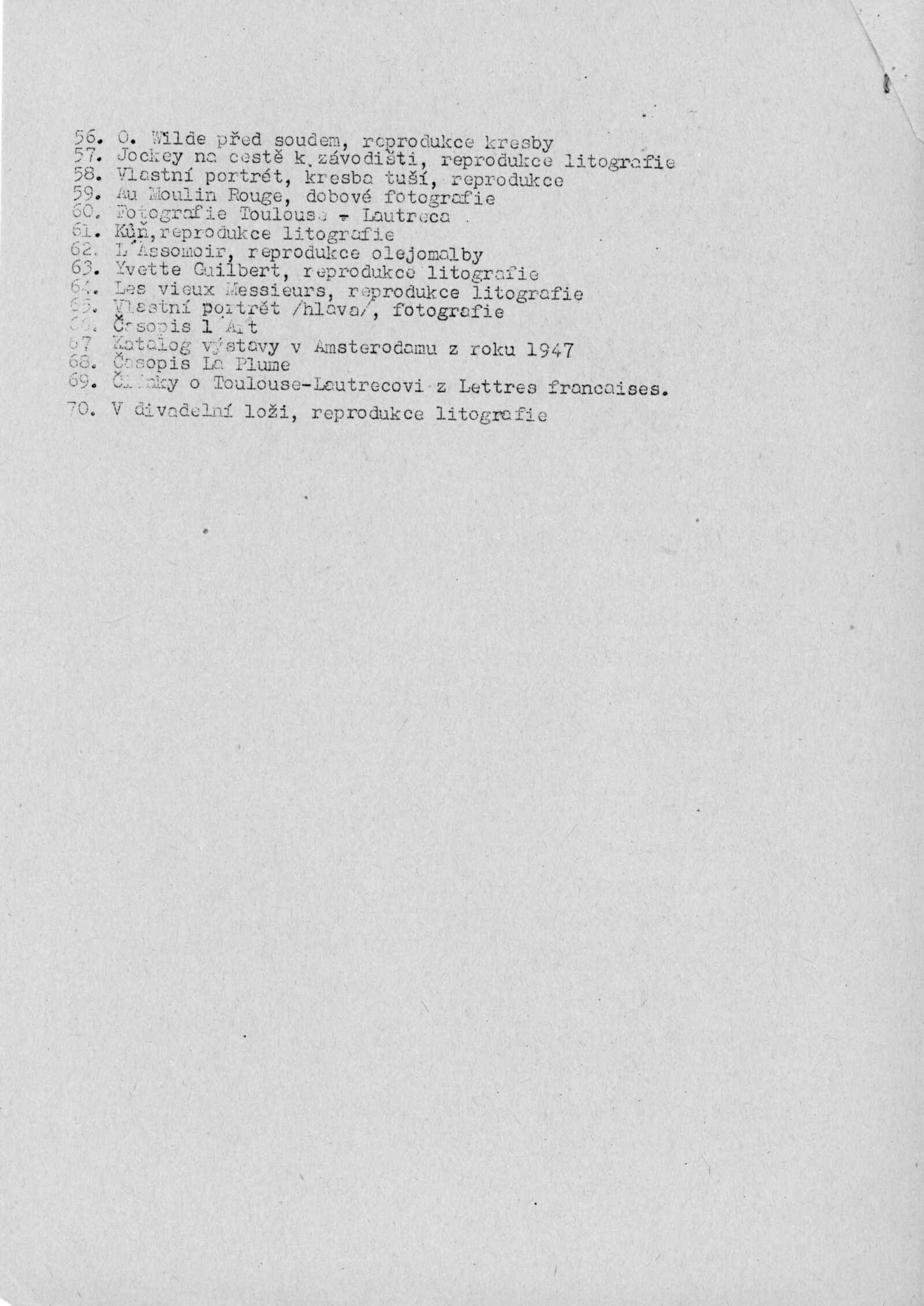 Paul Gavarni (1804–1866). Henri de Toulouse-Lautrec (1864–1901). Kresby a grafika: Dům umění města Brna, 4. 9. – 15. 10. 1955 / Převzatý katalog. Henri de Toulouse-Lautrec. Soubor původní grafiky: síň S. V. Purkyně v Praze, 21. 1. – 27. 2. 1955 / Text: Anna Masaryková. – Praha: Sdružení výtvarníků Purkyně, 1955. – 4 s., DU 225. – UPM