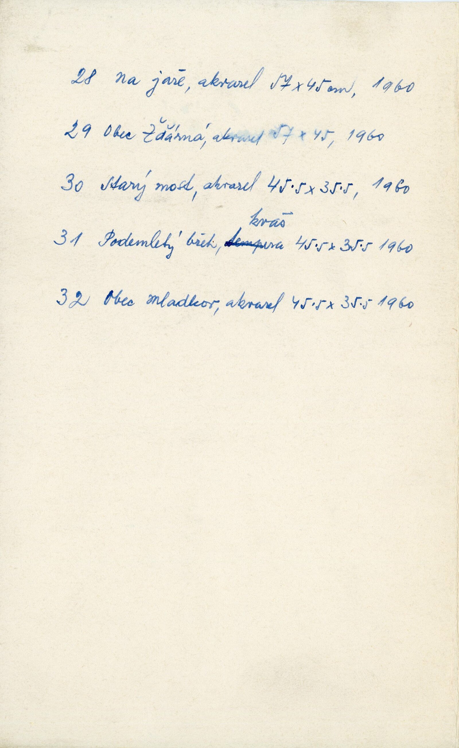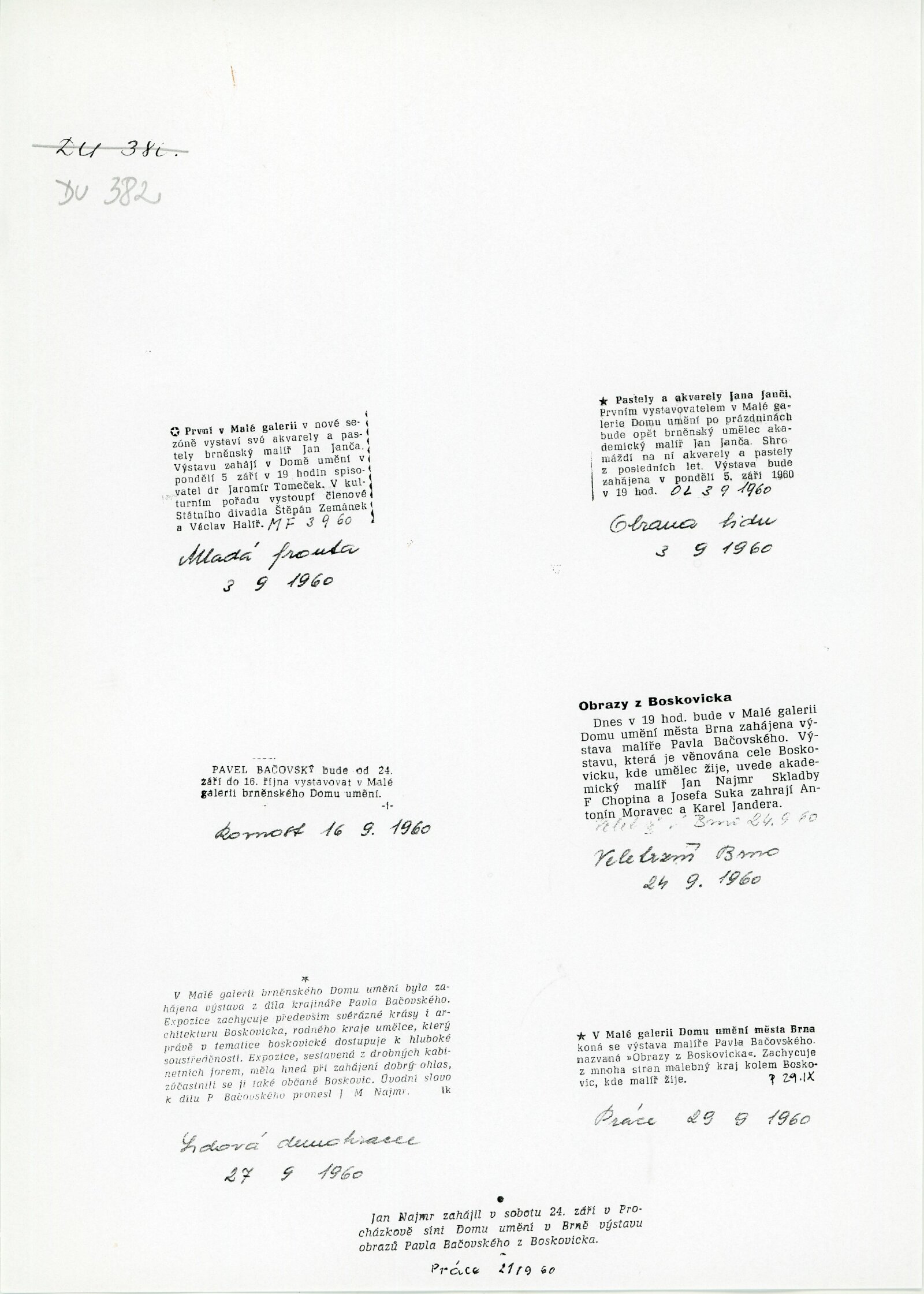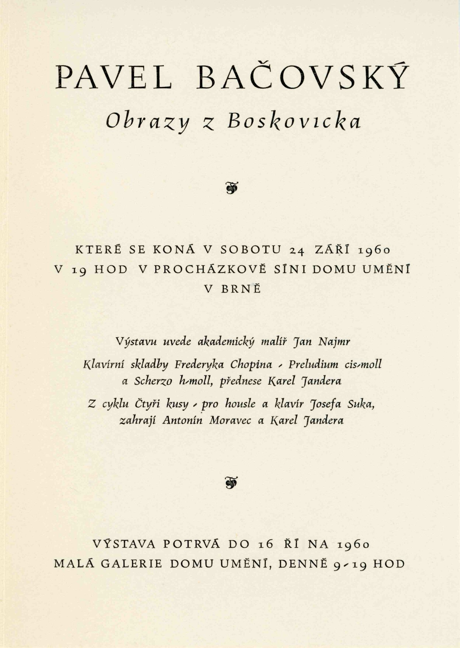 Pavel Bačovský. Obrazy z Boskovicka: Dům umění, Malá galerie, 24. 9. – 16. 10. 1960 / Text: Jan Najmr. – Brno: DUmB, 1960. – skládačka, 6 s., obr., DU 382. – MG; MMB