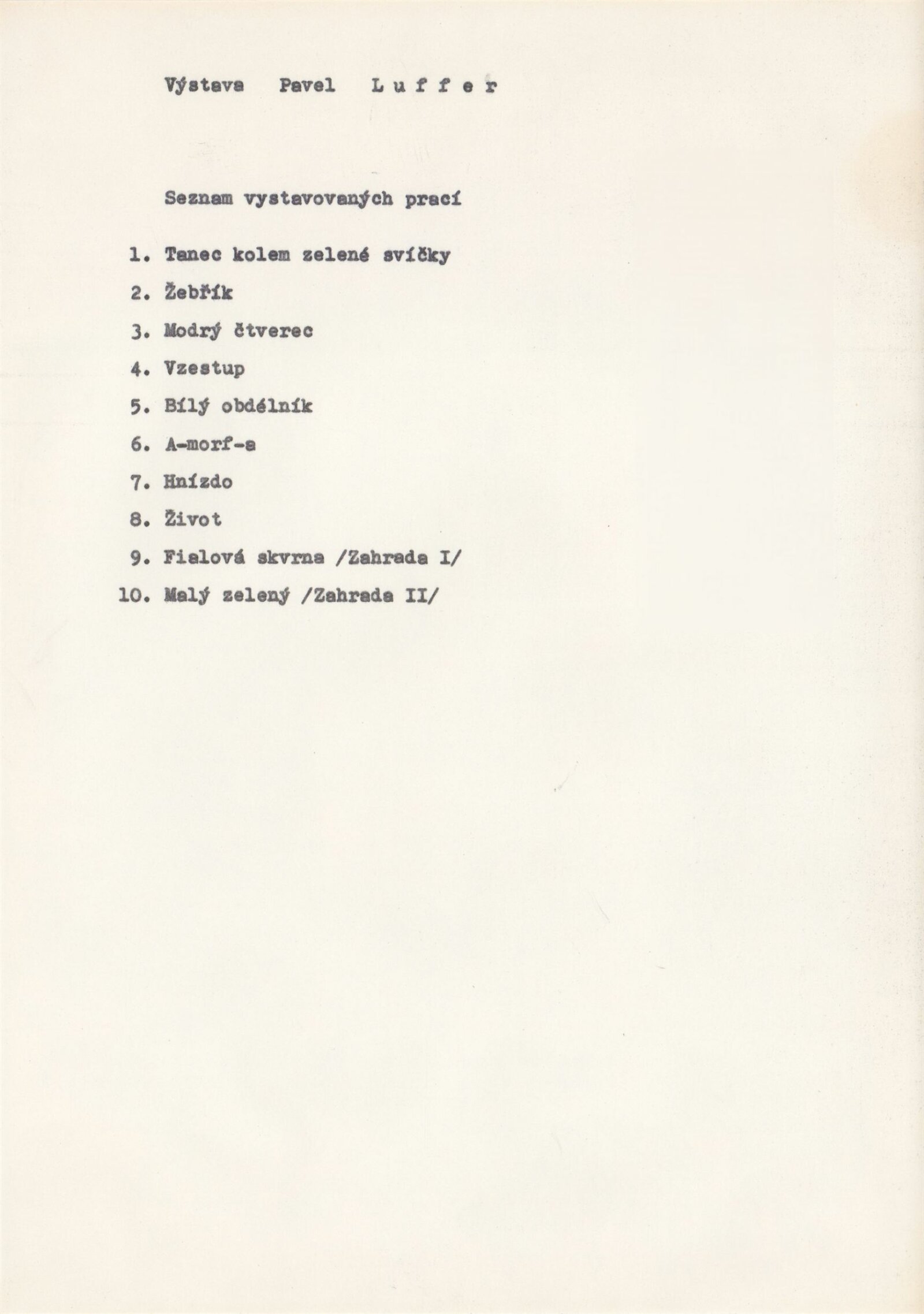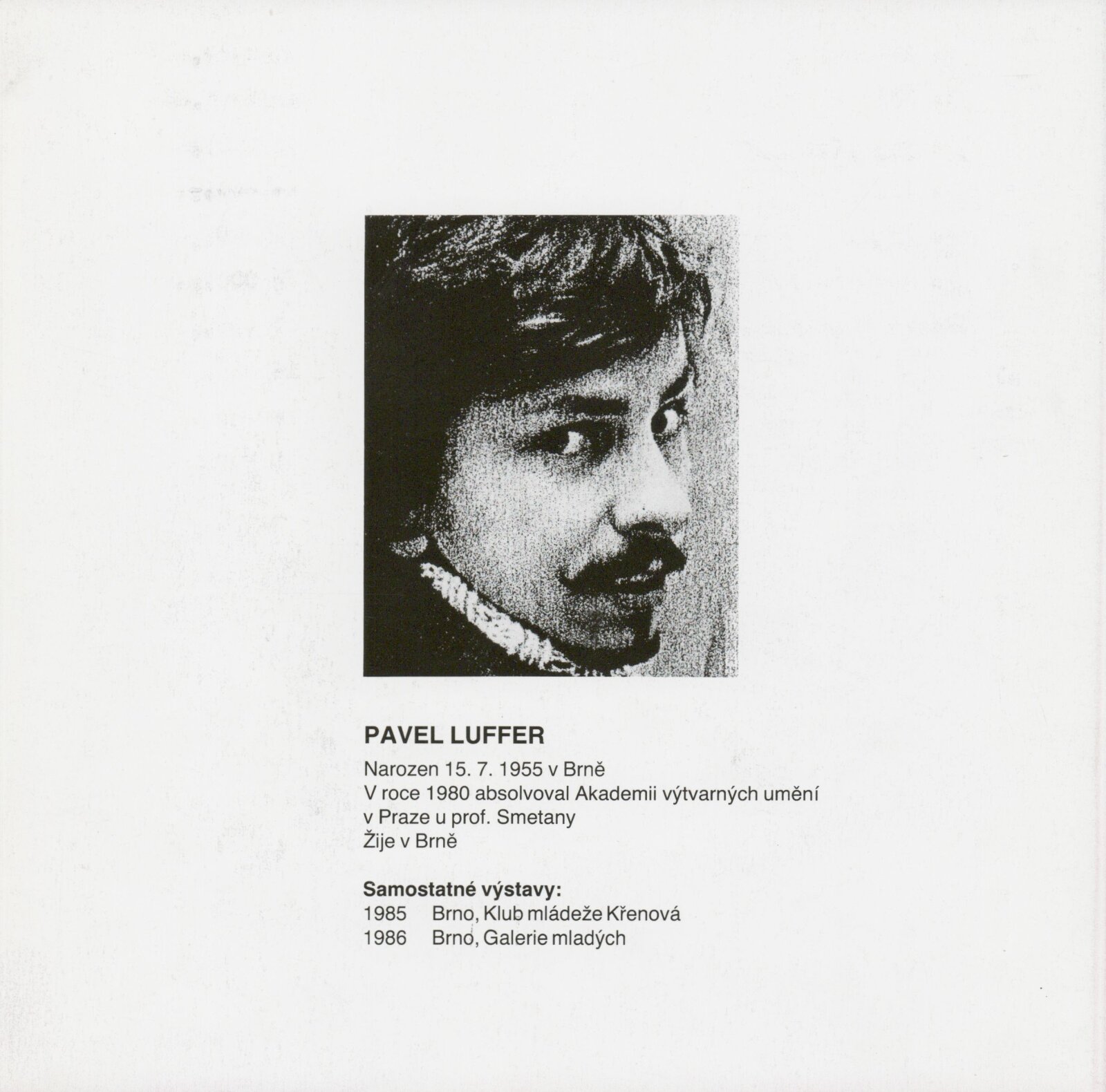 pozvánka, katalog, část strojopisu ke katalogu, seznam vystavených děl, korespondence, smlouva o uspořádání výstavy, žádost o výstavu, recenze v tisku, katalog z výstavy P. Luffera v Galerii mladých při MKS v Brně (1986)
