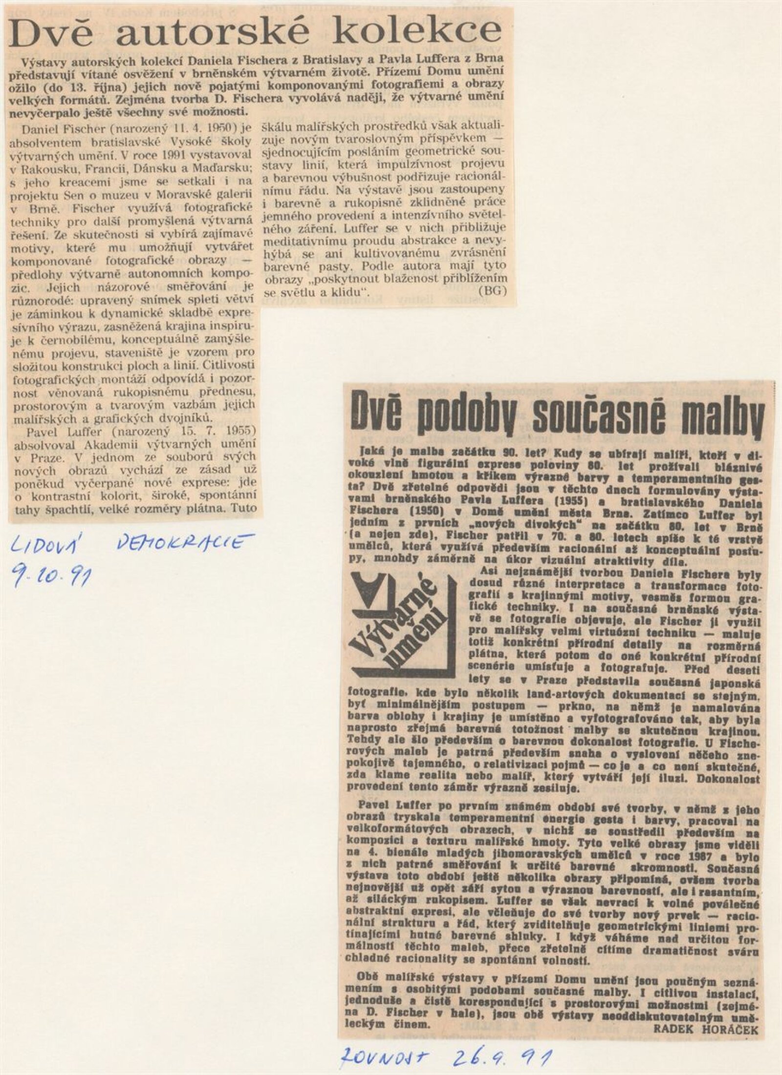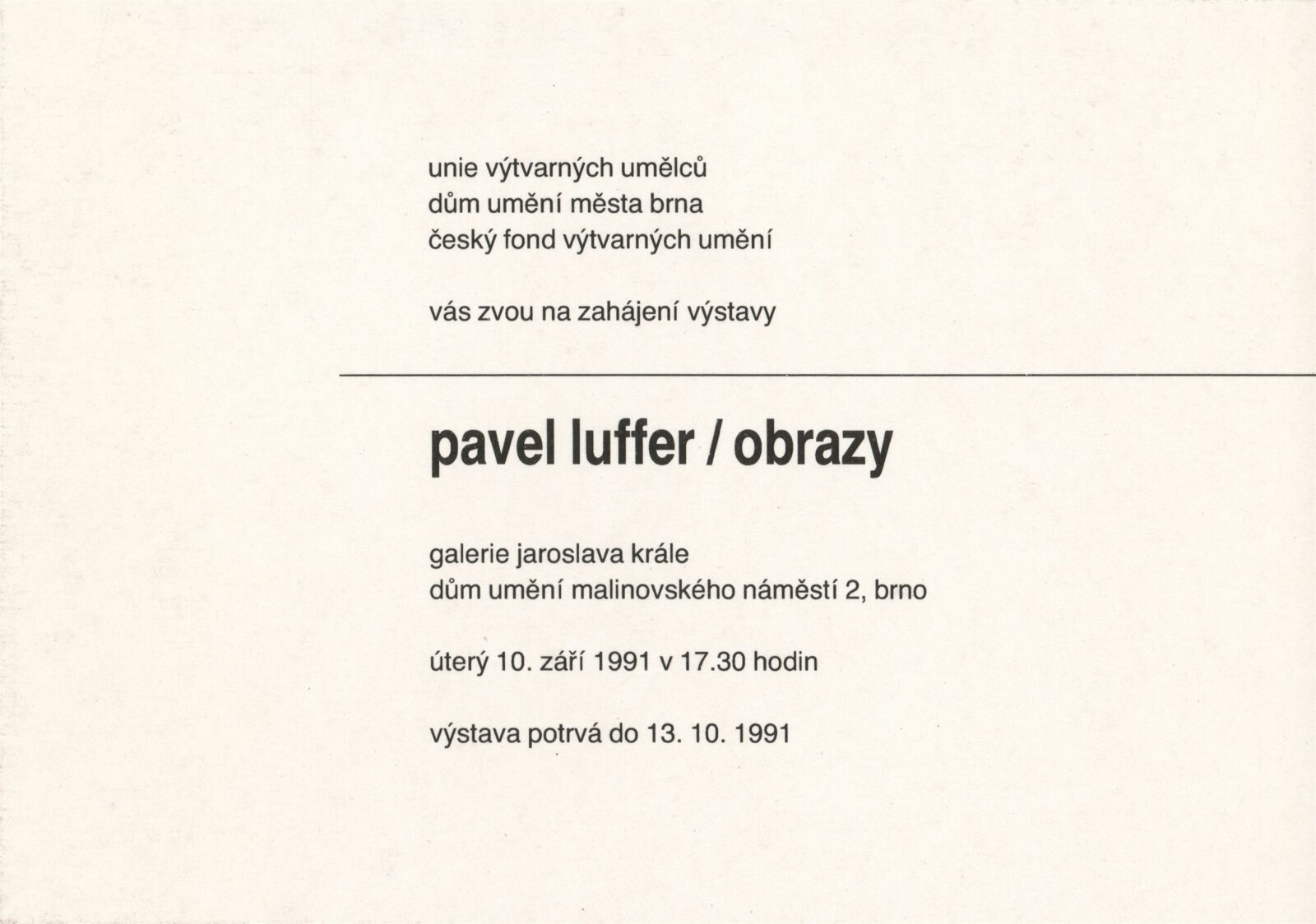Pavel Luffer. Obrazy: Dům umění měst Brna, 163. výstava v Galerii Jaroslava Krále, 10. 9. – 13. 10. 1991 / Text: autor. – Brno: ČFVU-Dílo, 1991. – skládačka (6 s., obr.), DU 908
