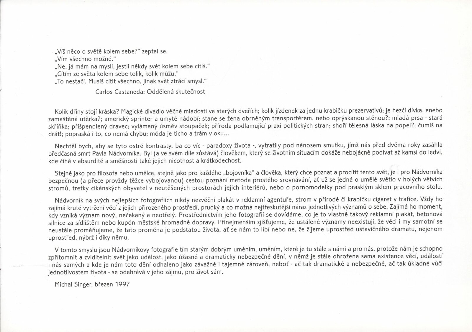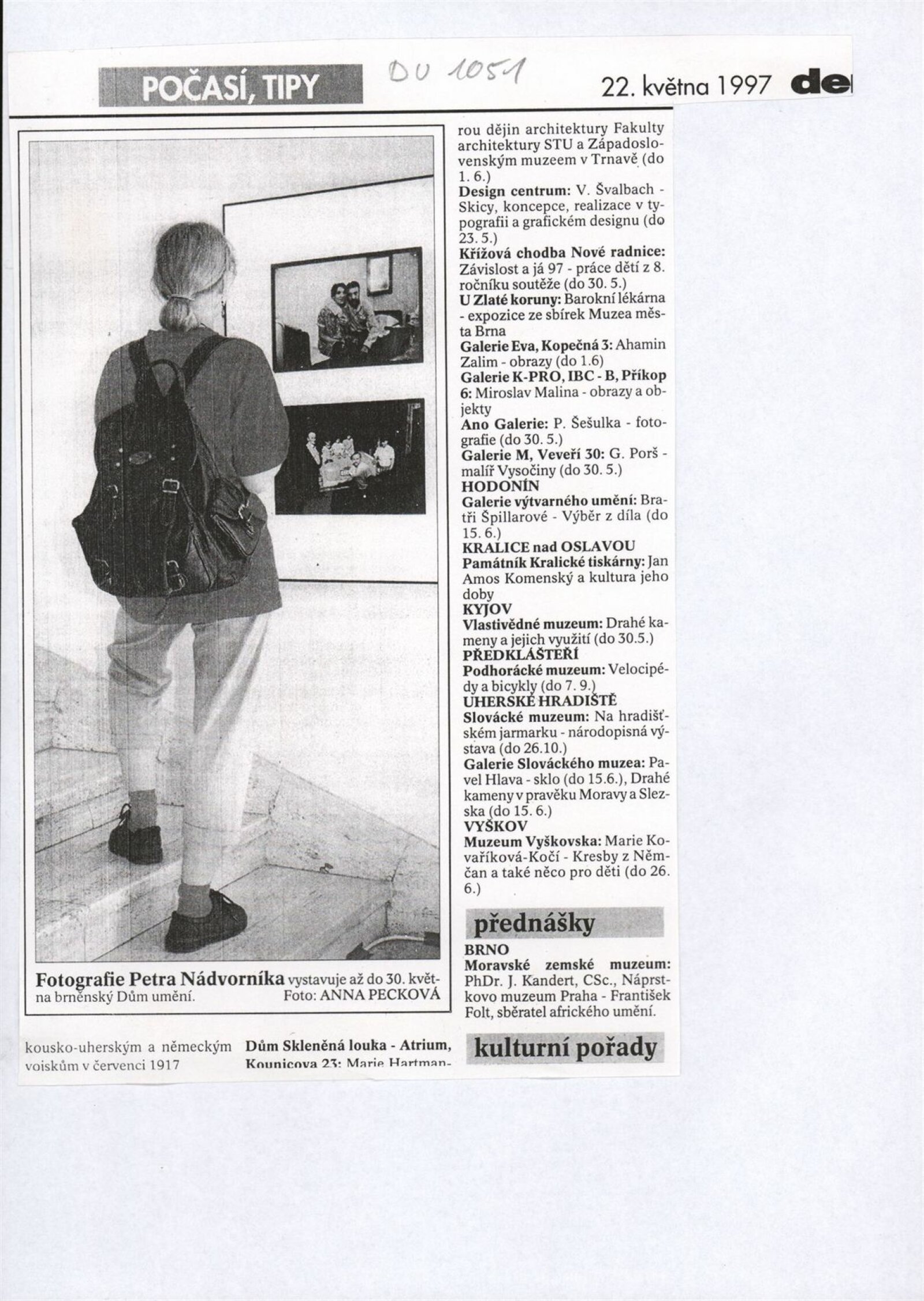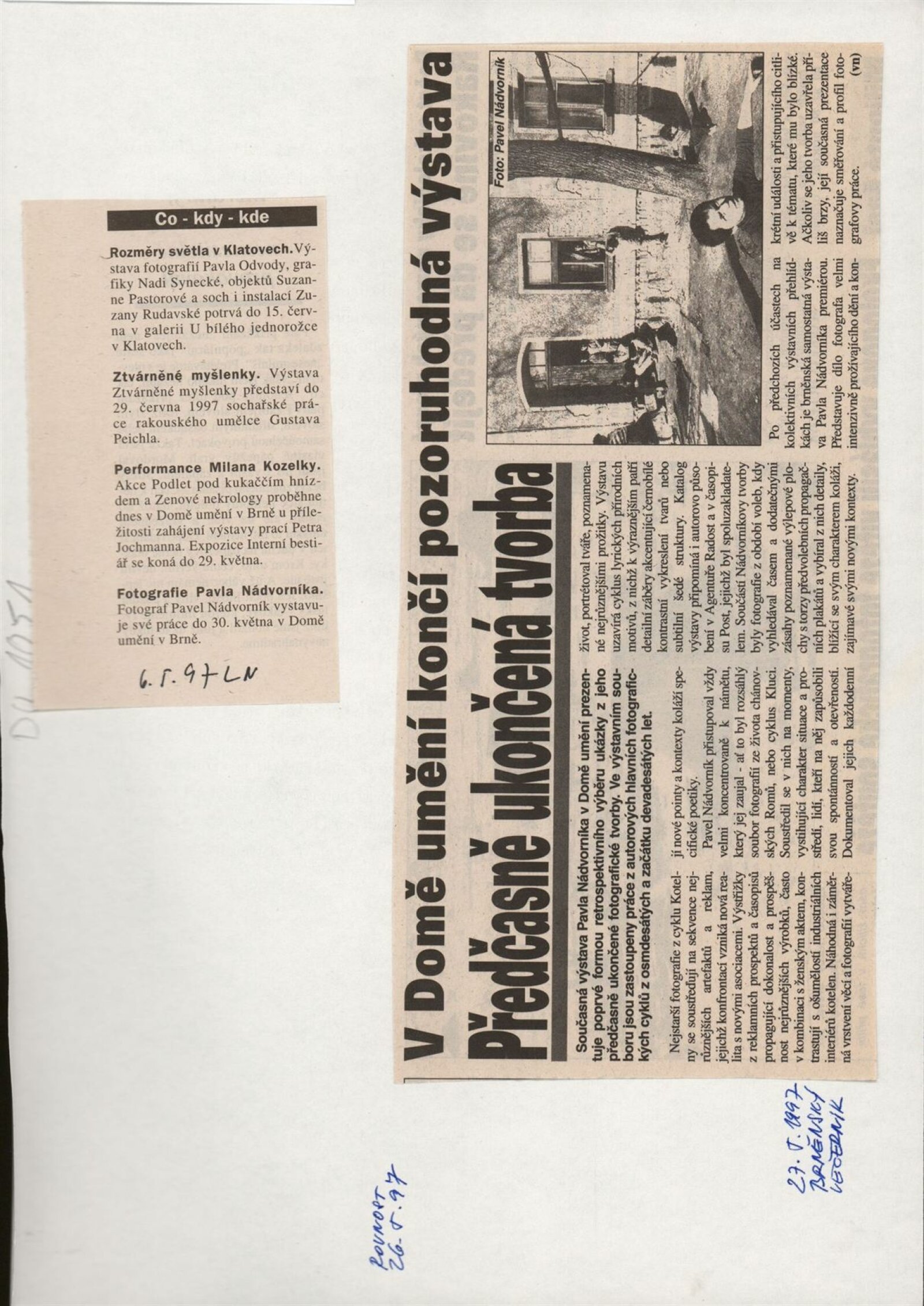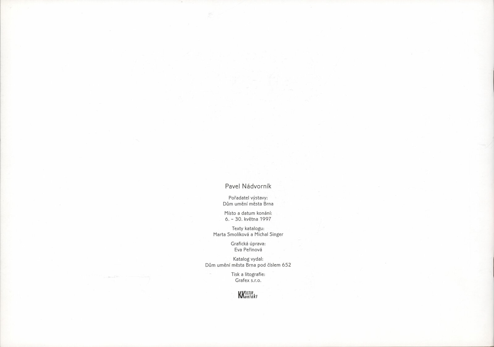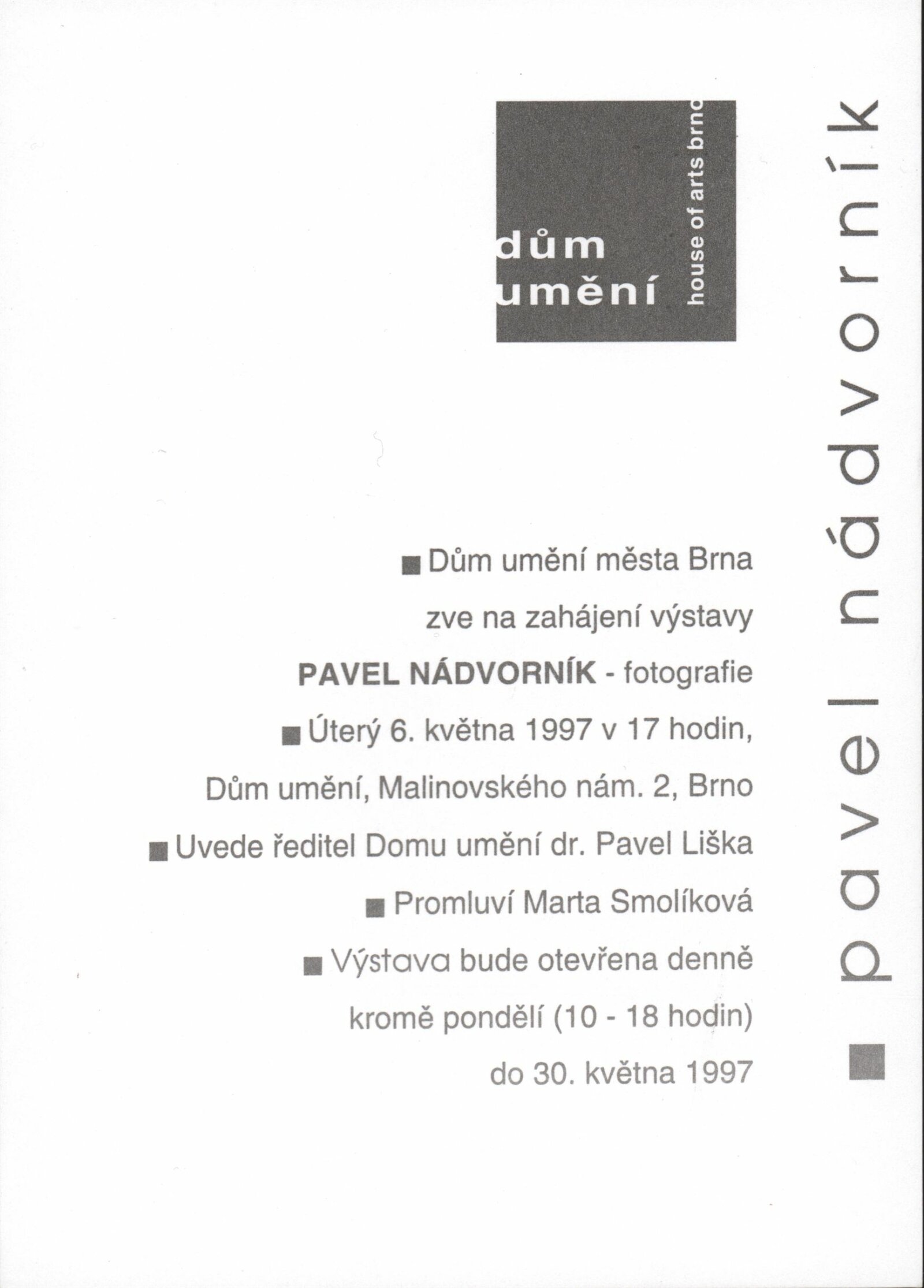 Pavel Nádvorník. Fotografie: Dům umění města Brna, hala, 6. 5. – 30. 5. 1997 / Text: Michal Singer, Marta Smolíková. – Brno: DUmB, 1997. – [16] s., obr., životní data, výstavy, bibliografie, DU 1051. – MZK