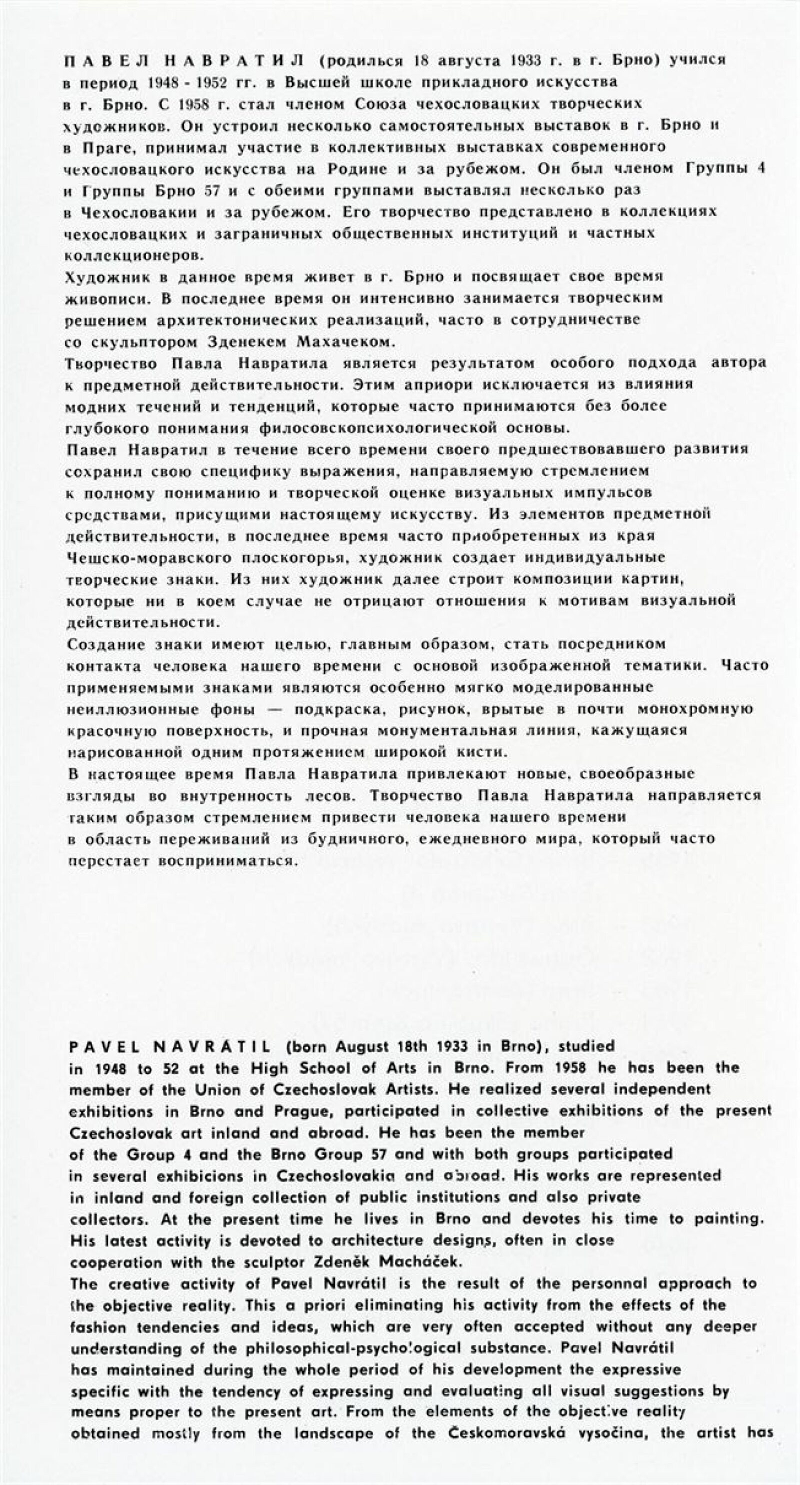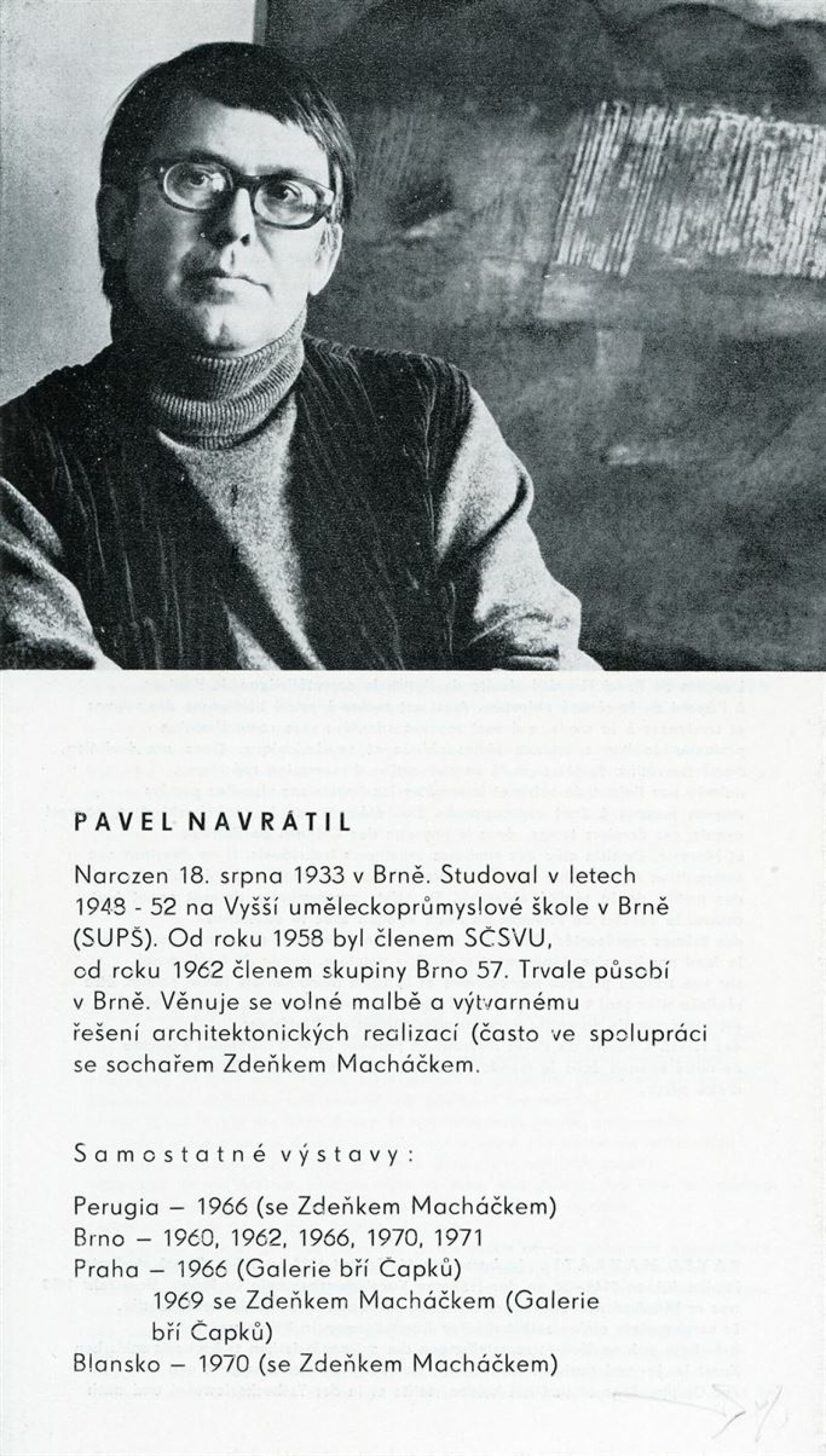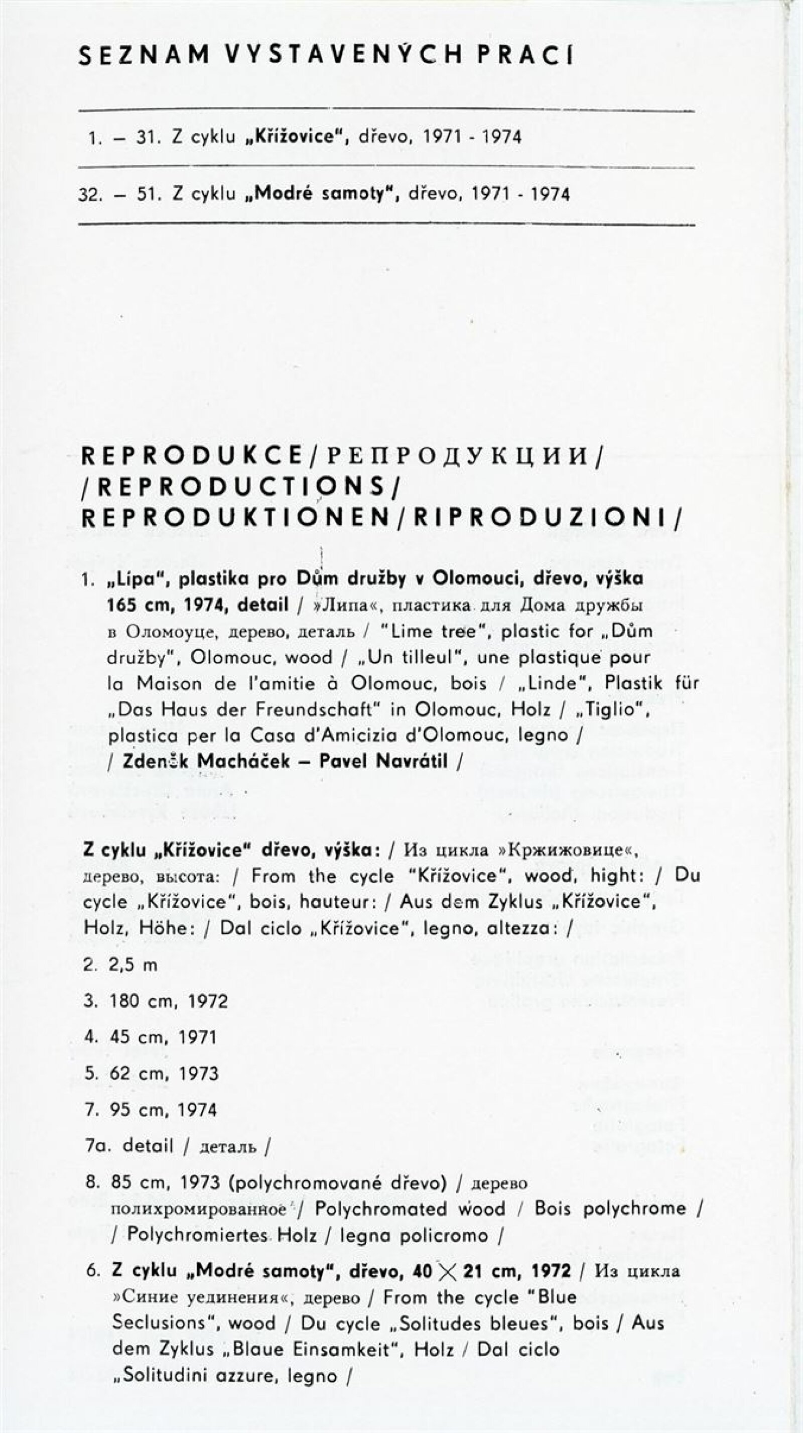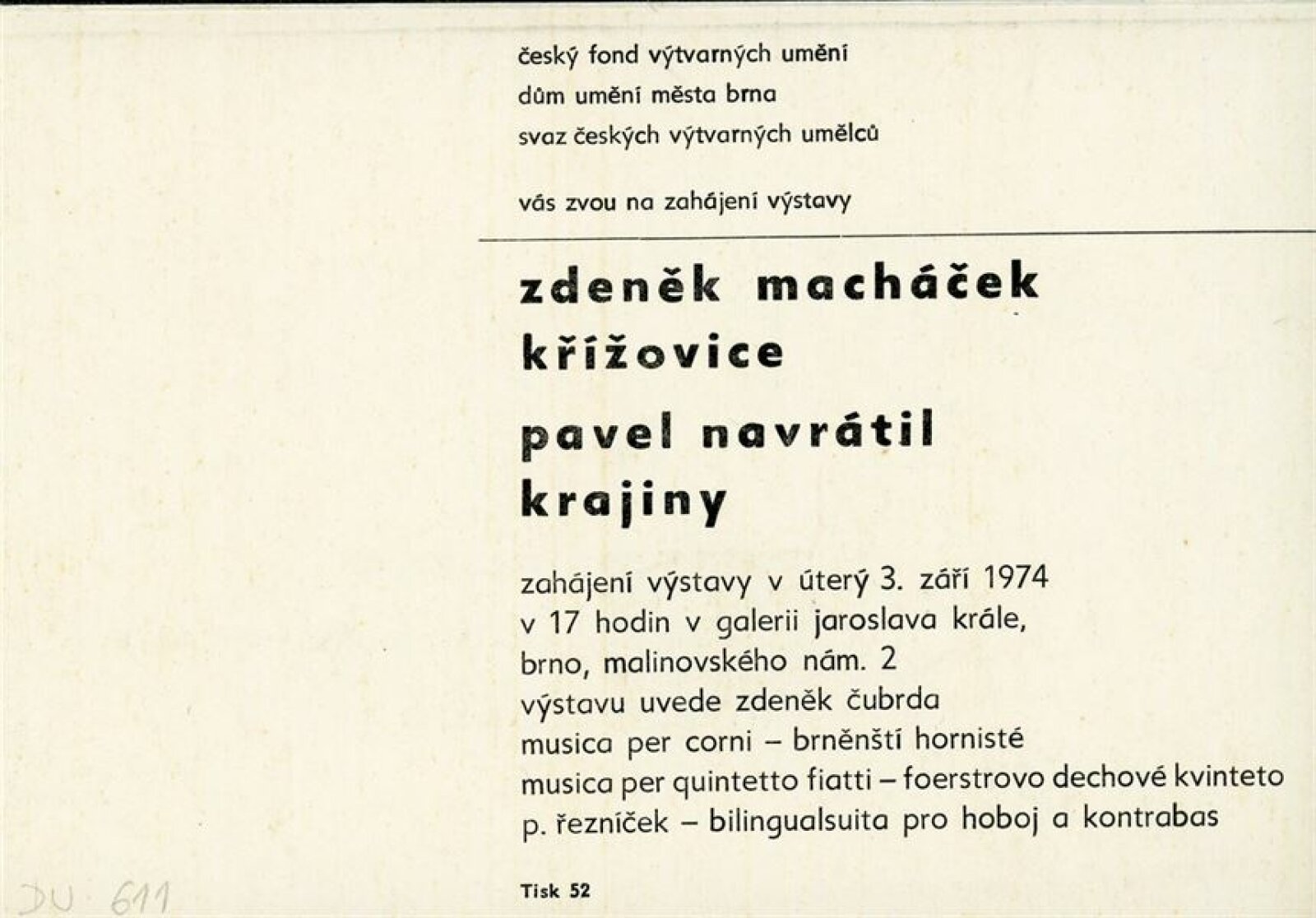 Zdeněk Macháček: Křížovice, Pavel Navrátil: Krajiny: Dům umění, 60. výstava v Galerii Jaroslava Krále, 3. 9. – 22. 9. 1974 / Text: Zdeněk Čubrda. – Brno: ČFVU, 1974. – 13 s., obr., portrét, životní data, výstavy, DU 611. – MZK; MMB / Pavel Navrátil. Krajiny: Dům umění, 60. výstava v Galerii Jaroslava Krále, 3. 9. – 22. 9. 1974 / Text: Zdeněk Čubrda. – Brno: ČFVU, 1974. – 14 s., obr., portrét, životní data, výstavy, DU 611. – MZK