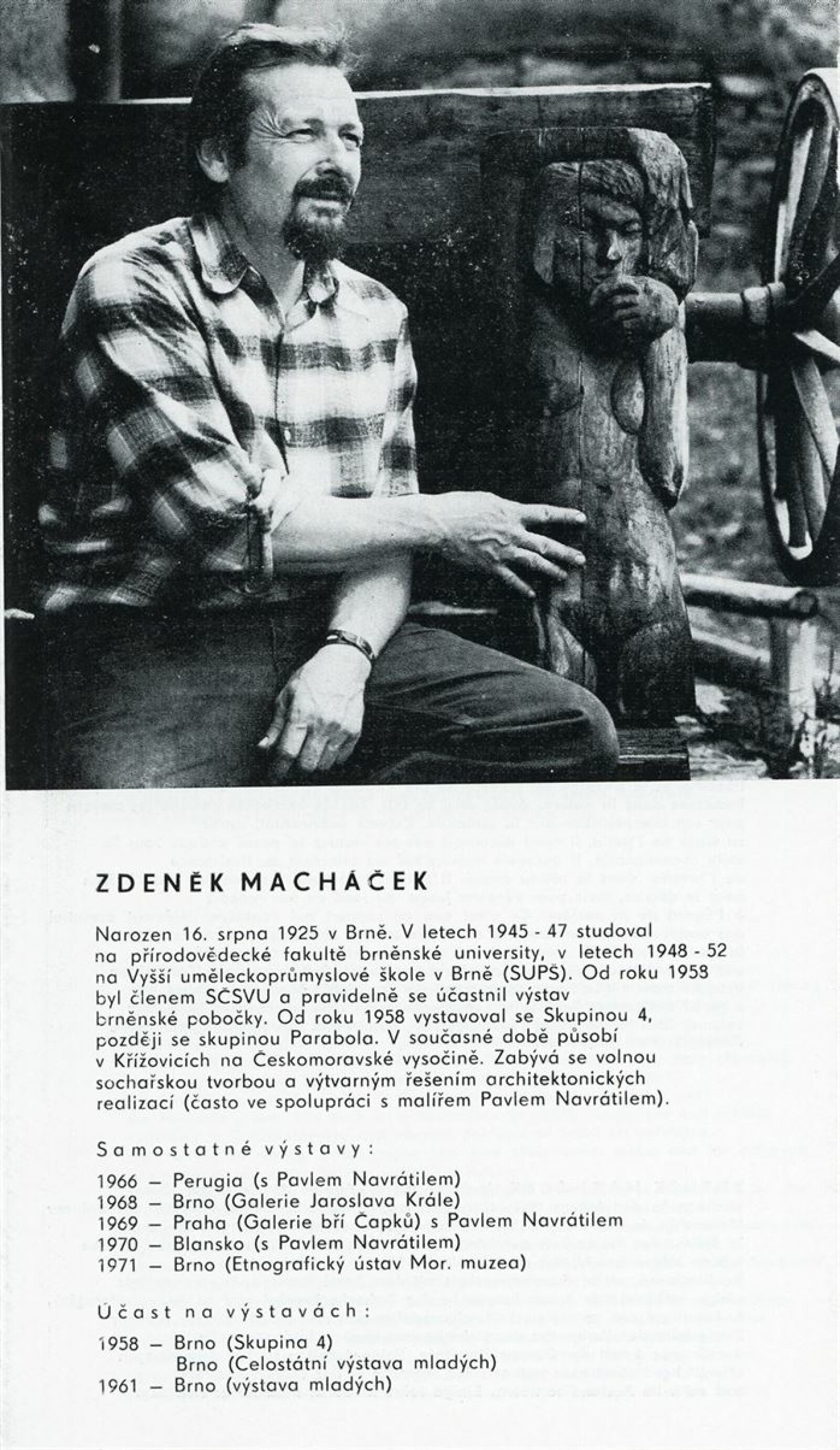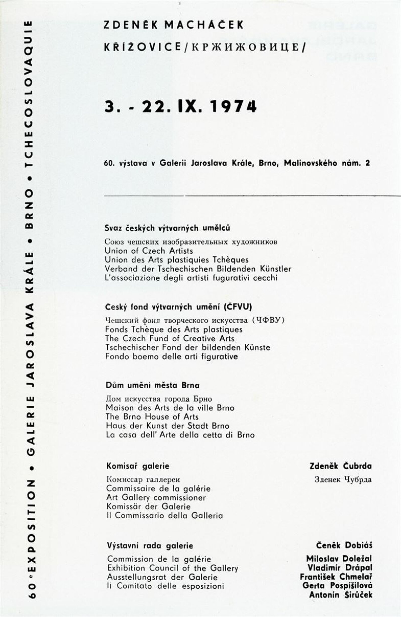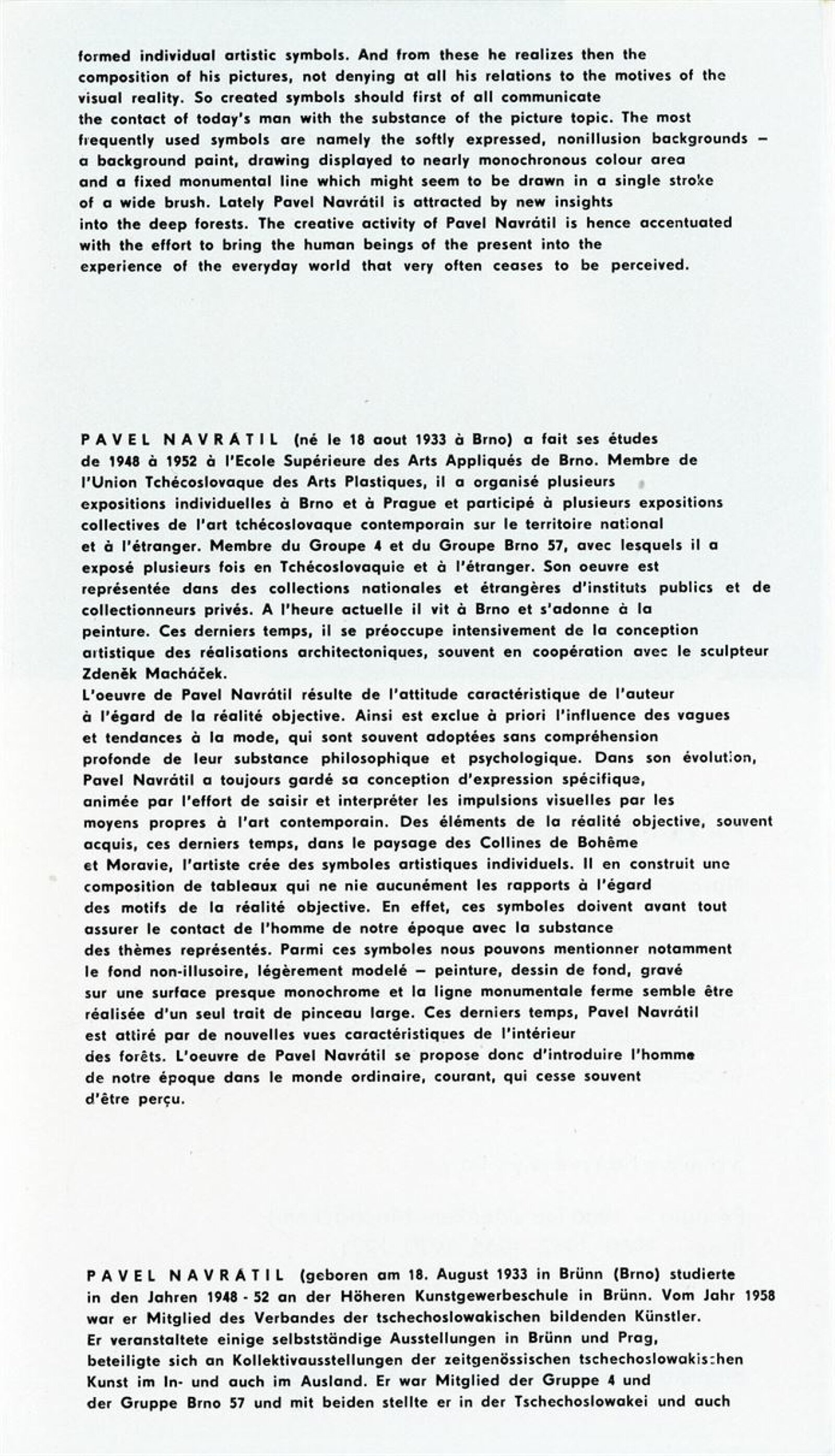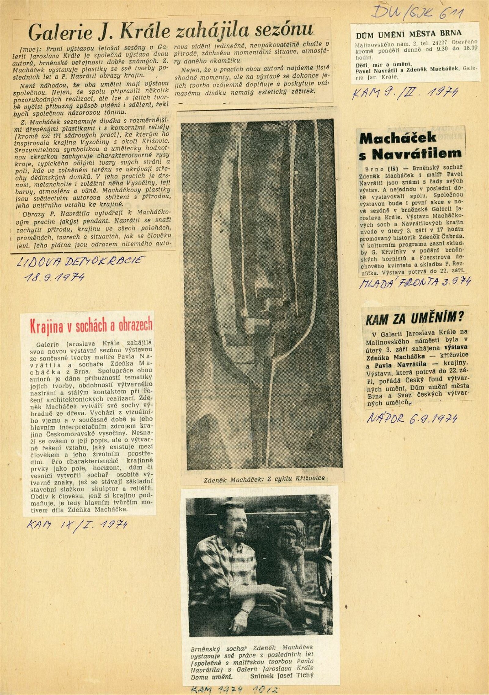 Zdeněk Macháček: Křížovice, Pavel Navrátil: Krajiny: Dům umění, 60. výstava v Galerii Jaroslava Krále, 3. 9. – 22. 9. 1974 / Text: Zdeněk Čubrda. – Brno: ČFVU, 1974. – 13 s., obr., portrét, životní data, výstavy, DU 611. – MZK; MMB / Pavel Navrátil. Krajiny: Dům umění, 60. výstava v Galerii Jaroslava Krále, 3. 9. – 22. 9. 1974 / Text: Zdeněk Čubrda. – Brno: ČFVU, 1974. – 14 s., obr., portrét, životní data, výstavy, DU 611. – MZK