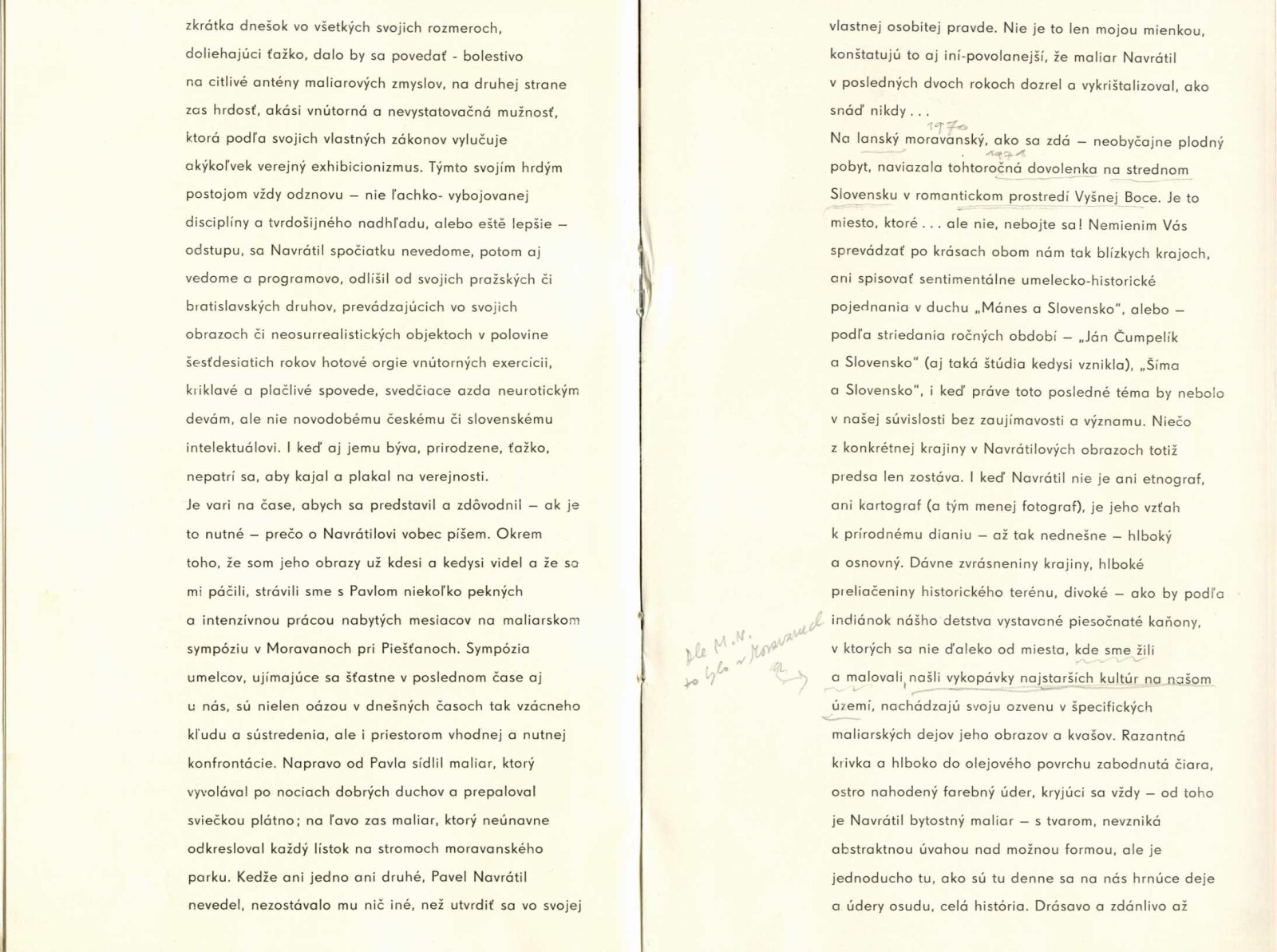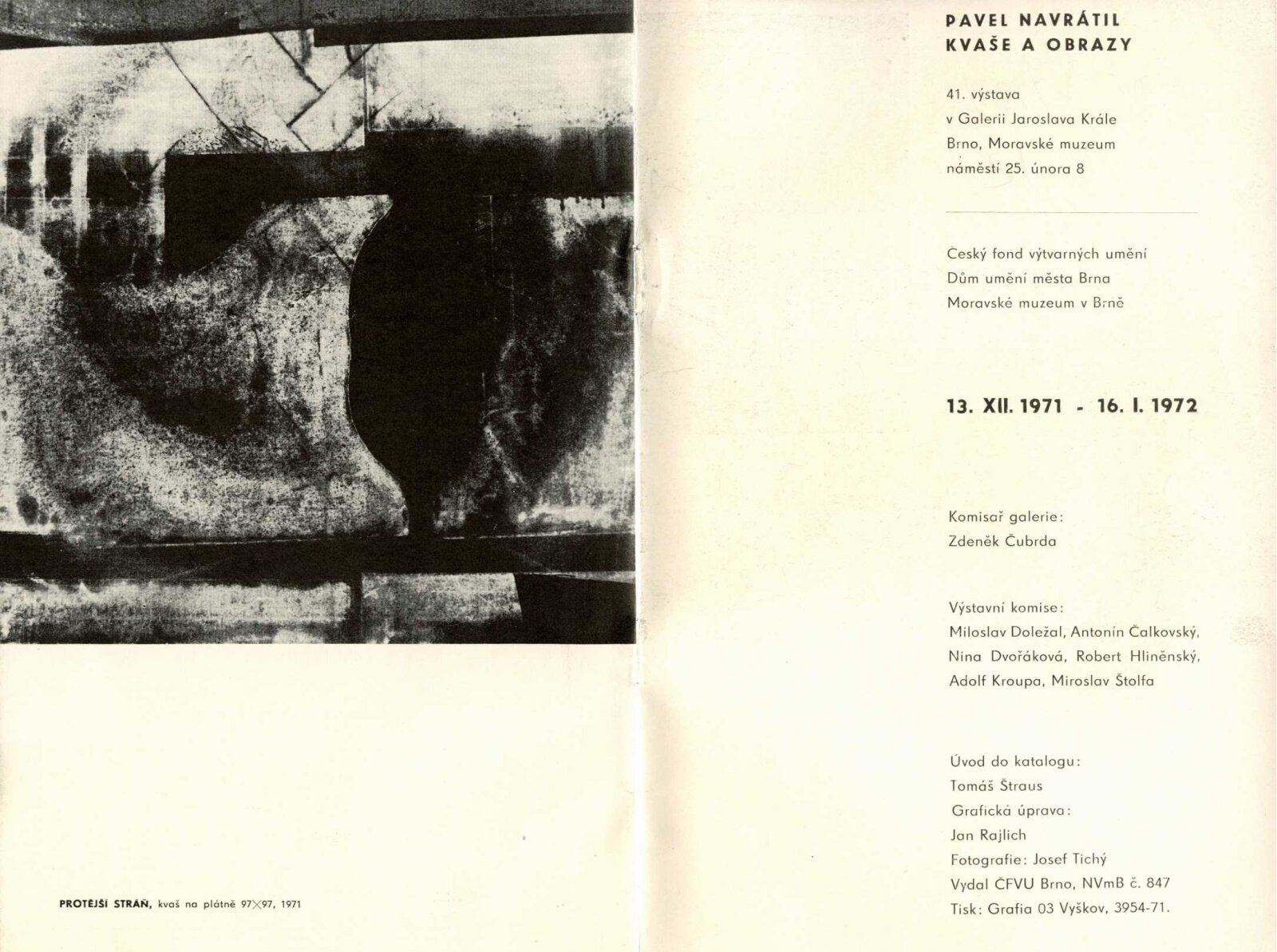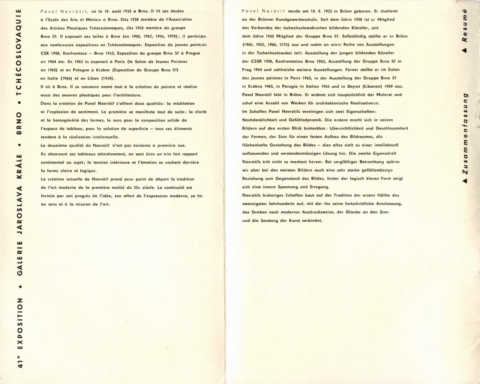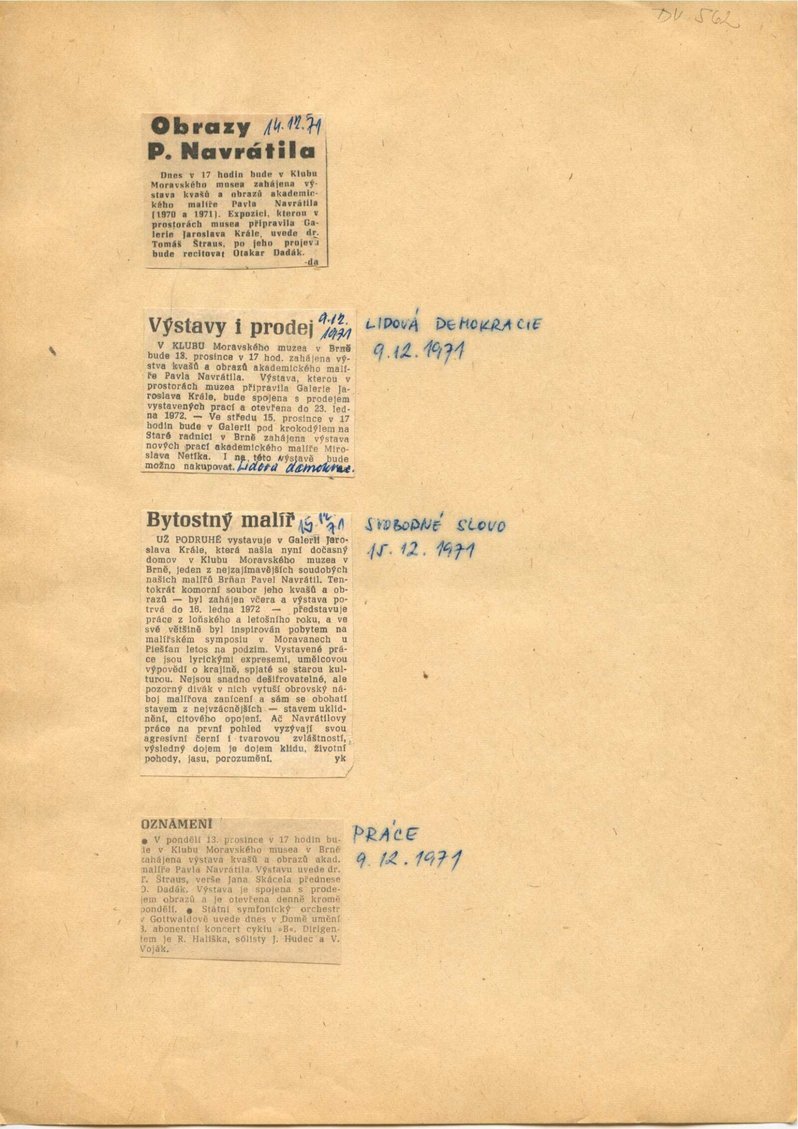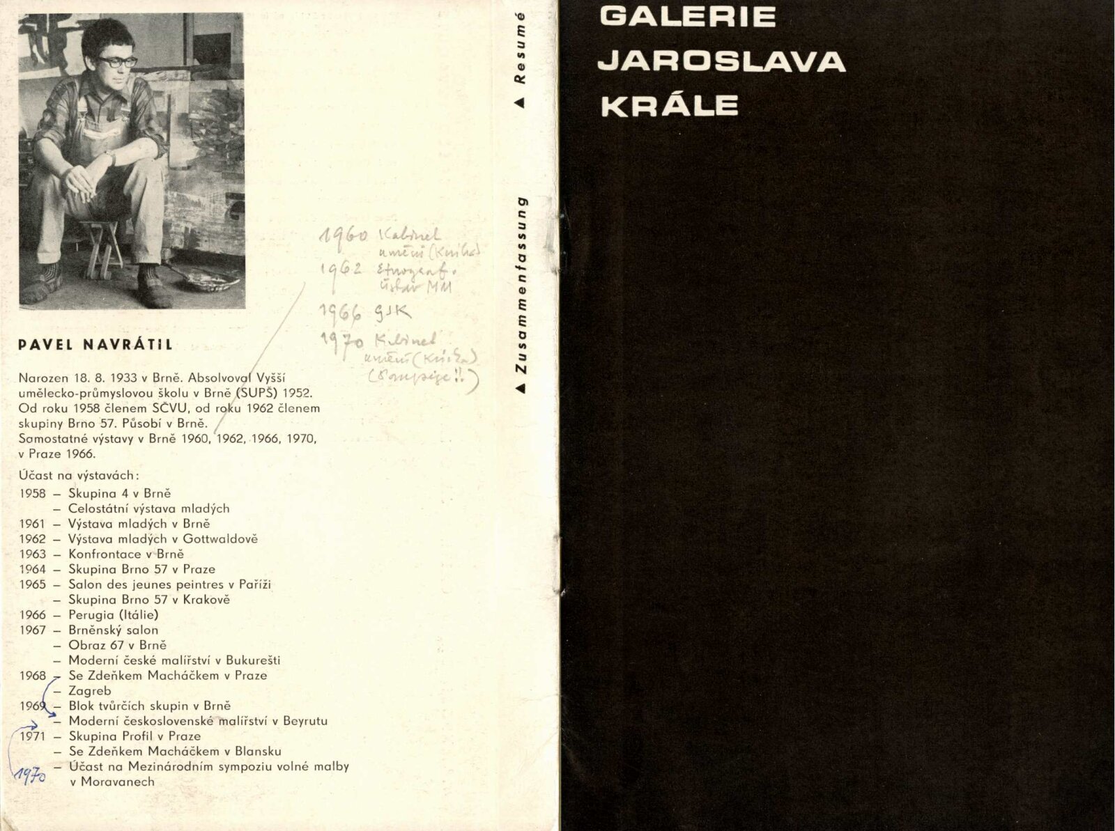 Pavel Navrátil. Kvaše a obrazy: Dům umění, 41. výstava v Galerii Jaroslava Krále a Moravské muzeum, 13. 12. 1971 – 16. 2. 1972 / Text: Tomáš Štraus. – Brno: ČFVU, 1971. – 11 s., obr., portrét, životní data, výstavy, DU 562. – MG; MMB