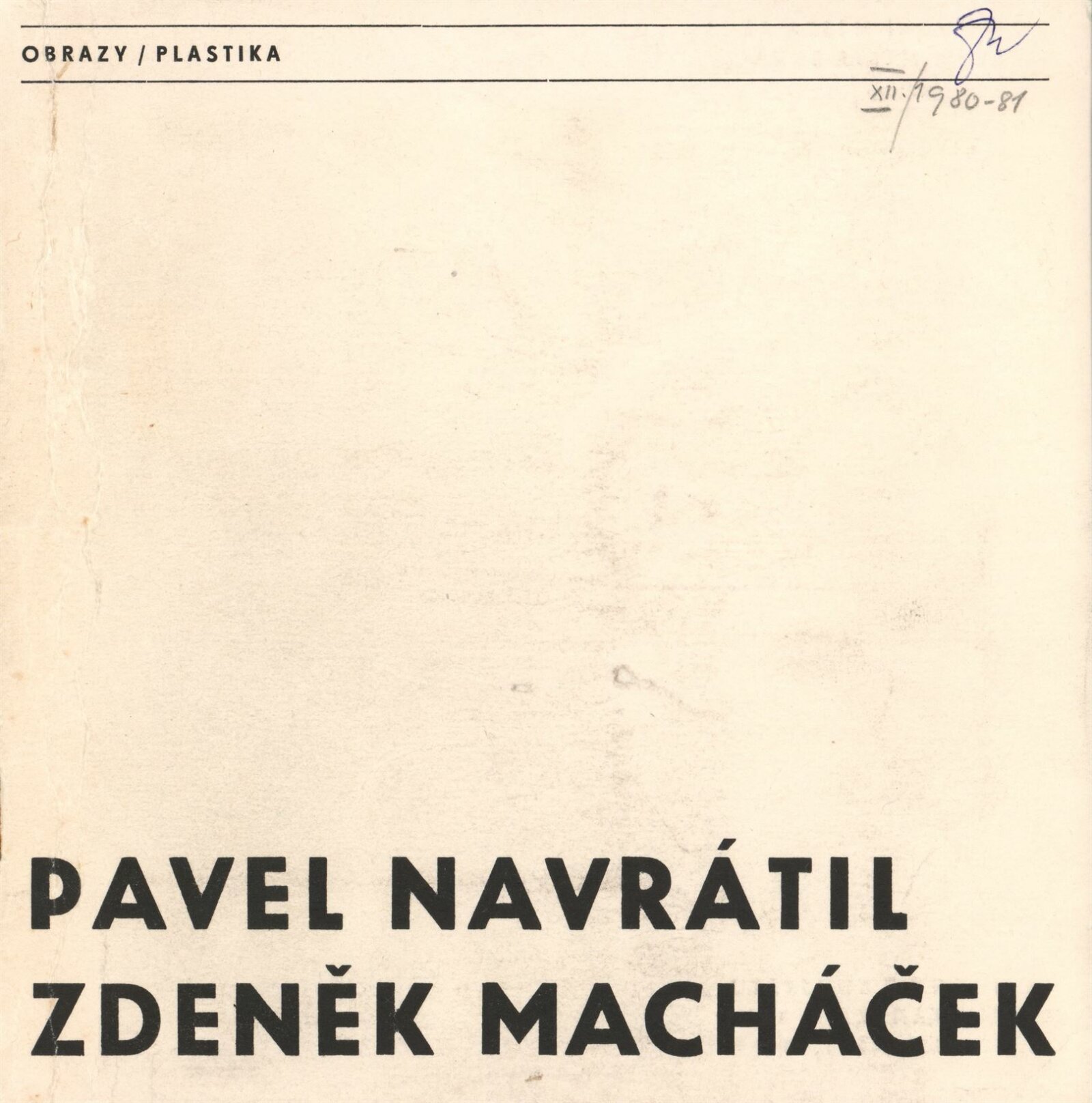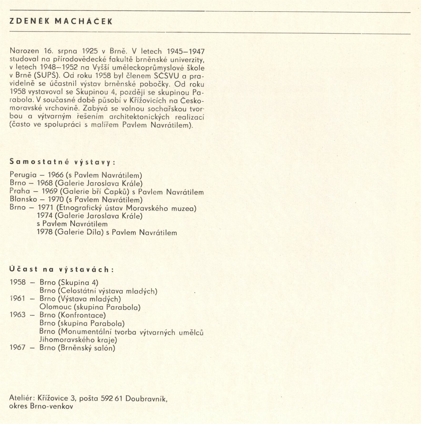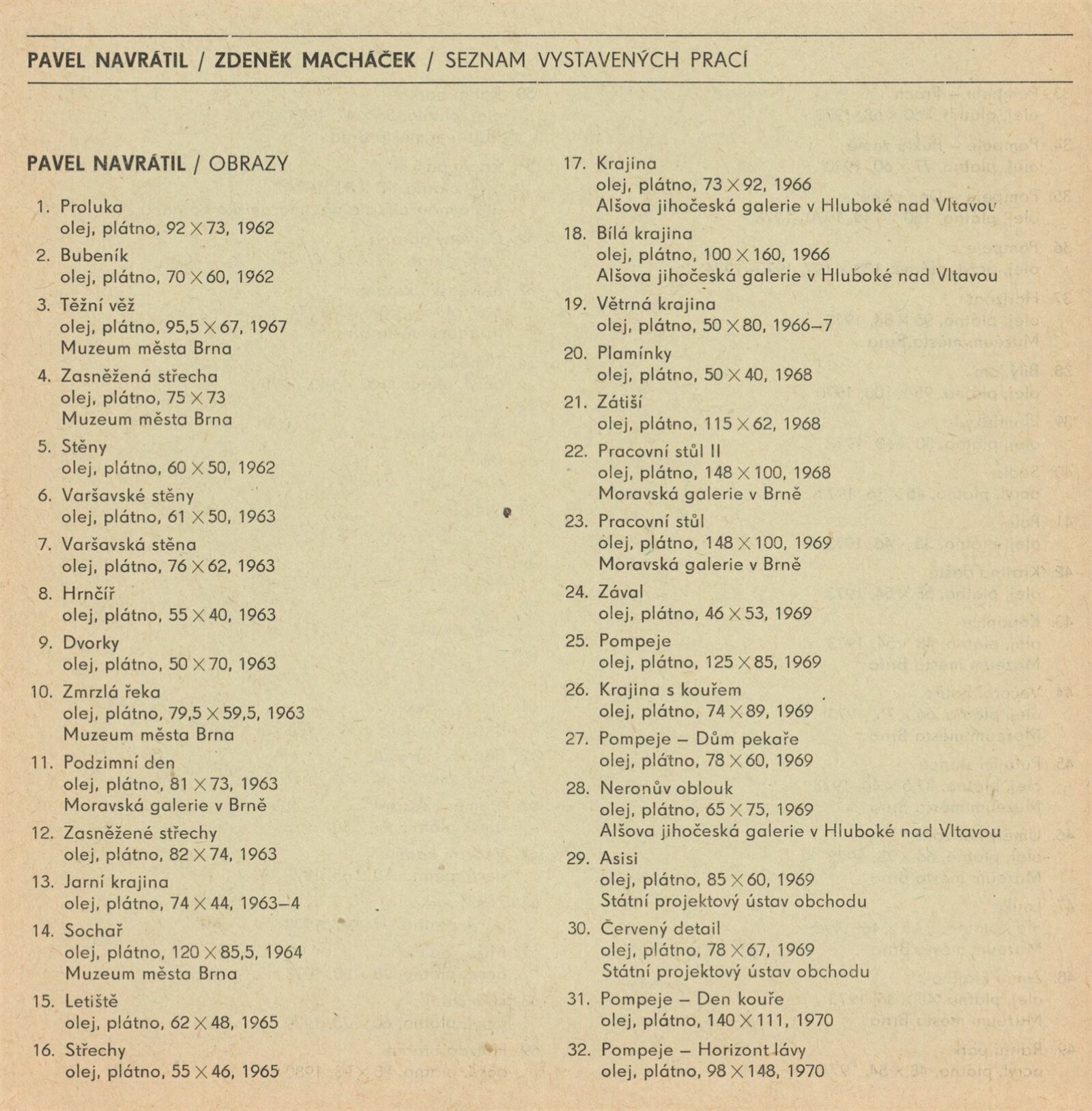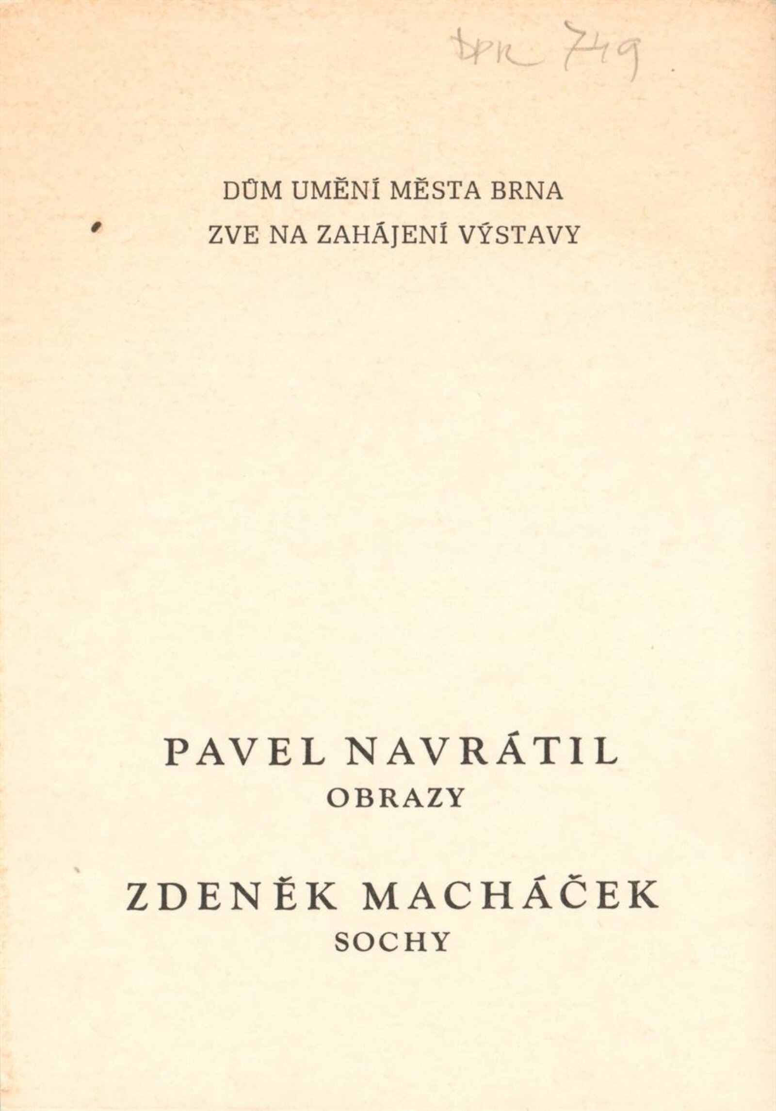 Pavel Navrátil. Zdeněk Macháček. Obrazy, plastika: Dům umění / Dům pánů z Kunštátu, 1. patro, 14. 12. 1980 – 11. 1. 1981 / Text: Jana Vránová. – Brno: DUmB, 1980. – 20 s., obr., seznam vystavených prací 8 s., životní data, výstavy, DPK 749. – MZK; MG; MMB