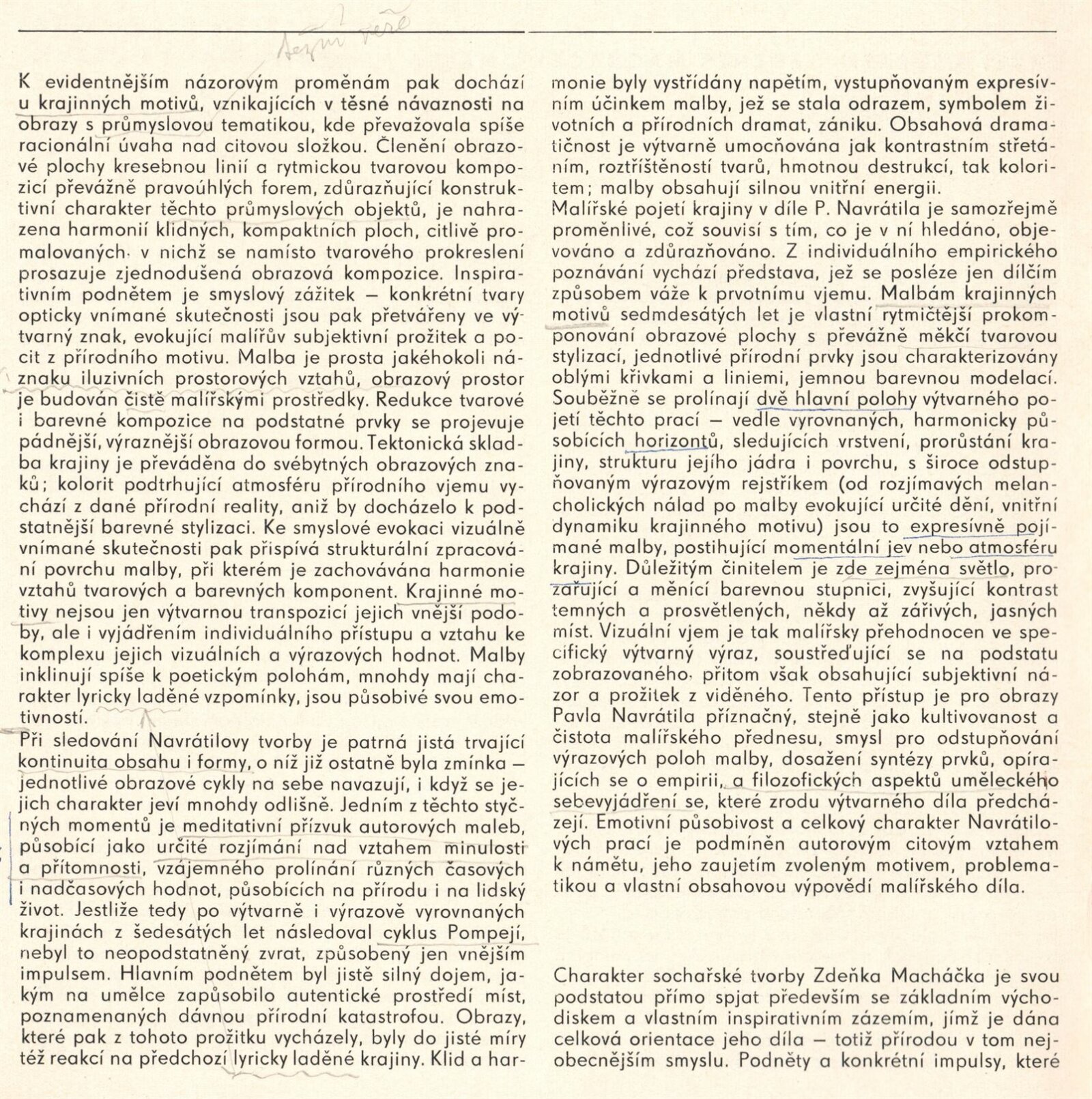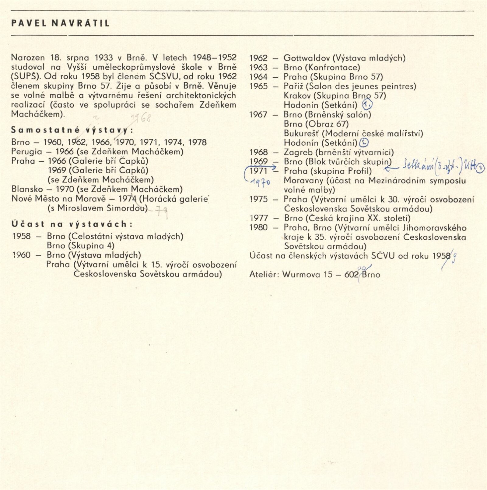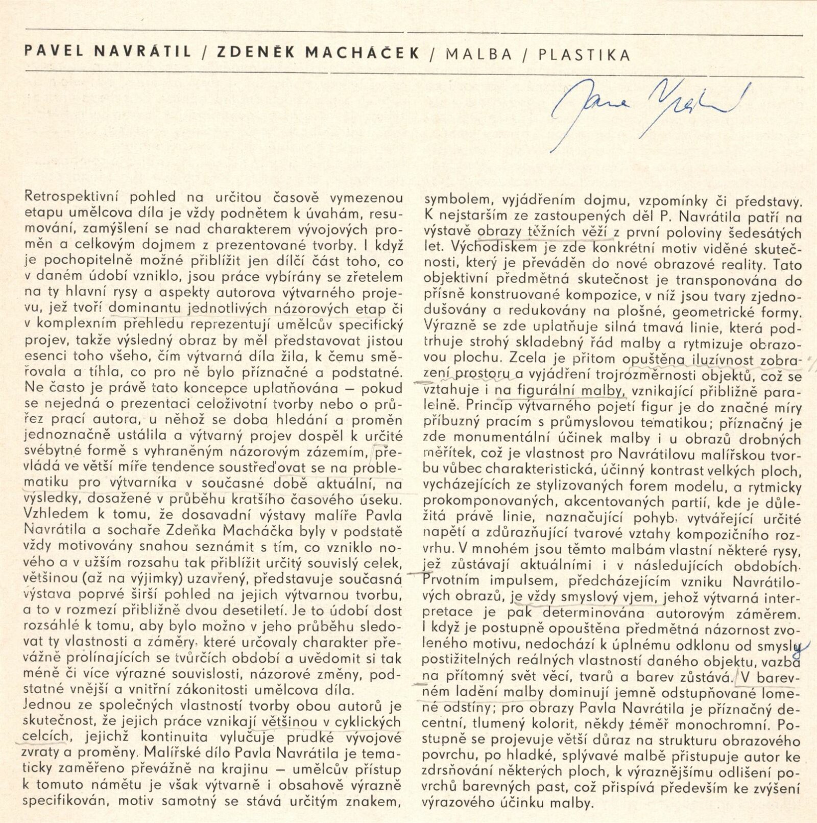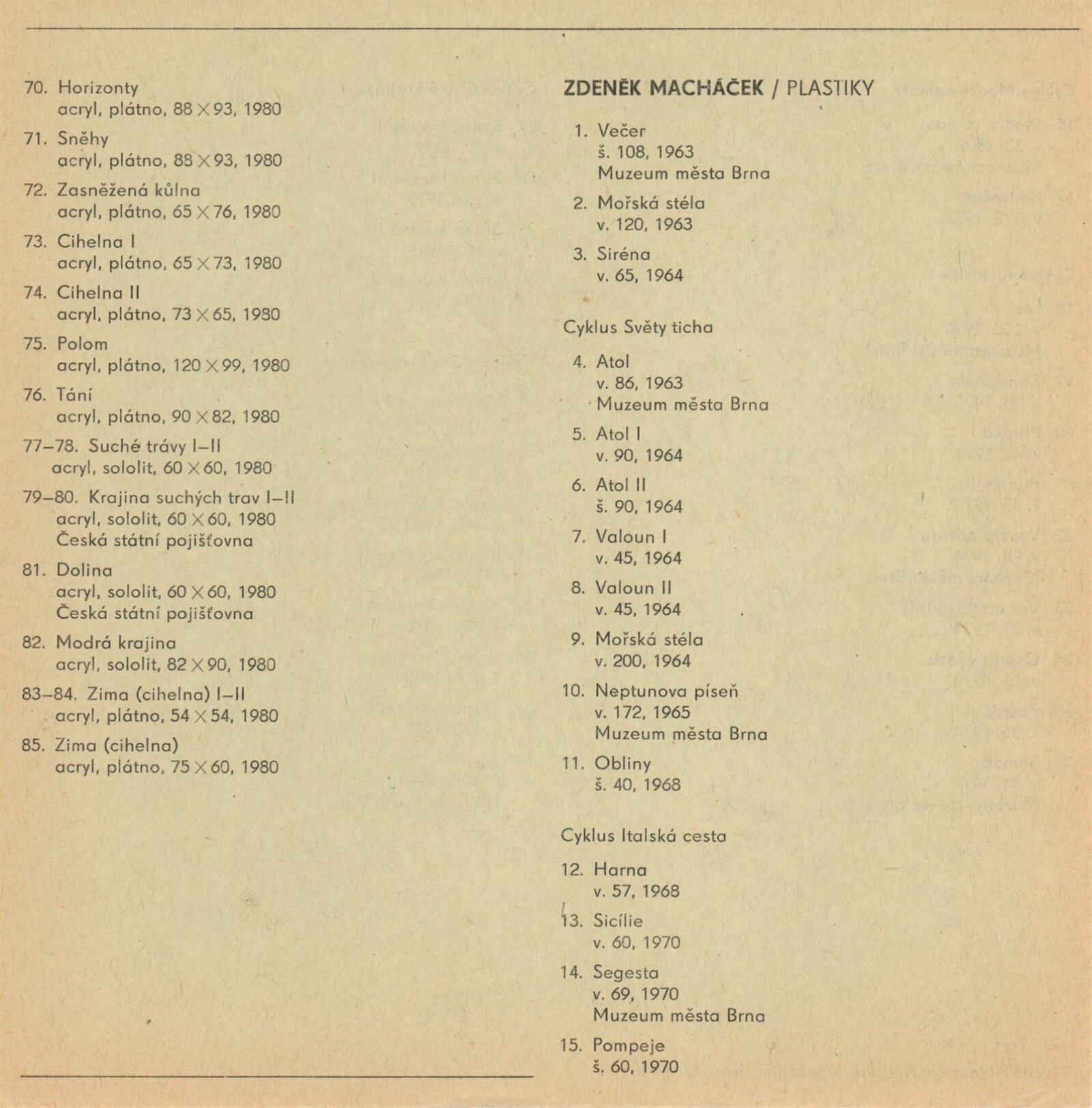 Pavel Navrátil. Zdeněk Macháček. Obrazy, plastika: Dům umění / Dům pánů z Kunštátu, 1. patro, 14. 12. 1980 – 11. 1. 1981 / Text: Jana Vránová. – Brno: DUmB, 1980. – 20 s., obr., seznam vystavených prací 8 s., životní data, výstavy, DPK 749. – MZK; MG; MMB