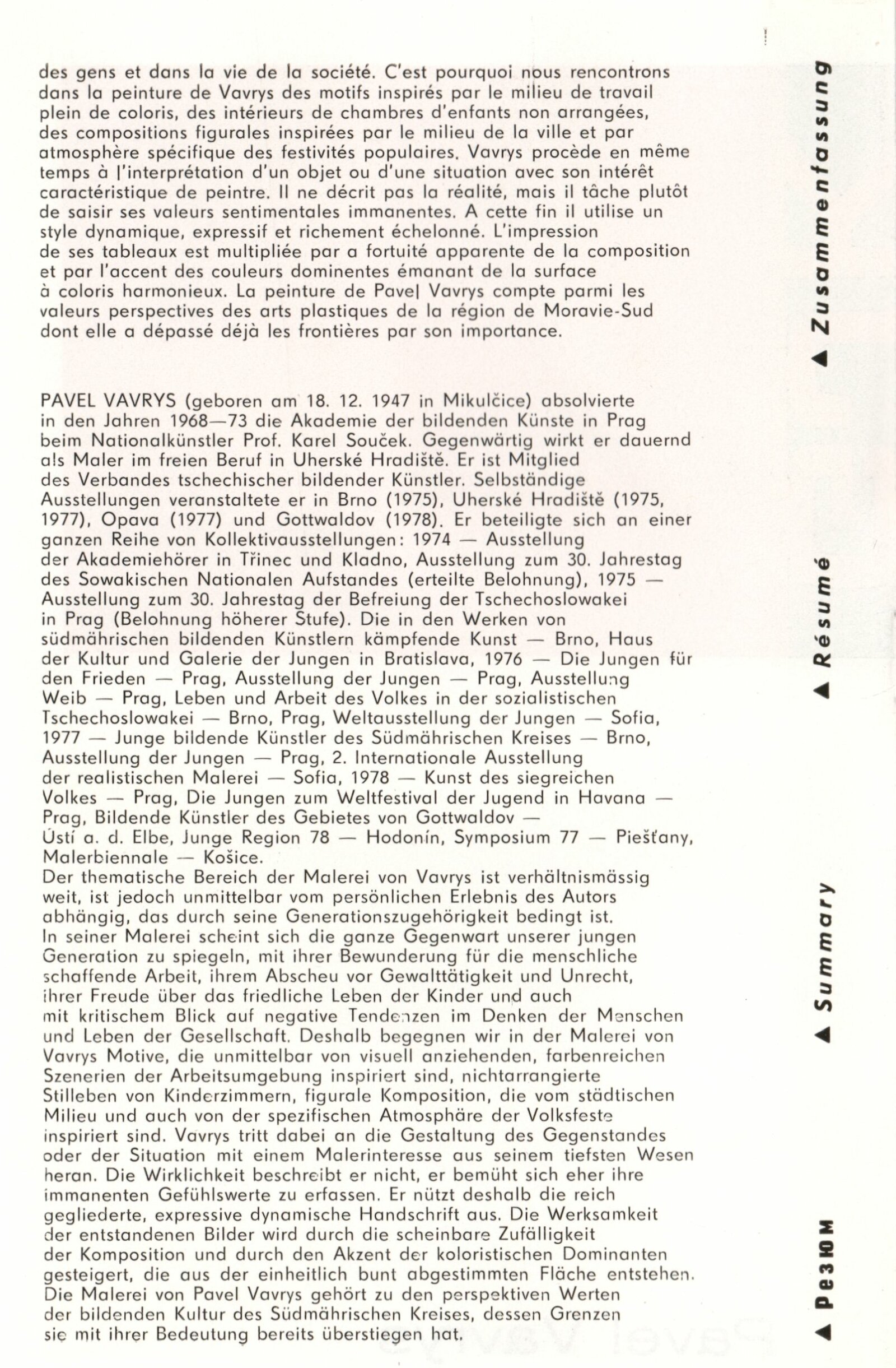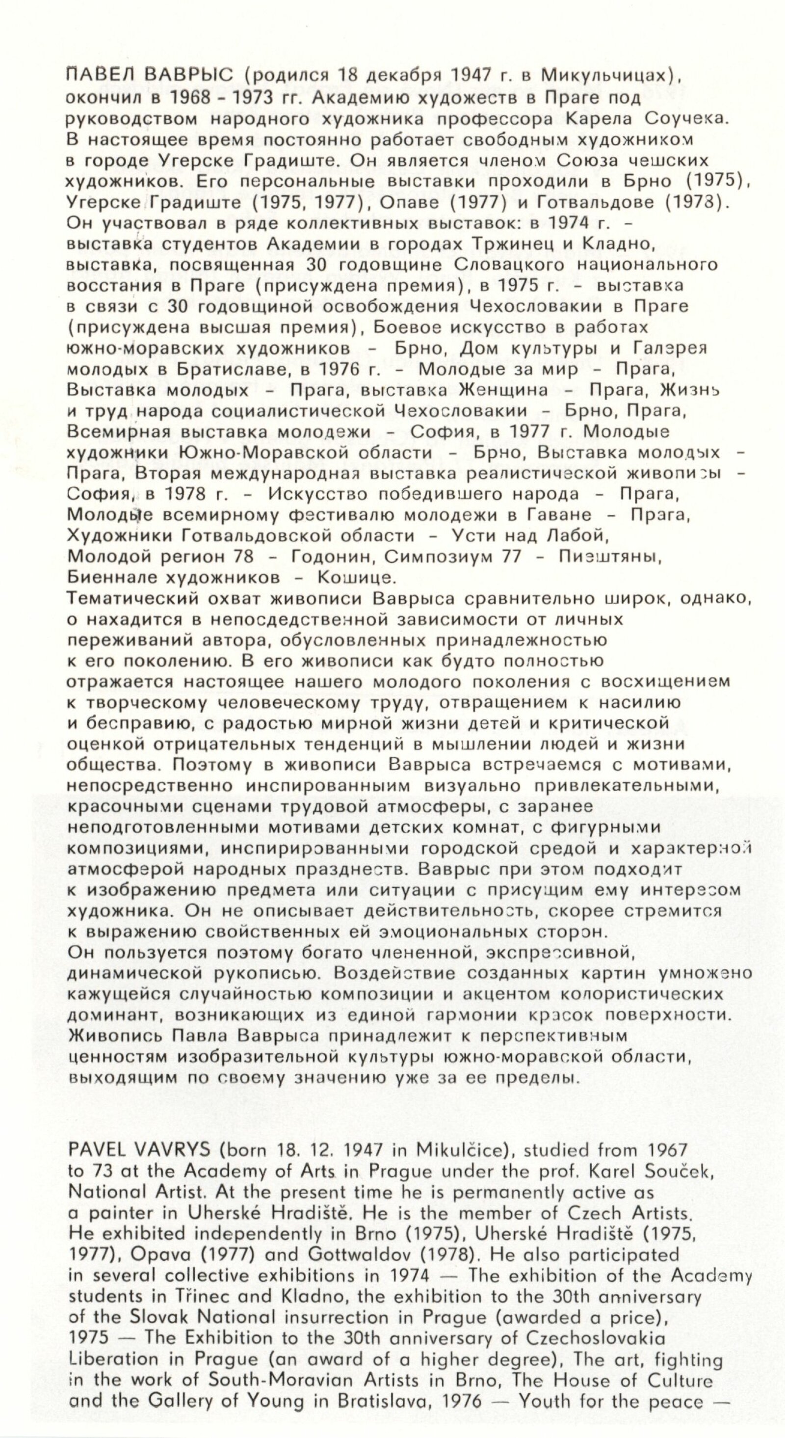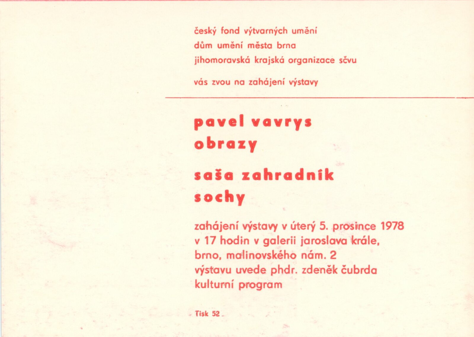 Pavel Vavrys. Obrazy: 90. výstava v Galerii Jaroslava Krále 5. 12. 1978 – 21. 1. 1979 / Text Zdeněk Čubrda. - Brno, ČFVU, - 10 s., obr. Portrét, životní data, výstavy. Neobsahuje seznam vystavených prací, DU 684 Saša Zahradník. Sochy: 90. výstava v Galerii Jaroslava Krále 5. 12. 1978 – 21. 1. 1979 / Text Zdeněk Čubrda. - Brno, ČFVU, - 10 s., obr. Portrét, životní data, výstavy, monumentální realizace. Neobsahuje seznam vystavených prací, DU 684