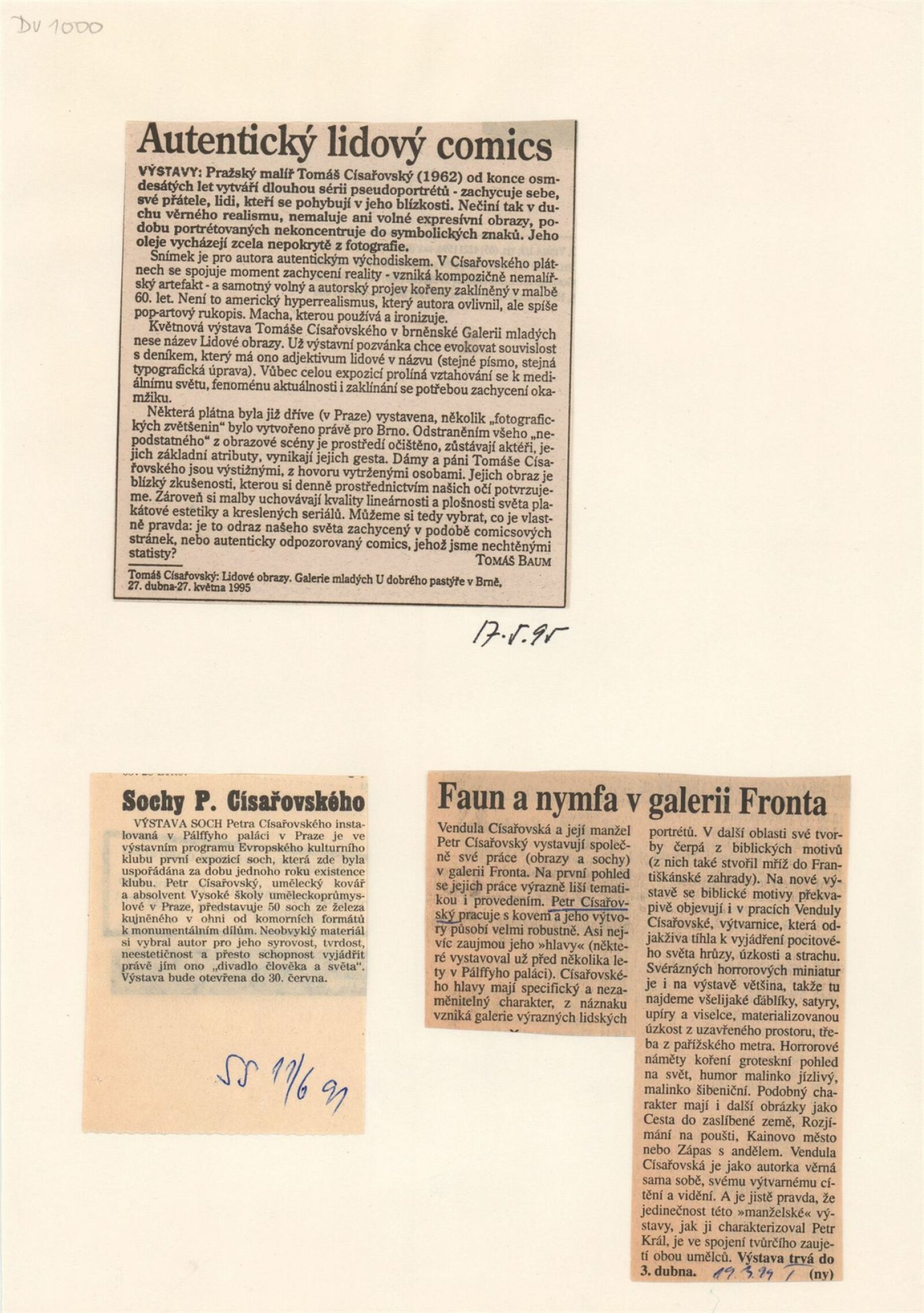 Petr Císařovský. Sochy: Dům umění města Brna, hala, 29. 6. – 13. 7. 1995 / Text Viktor Šlajchrt. - Brno: DUmB, - 1 skládačka (6 s., obr.) + Seznam exponátů [1] s. Životní data, výstavy DU 1000