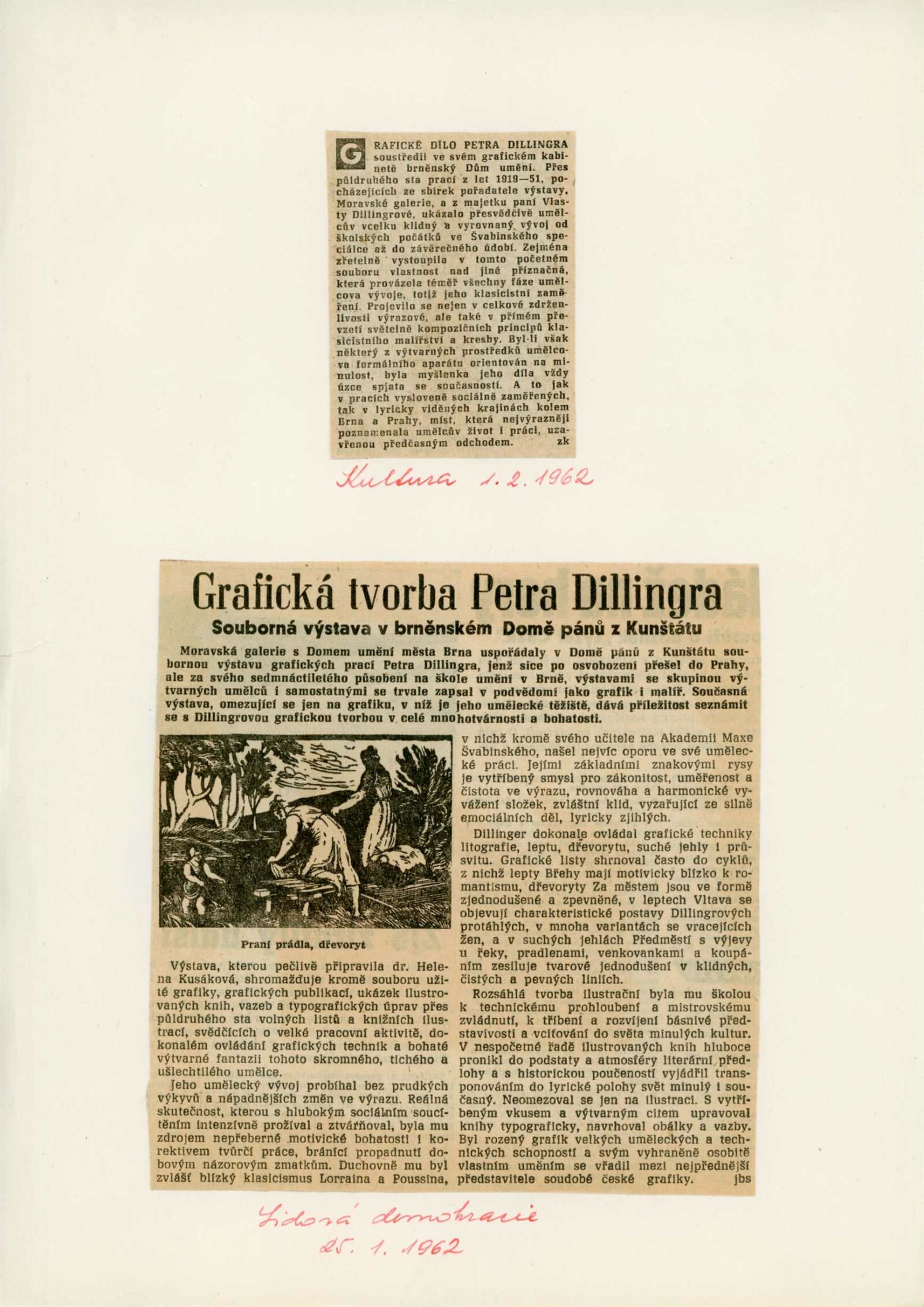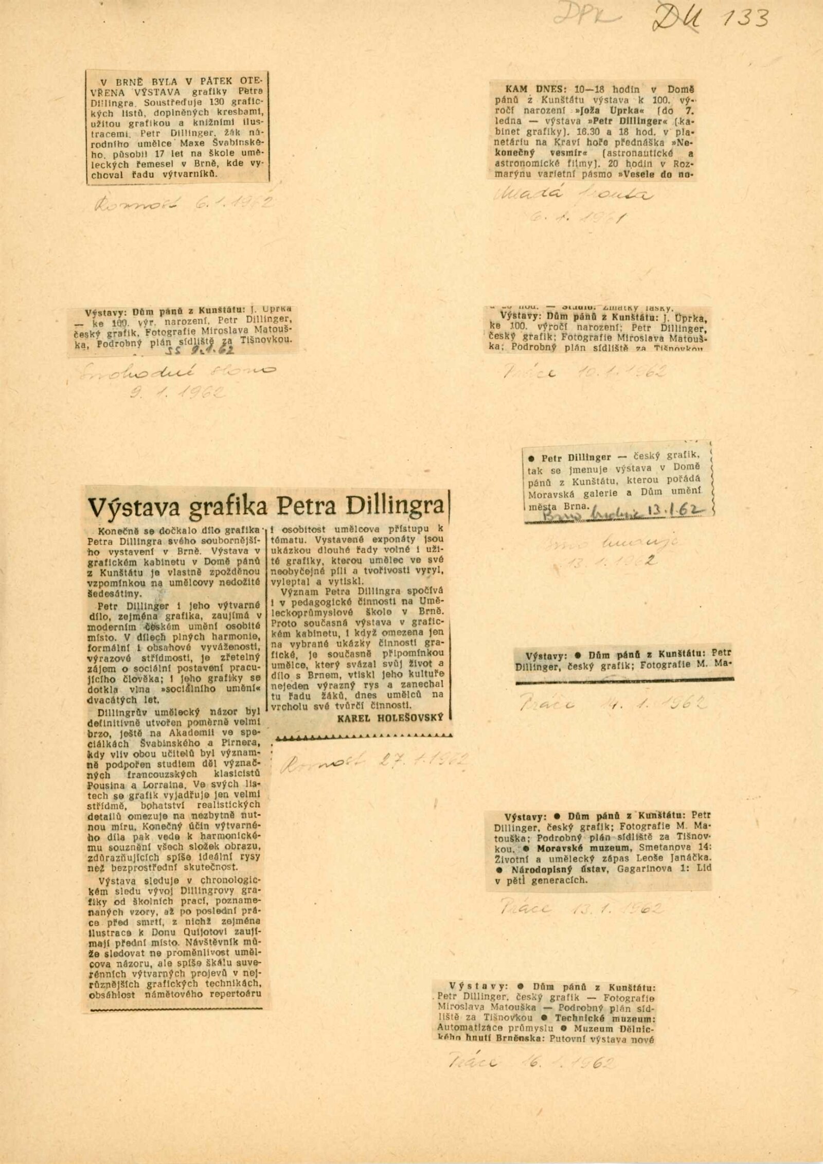 pozvánka, katalog, karta k výstavě, korespondence (Helena Kusáková, pí Dillingerová), recenze v tisku, katalog výstavy (Petra Dillingera v Kabinetu umění – text Jaroslav B. Svrček)