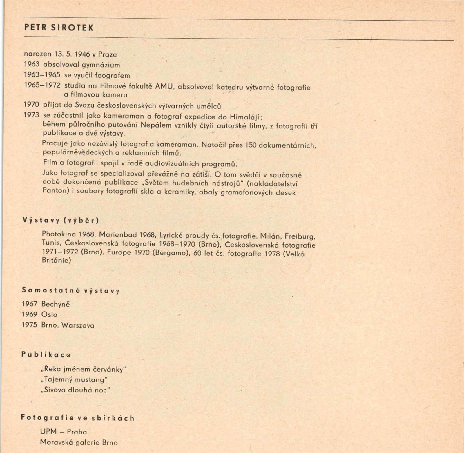 Petr Sirotek. Fotografie: Kabinet fotografie J. Funka, 167. výstava, Dům pánů z Kunštátu 15. 12. 1978 – 14. 1. 1979 / Text autor, báseň Jiří Gold. - Brno: DUmB, - 12 s., obr. Životní data, výstavy, publikace DPK 689; MZK; MG