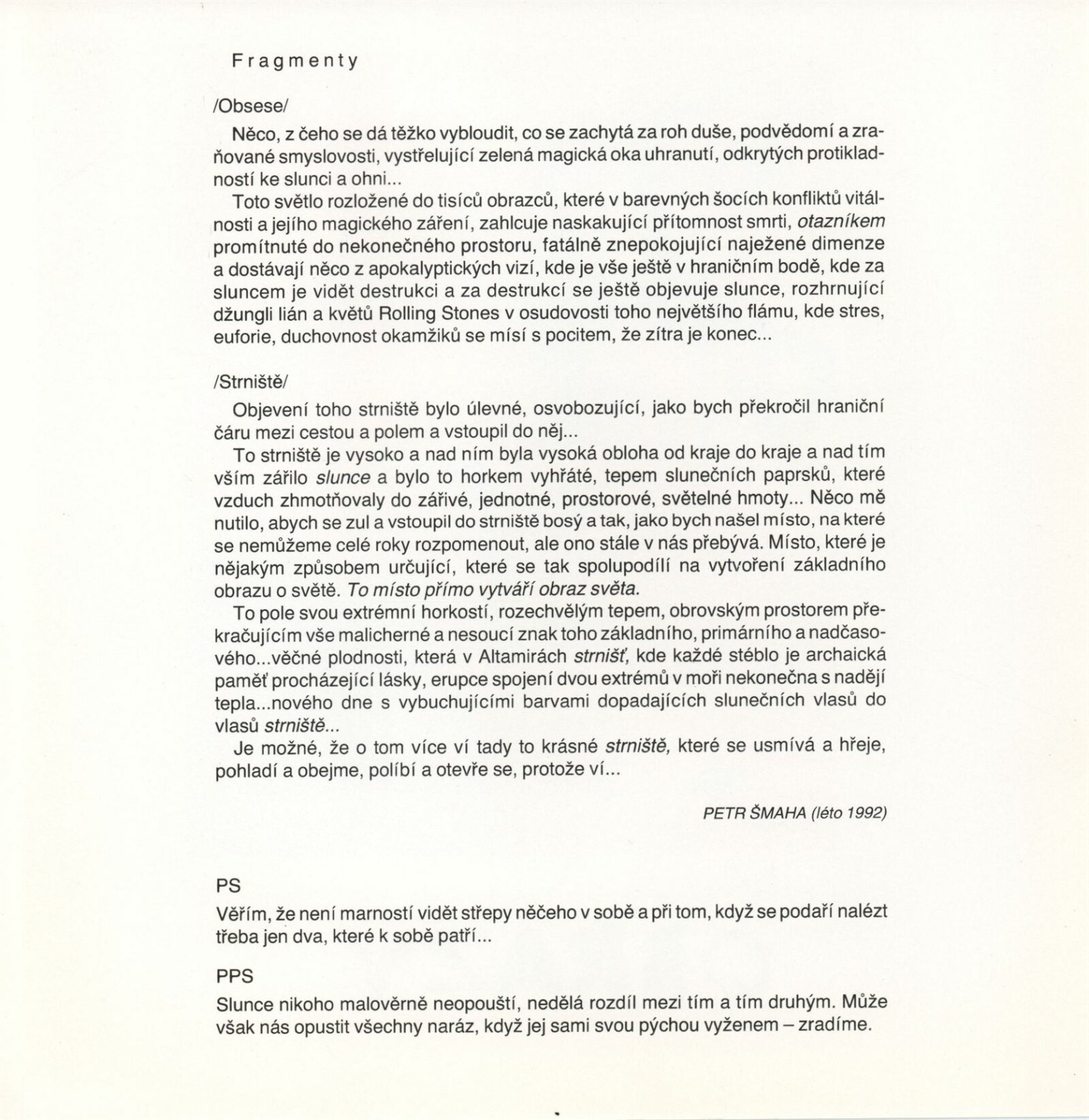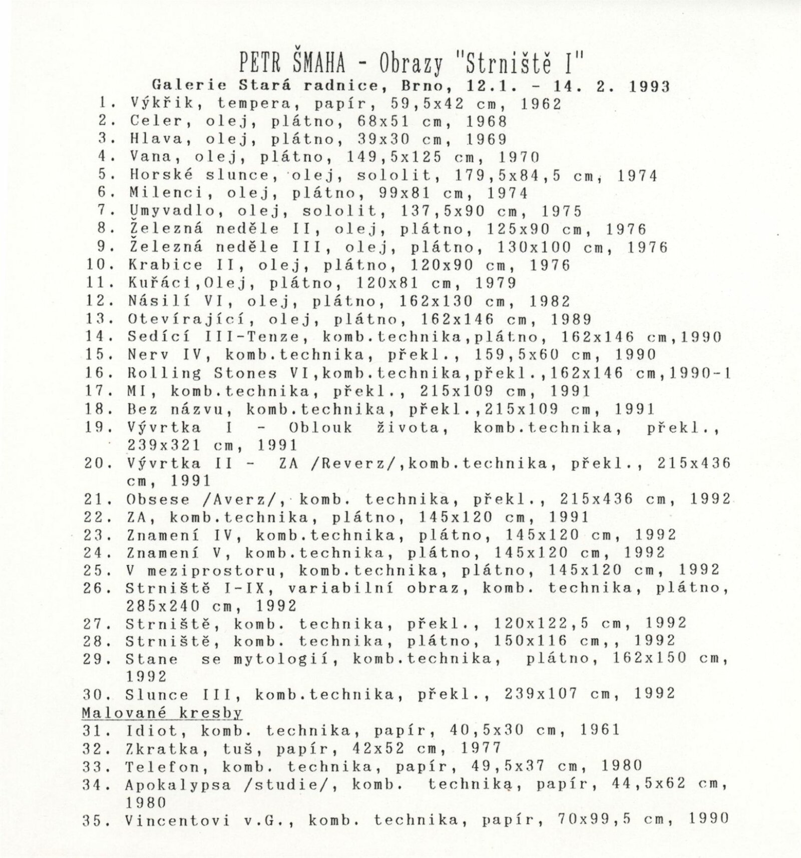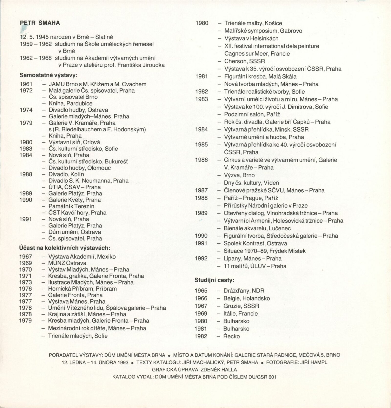 Petr Šmaha. Obrazy: Galerie Stará radnice 12. 1. – 14. 2. 1993 / Texty Jiří Machalický, autor. - Brno: DUmB, - 1 skládačka (6 s., obr.) + Obrazy "Strniště I." [1] s. Životní data, výstavy GSR 138; MZK; MG