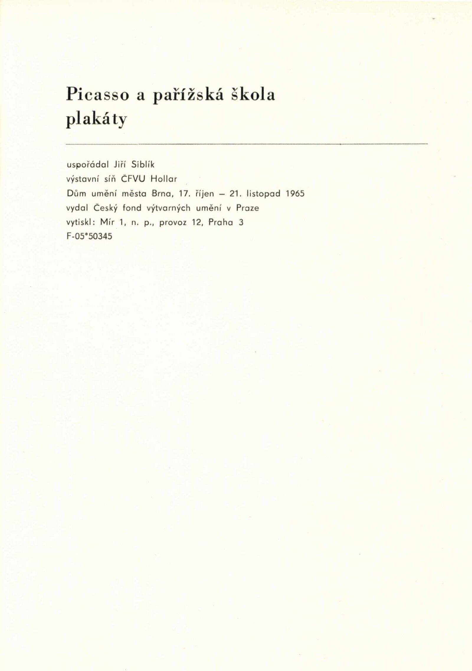 Picasso a pařížská škola. Plakáty: Dům umění města Brna, 17. 10. – 21. 11. 1965 / Text: Jiří Siblík. – Praha: ČFVU, 1965. – 8 s., obr., DU 445. – MZK; MG