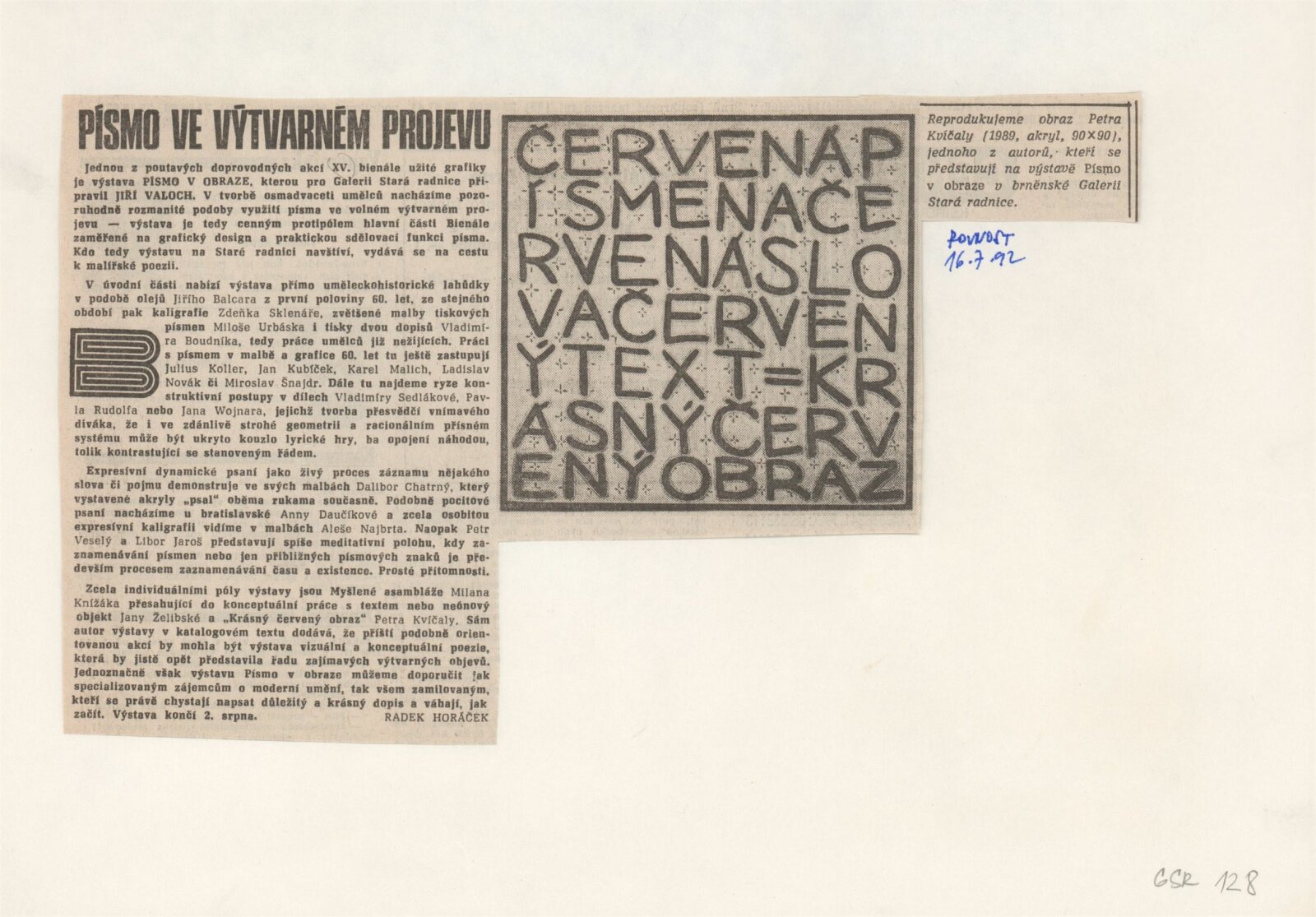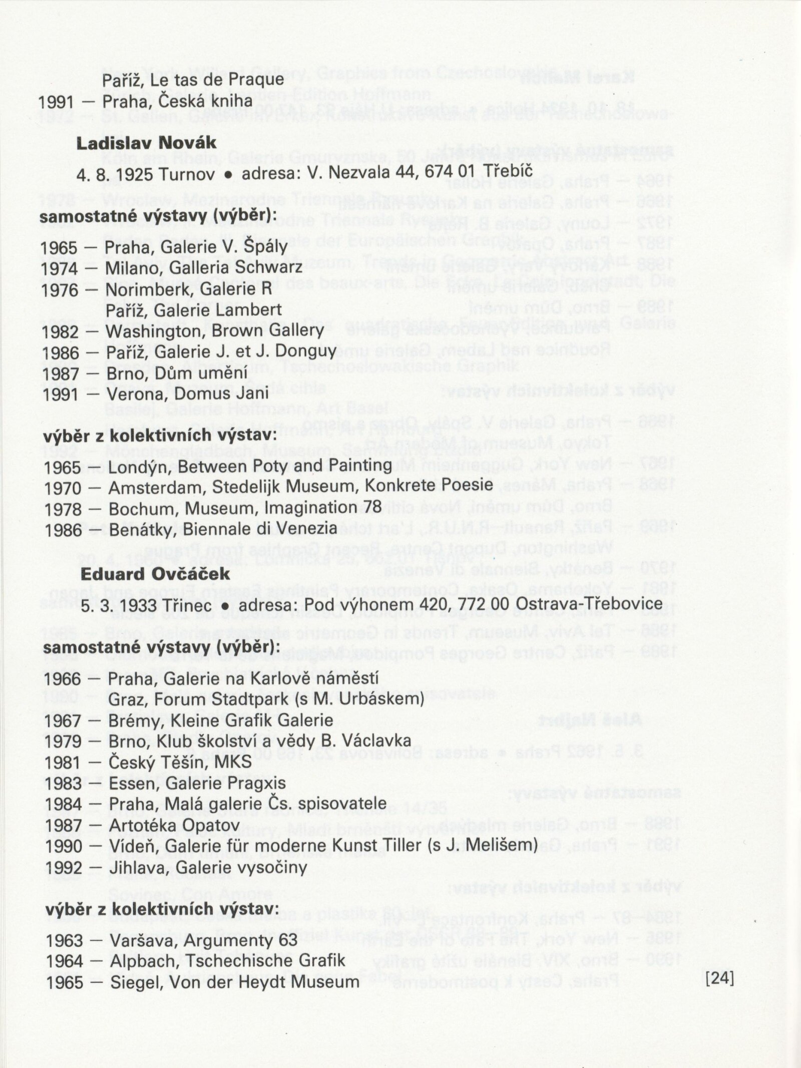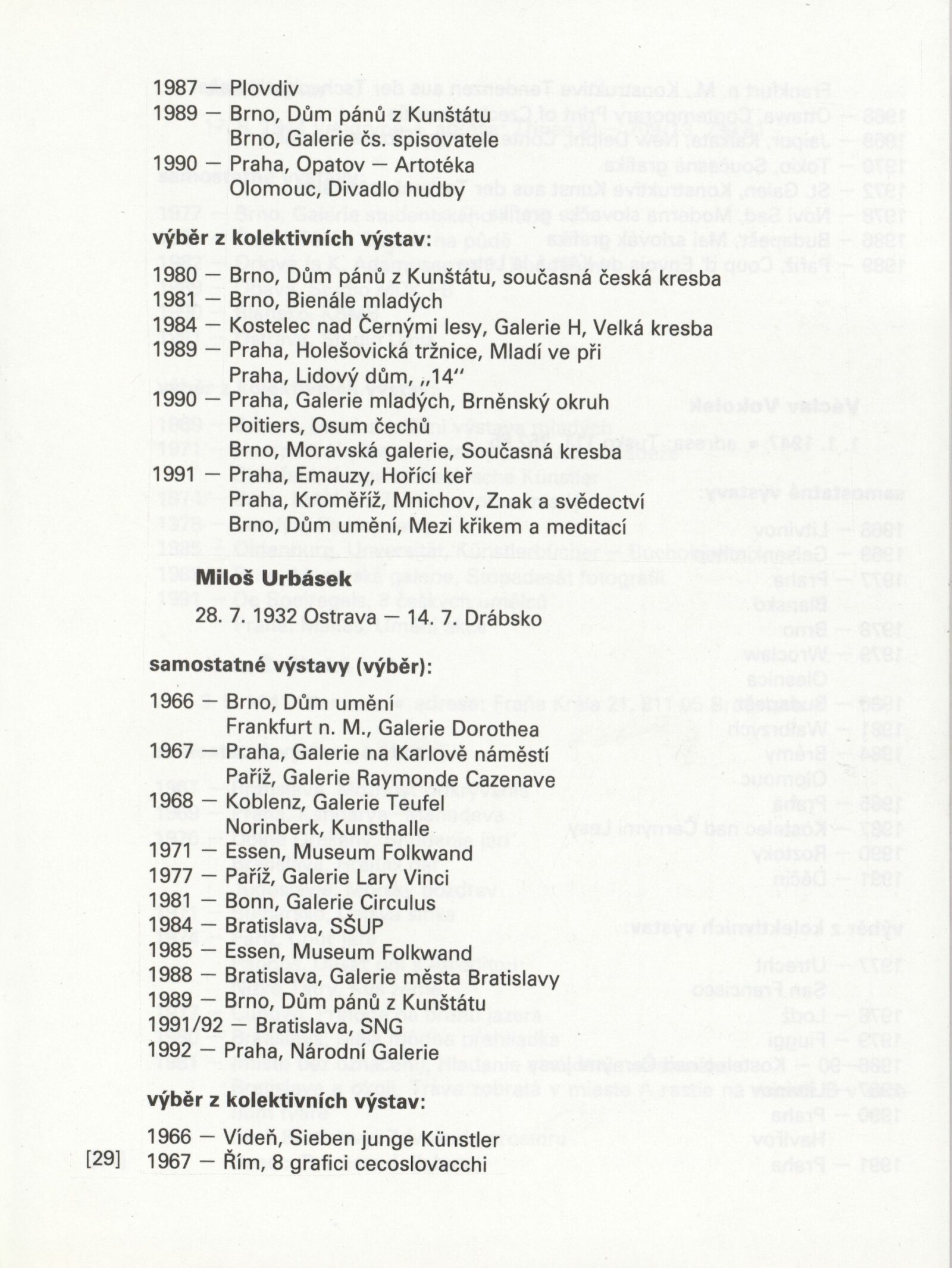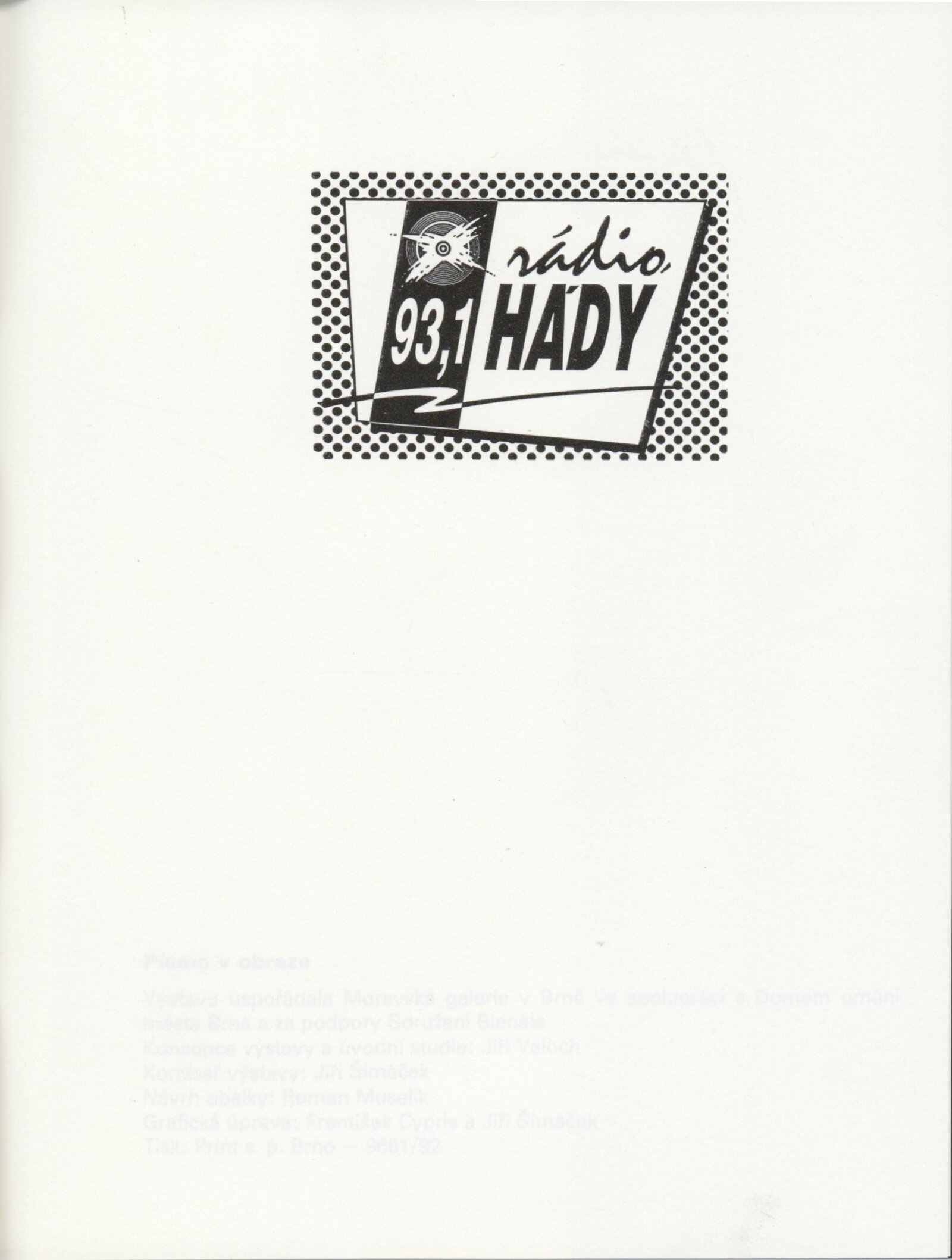 Písmo v obraze. Doprovodná výstava Bienále Brno´92: Galerie Stará radnice 1. 9. – 11. 10. 1992 / Text Jiří Valoch. - Brno: Moravská galerie - 59 s., obr. + Seznam exponátů [4] s. Životní data, výstavy GSR 128; MZK; MG