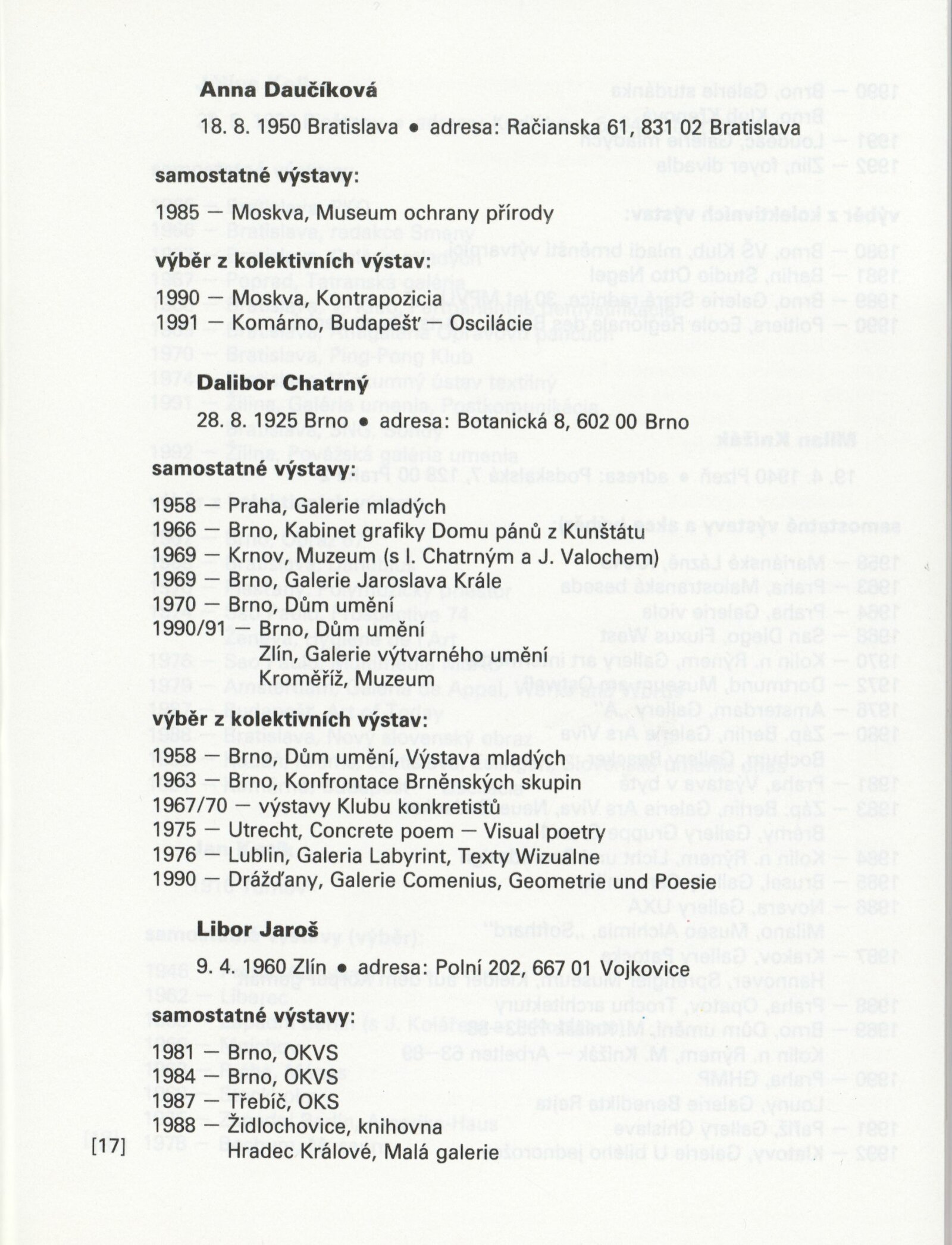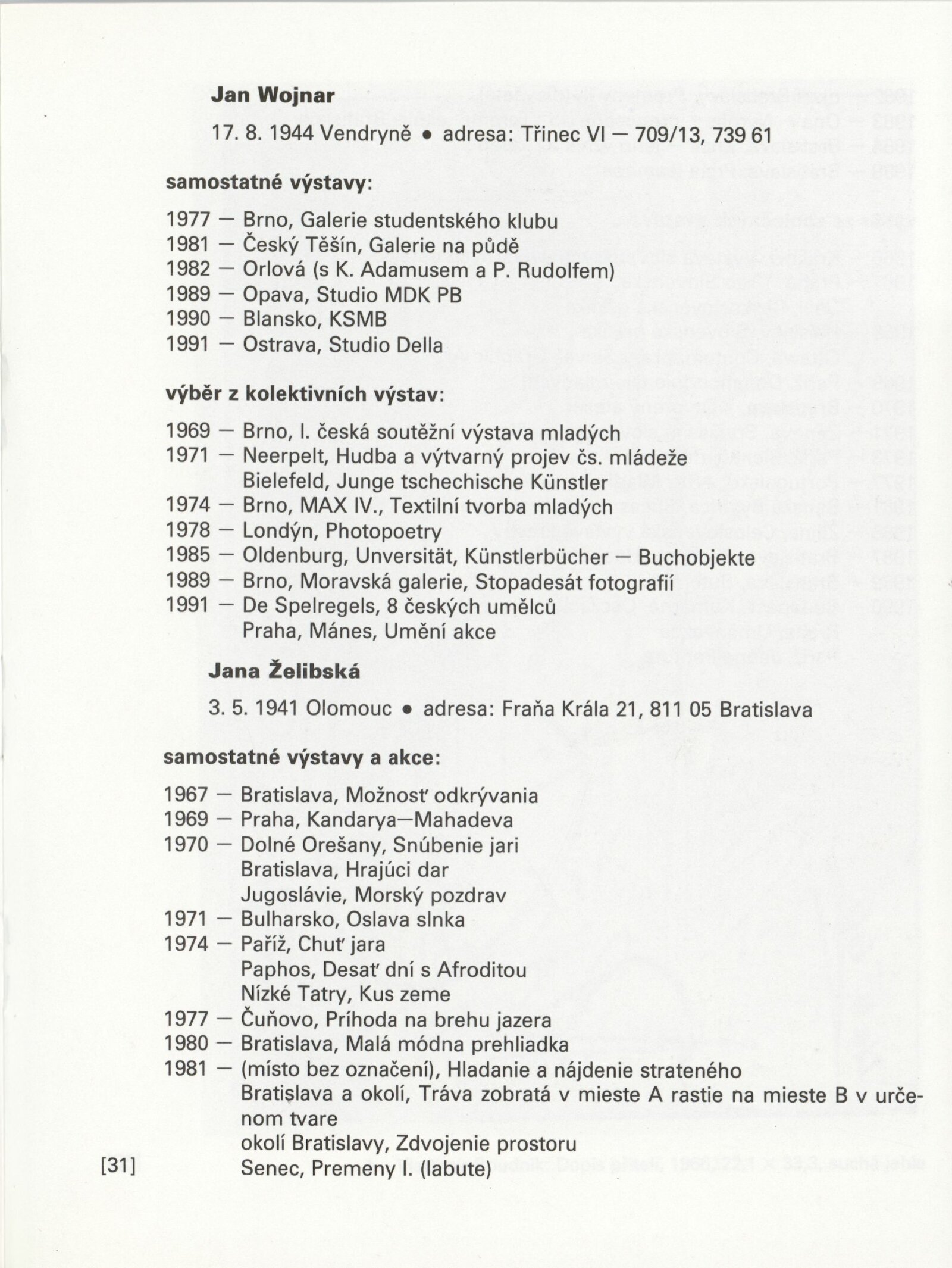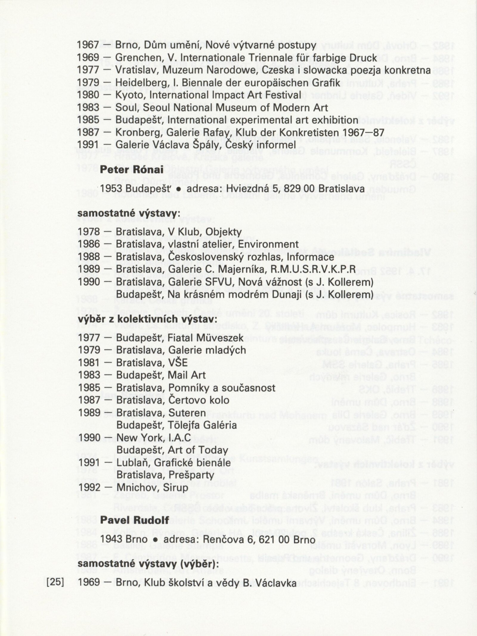 Jiří Balcar, Klára Bočkayová, Vladimír Boudník, Anna Daučíková, Dalibor Chatrný, Libor Jaroš, Milan Knížák, Július Koller, Jan Kotík, Radoslav Kratina, Jan Kubíček, Petr Kvíčala, Karel Malich, Aleš Najbrt, Ladislav Novák, Eduard Ovčáček, Peter Rónai, Pavel Rudolf, Vladimíra Sedláková, Zdeněk Sklenář, Jan Smejkal, Miroslav Šnajdr, Petr Veselý, Miloš Urbásek, Václav Vokolek, Jan Wojnar, Jana Želibská