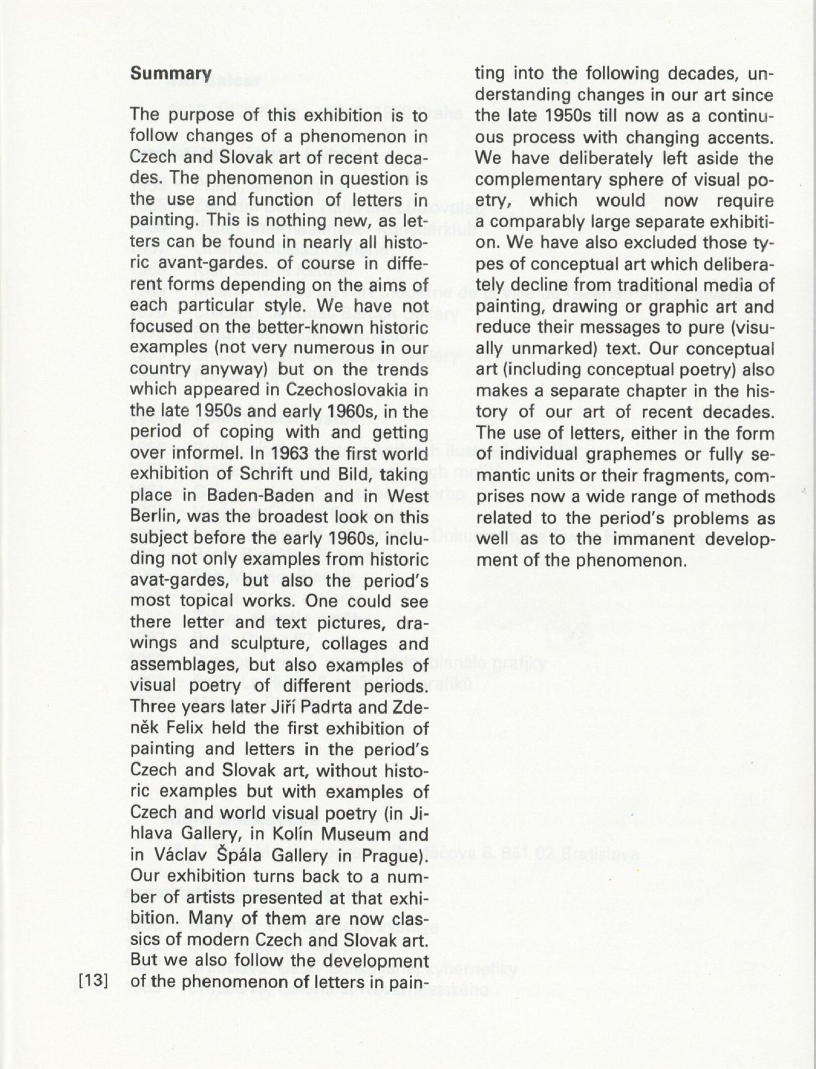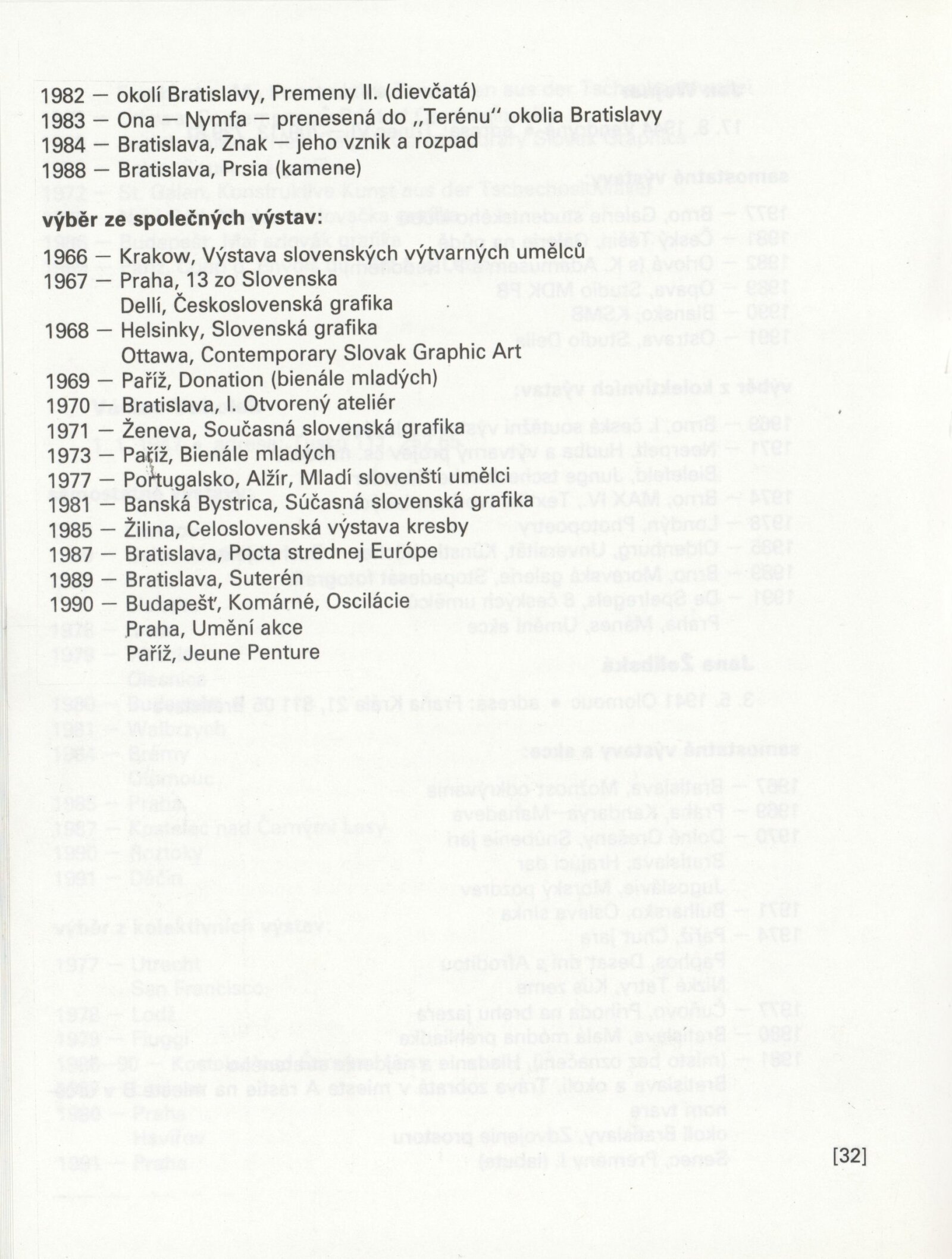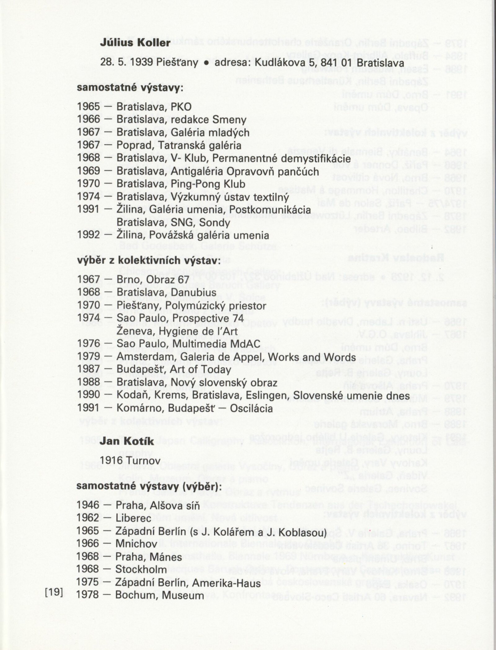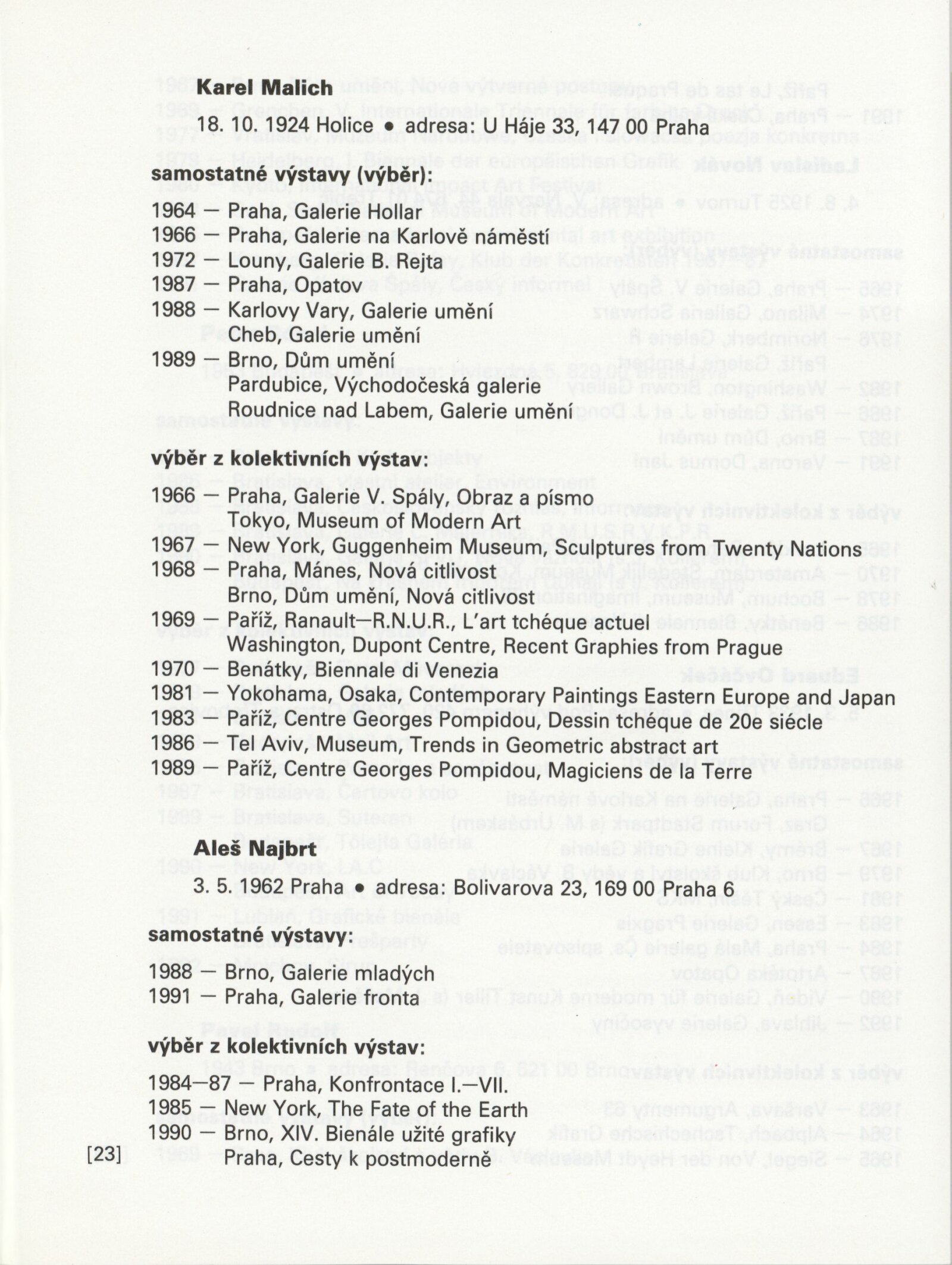 Jiří Balcar, Klára Bočkayová, Vladimír Boudník, Anna Daučíková, Dalibor Chatrný, Libor Jaroš, Milan Knížák, Július Koller, Jan Kotík, Radoslav Kratina, Jan Kubíček, Petr Kvíčala, Karel Malich, Aleš Najbrt, Ladislav Novák, Eduard Ovčáček, Peter Rónai, Pavel Rudolf, Vladimíra Sedláková, Zdeněk Sklenář, Jan Smejkal, Miroslav Šnajdr, Petr Veselý, Miloš Urbásek, Václav Vokolek, Jan Wojnar, Jana Želibská