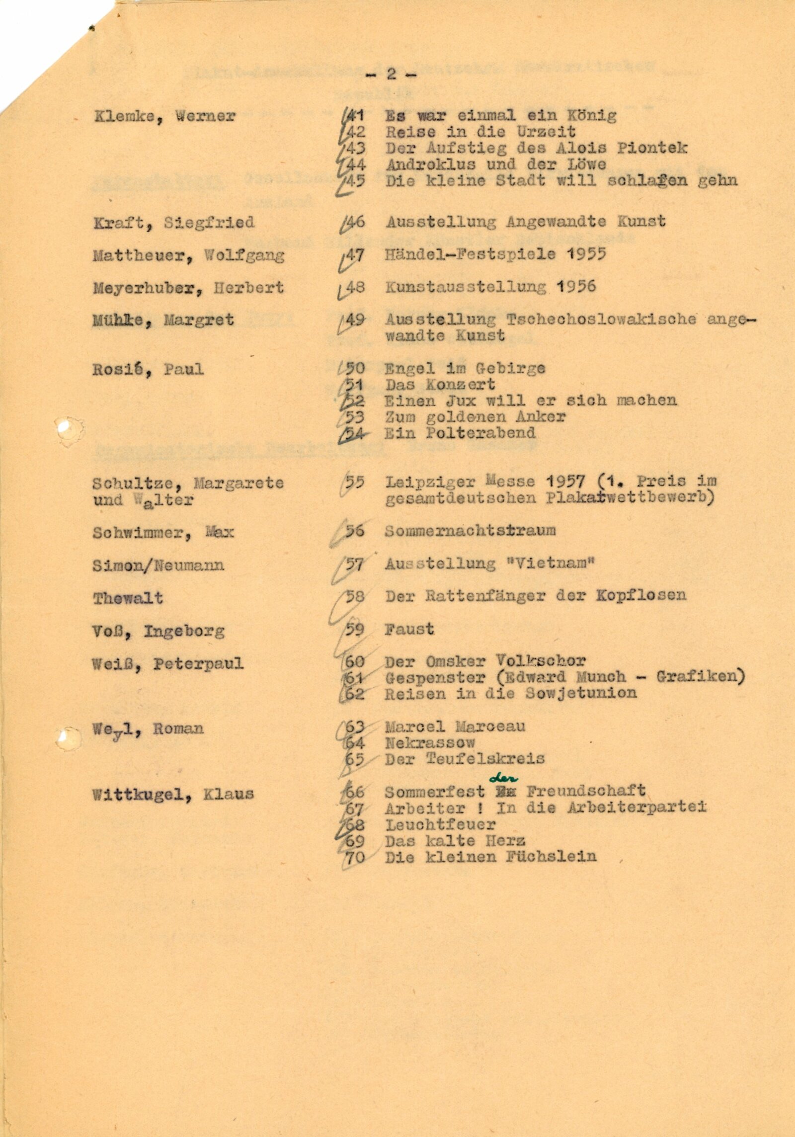 Karl V. Appen, Auer, Hana Baltzer, Heinz Ebel, W. Eickhoff, Achim Freyer, Frans Haacken, John Heartfield/Herzfelde, Rudolf Heinrich, Bert Heller, Gerhardt Jaeger, Gerhard Kettner, Dietrich Kaufmann, Heinrich Kilger, Werner Klemke, Siegfried Kraft, Wolfgang Mattheuer, Herbert Meyerhuber, Margret Mühlke, Paul Rosié, Margarete a Walter Schultze