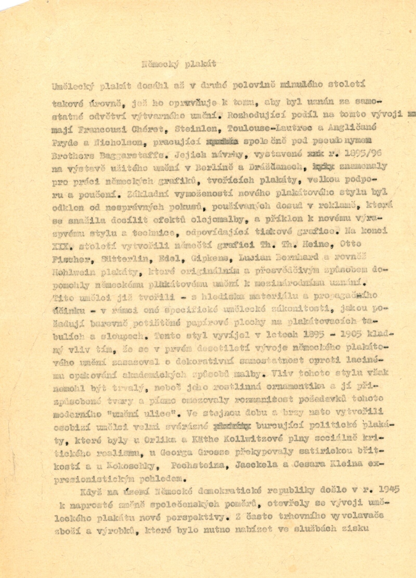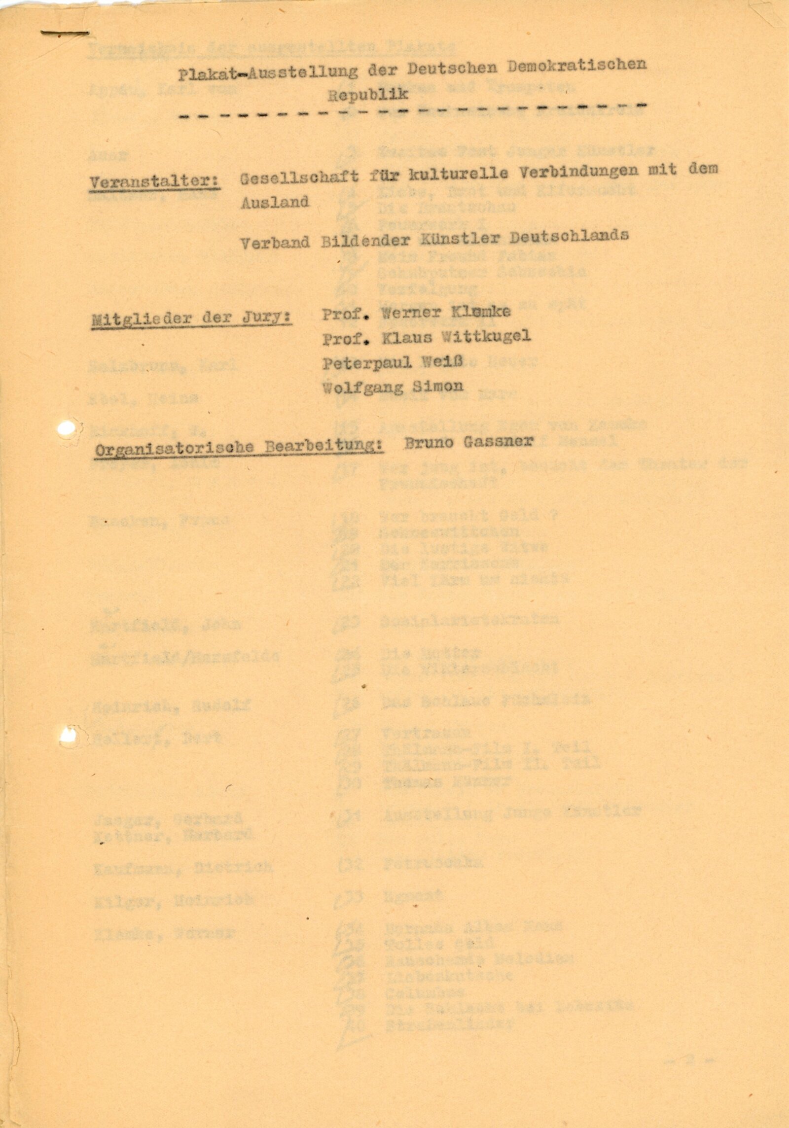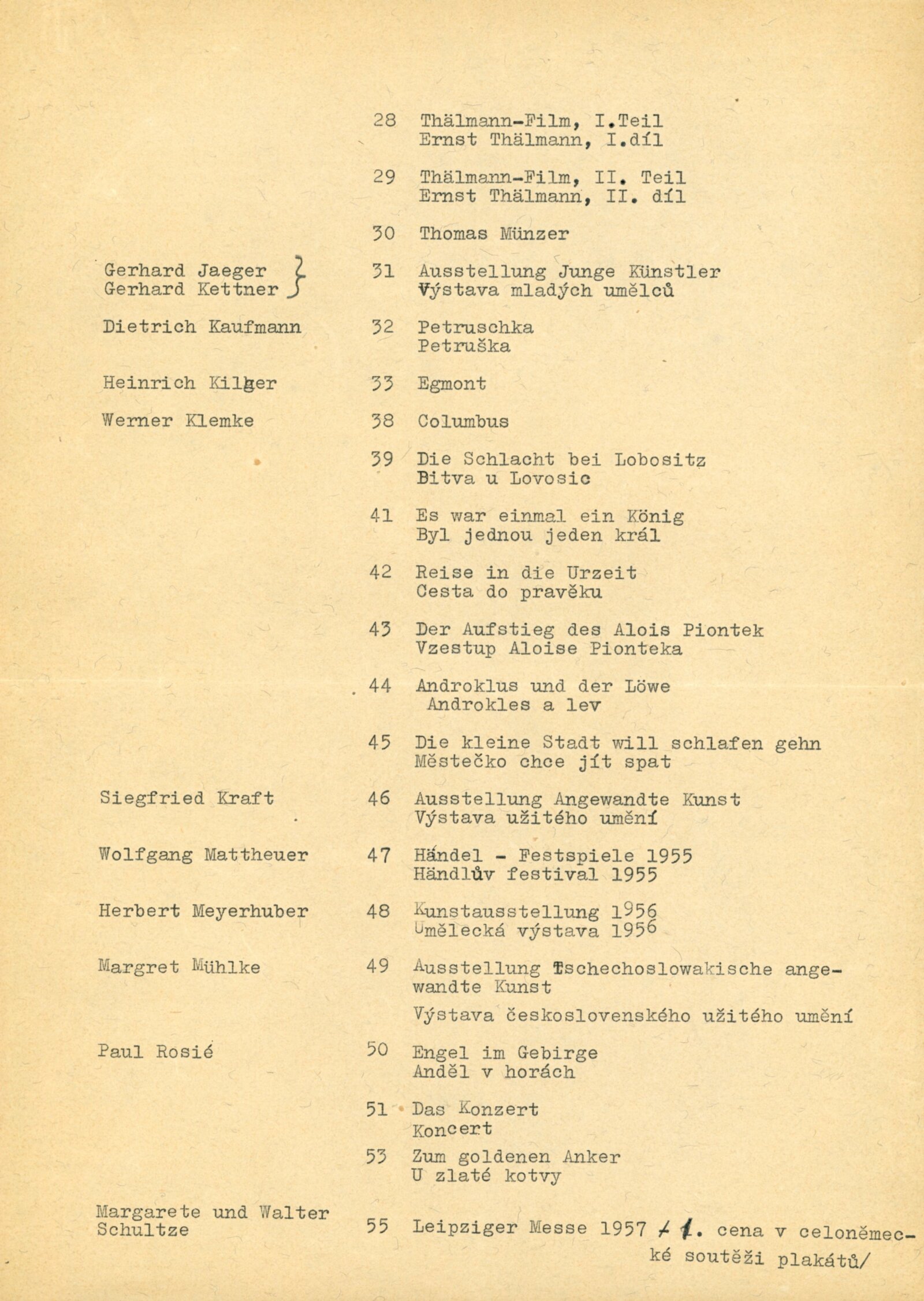 Výstava plakátů Německé demokratické republiky: Dům umění, 9. 6. – 30. 6. 1957 / Převzatý katalog. Výstava plakátů Německé demokratické republiky: Výstavní síň Kulturního a informačního střediska Německé demokratické republiky v Praze, 15. 3. – 29. 3. 1957 / Text: Kurt Schifner. – Praha: Kulturní a informační středisko Německé demokratické republiky, 1957. – 4 s., DU 290