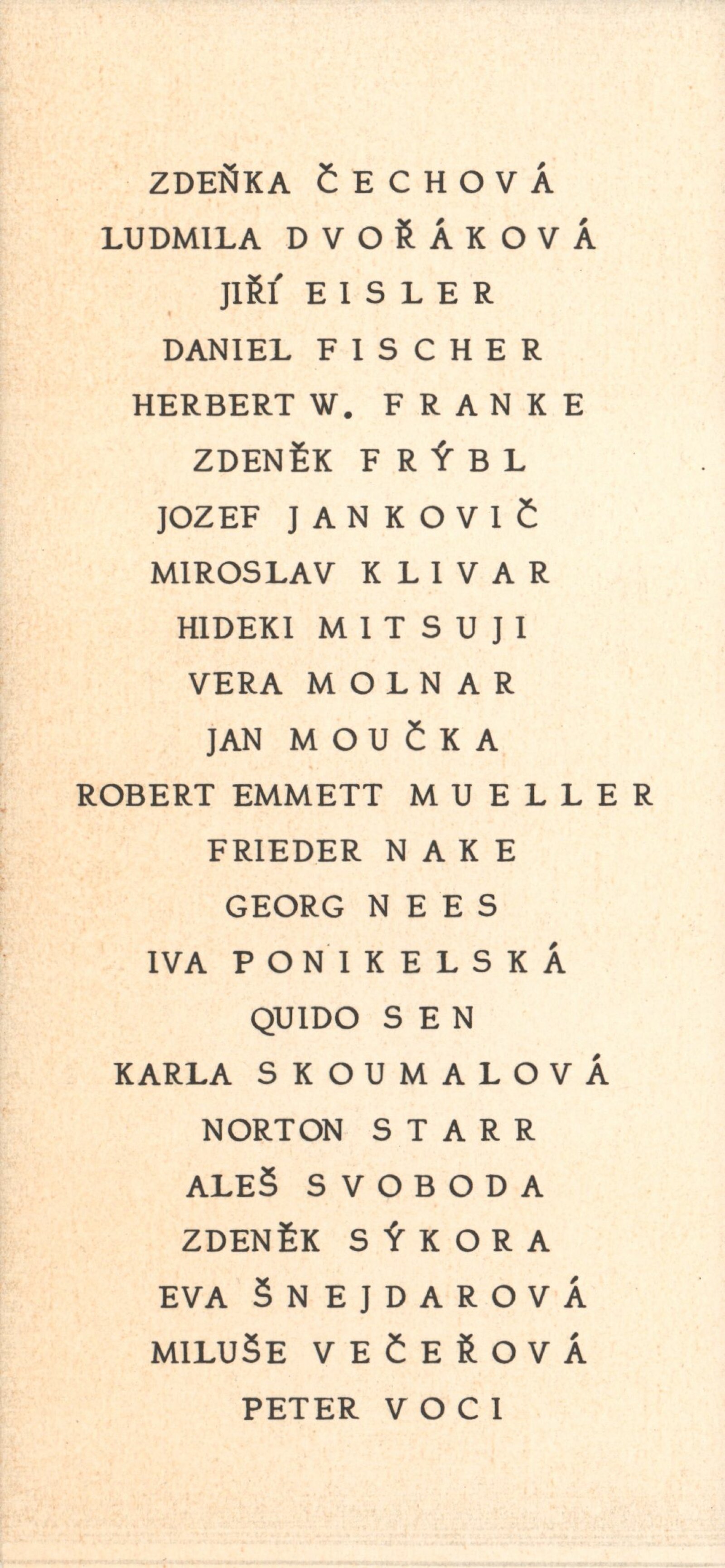 Zdeňka Čechová, Ludmila Dvořáková, Jiří Eisler, Daniel Fischer, Herbert W. Franke, Zdeněk Frýbl, Jozef Jankovič, Miroslav Klivar, Hideki Mitsuji, Vera Molnar, Jan Moučka, Robert Emmett Mueller, Frieder Nake, Georg Nees, Iva Ponikelská, Quido Sen, Karla Skoumalová, Norton Starr, Aleš Svoboda, Zdeněk Sýkora, Eva Šnejdarová, Miluše Večeřová, Peter Voci