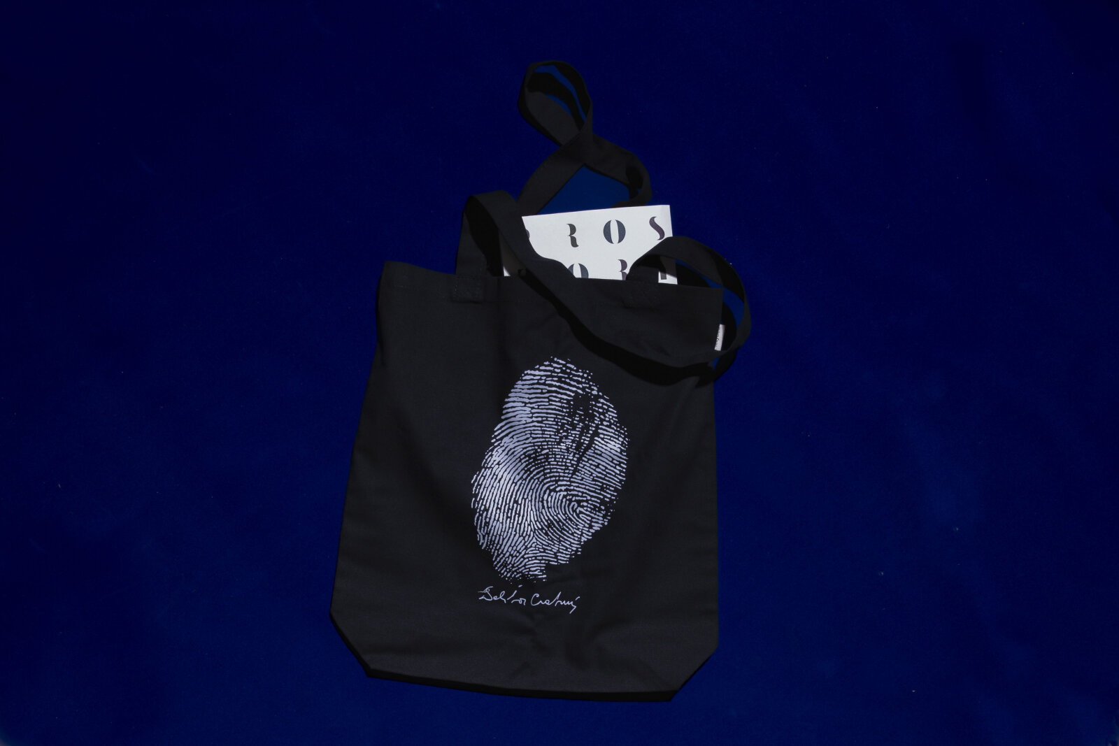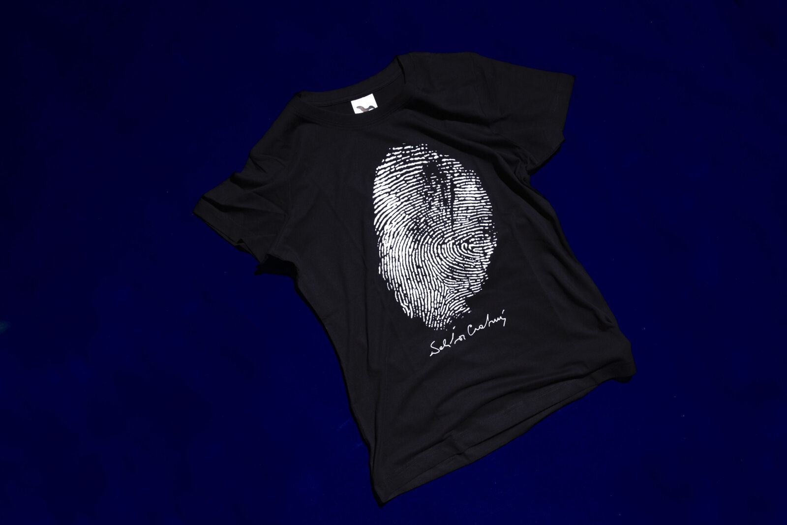 V Domě umění je k dispozici také tematický merch k oslavám Dalibora Chatrného – stylová černá trička a tašky s motivem jeho otisku palce.