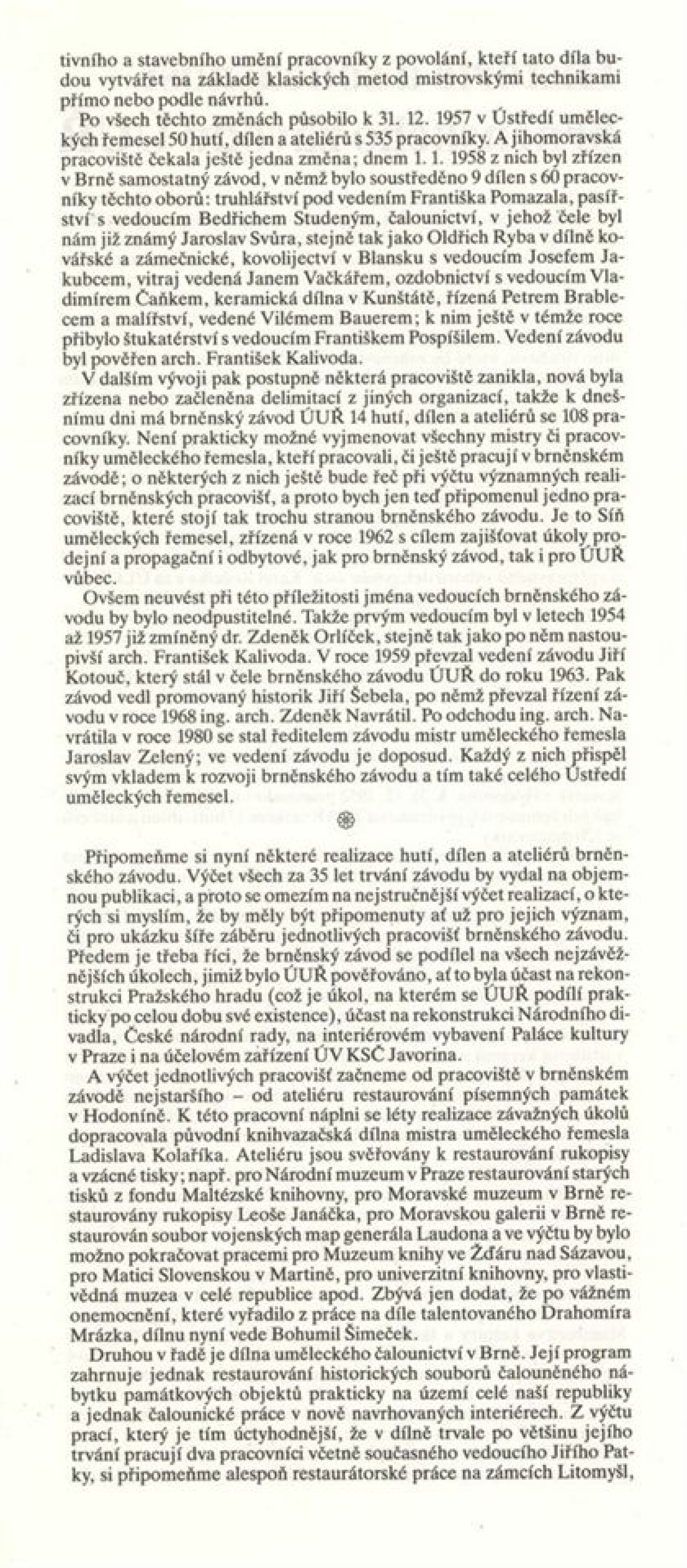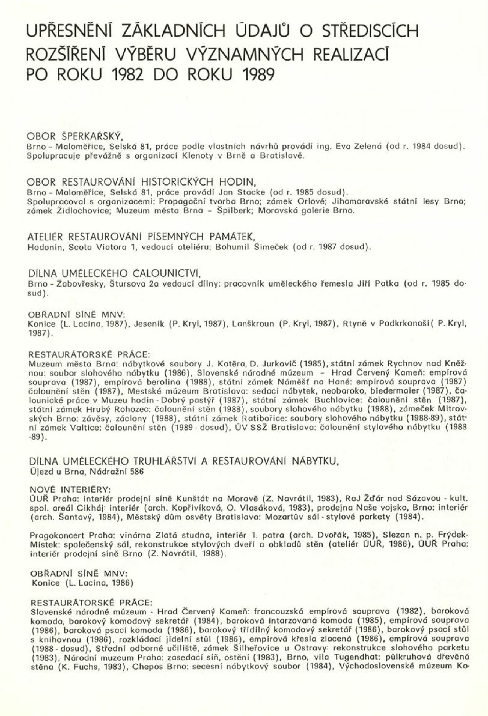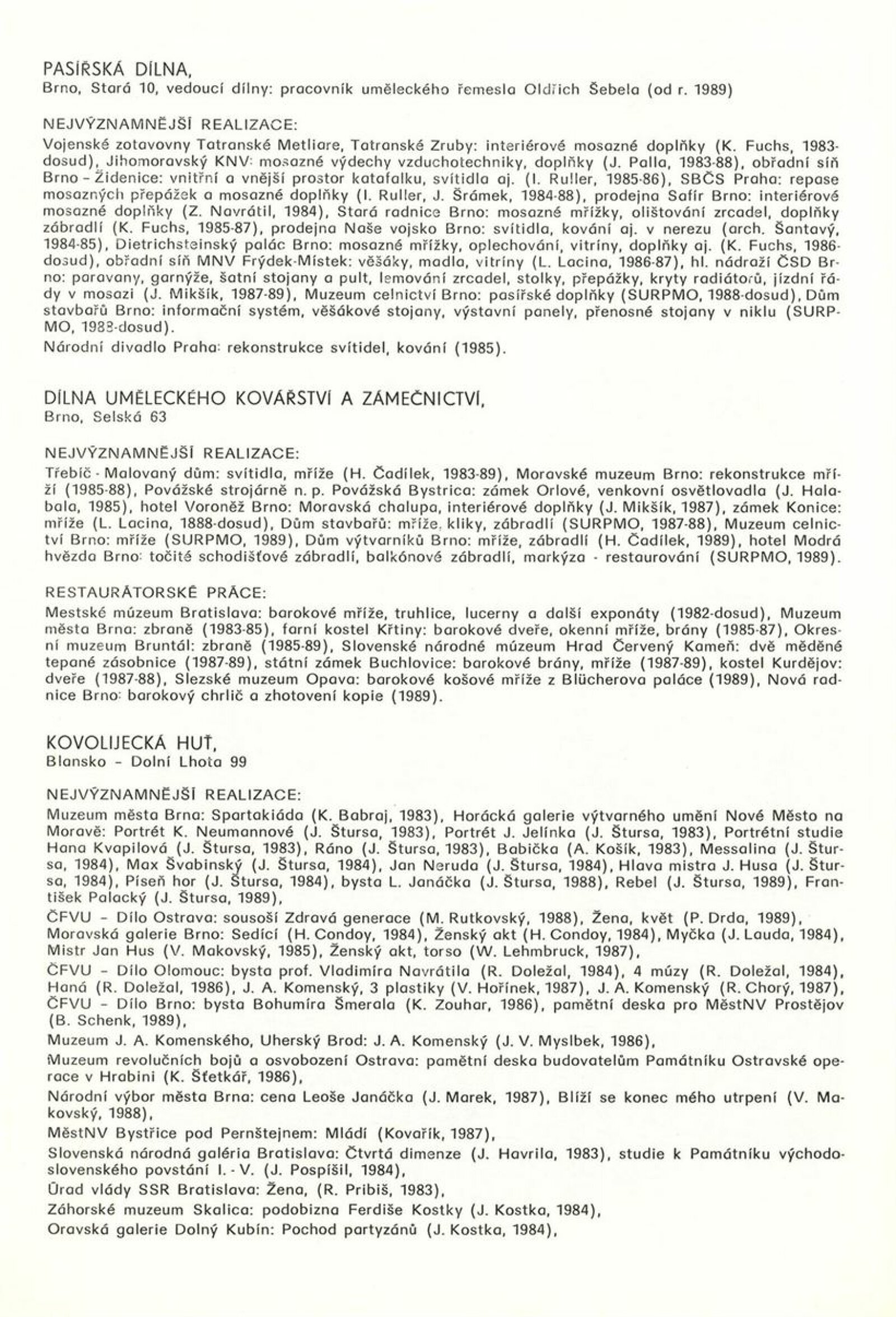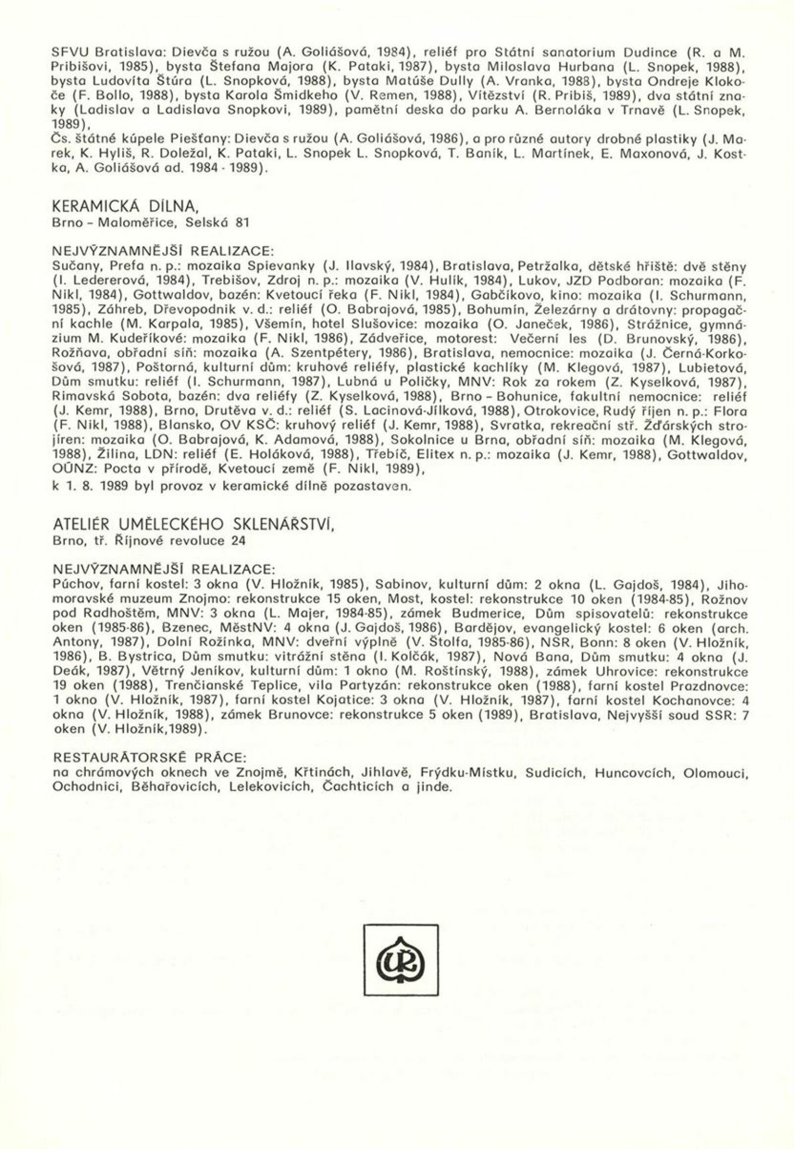 Podoby uměleckého řemesla. Ústředí uměleckých řemesel. Výstava k 35. výročí založení závodu Brno: Dům umění města Brna, 1. patro, 6. 12. 1989 – 7. 1. 1990 / Text: Kamil Augusta. – Brno: ÚUŘ, 1989. – [4] s., k jubileu a výstavě vydána publikace Ústředí uměleckých řemesel závod Brno / Text: Jaroslav Zelený. - Brno: ÚUŘ, 1989. – [52] s., obr., obsahuje přehled činnosti jednotlivých dílen, DU 878