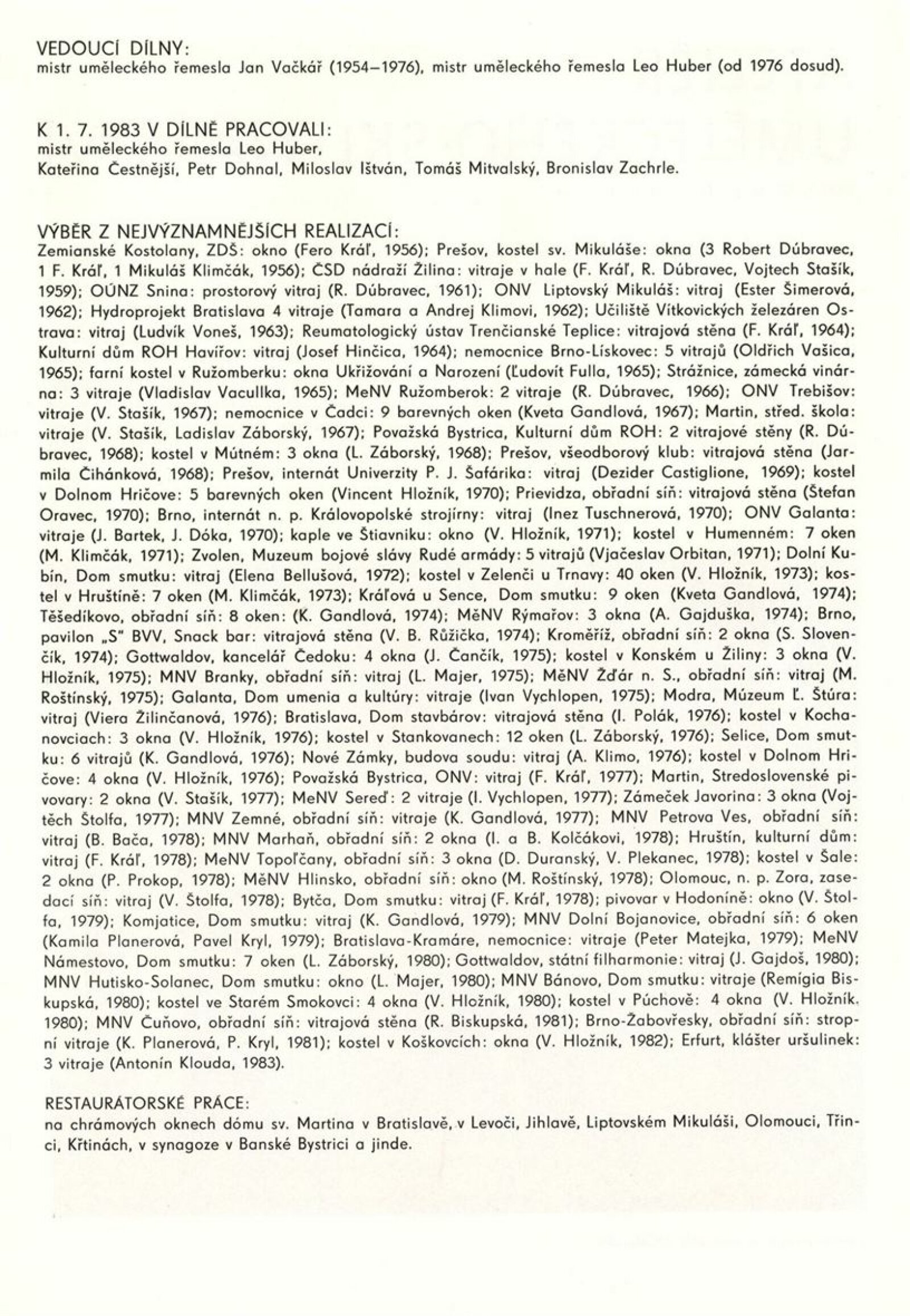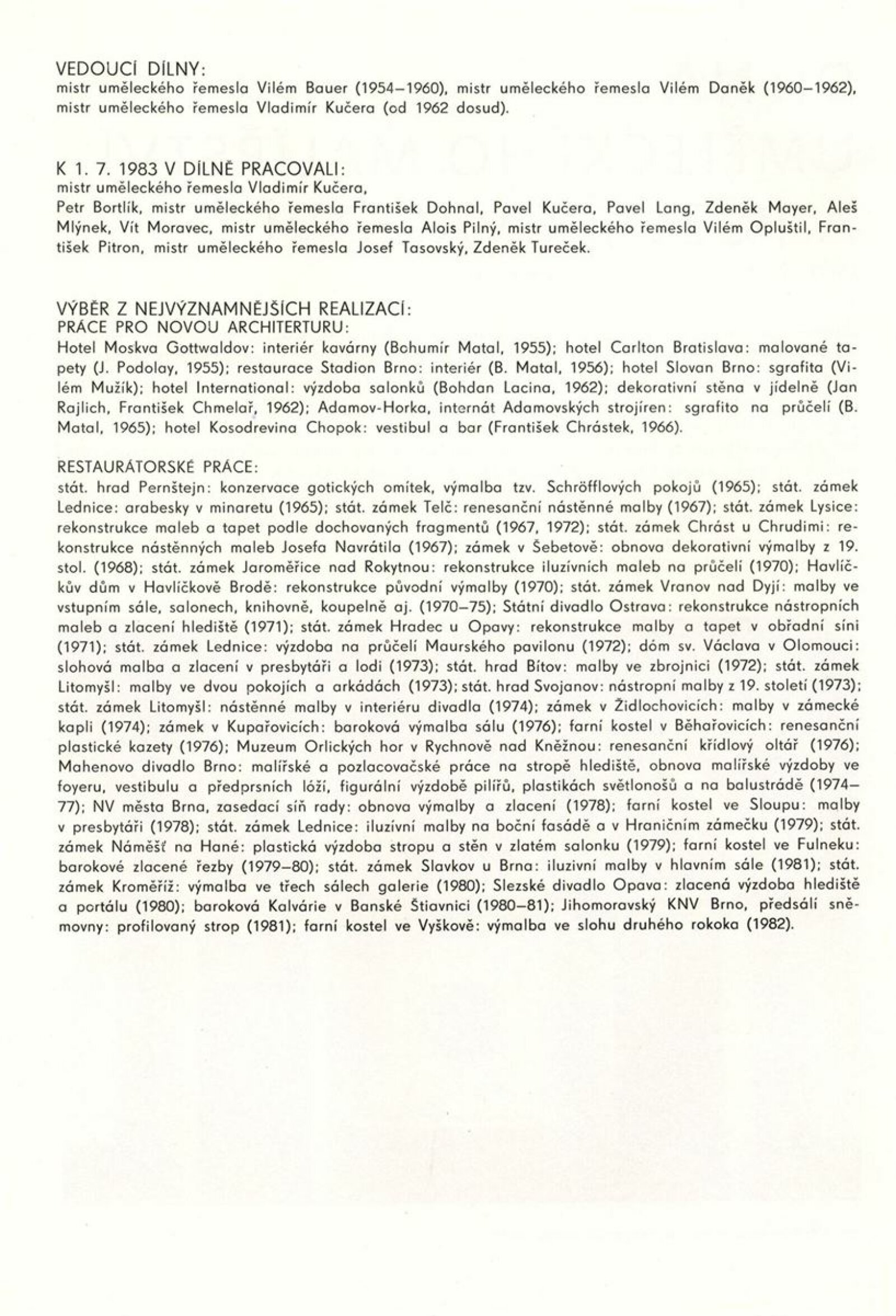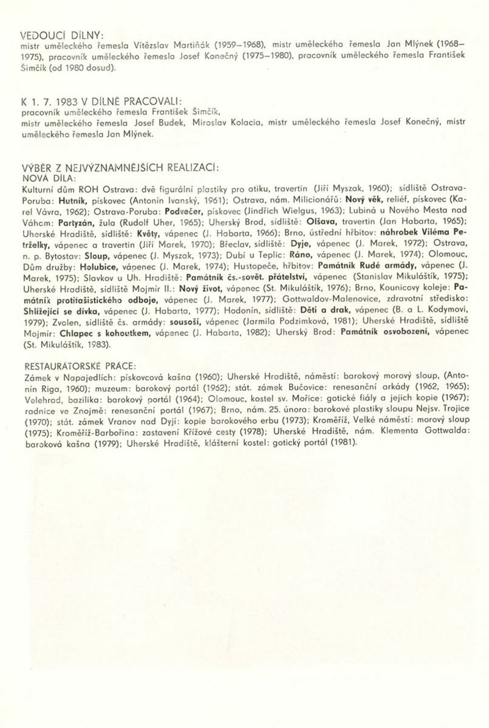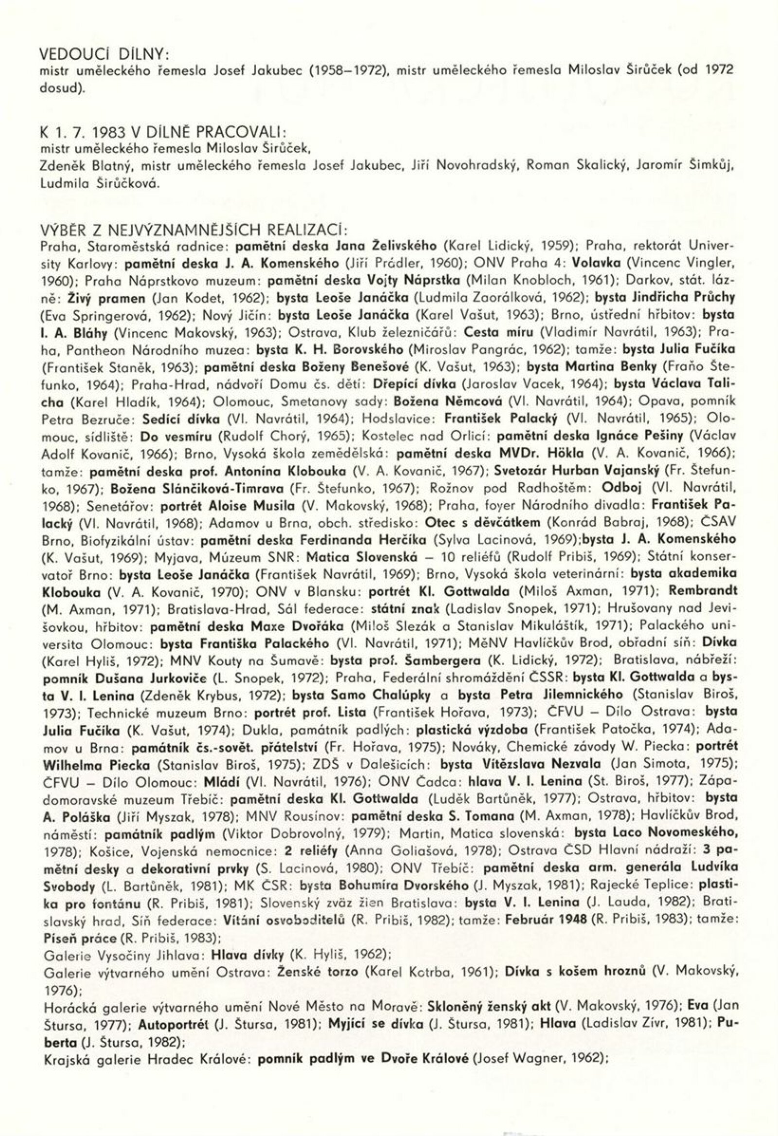 Podoby uměleckého řemesla. Ústředí uměleckých řemesel. Výstava k 35. výročí založení závodu Brno: Dům umění města Brna, 1. patro, 6. 12. 1989 – 7. 1. 1990 / Text: Kamil Augusta. – Brno: ÚUŘ, 1989. – [4] s., k jubileu a výstavě vydána publikace Ústředí uměleckých řemesel závod Brno / Text: Jaroslav Zelený. - Brno: ÚUŘ, 1989. – [52] s., obr., obsahuje přehled činnosti jednotlivých dílen, DU 878