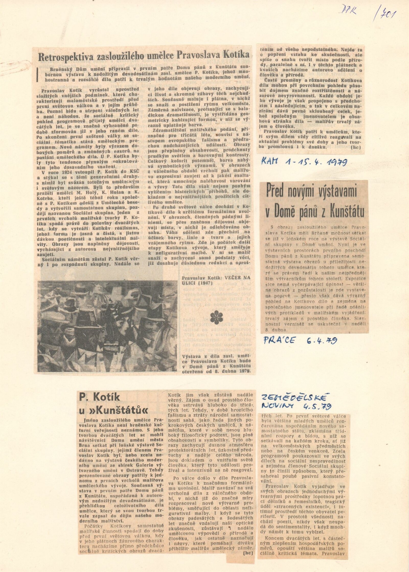 Pravoslav Kotík. Obrazy: Dům pánů z Kunštátu 8. 4. – 6. 5. 1979 / Text Jiřina Hockeová. - Brno: DUmB, - 16 s., obr. + Seznam vystavených prací 8 s. DPK 701; MZK; MG; MMB