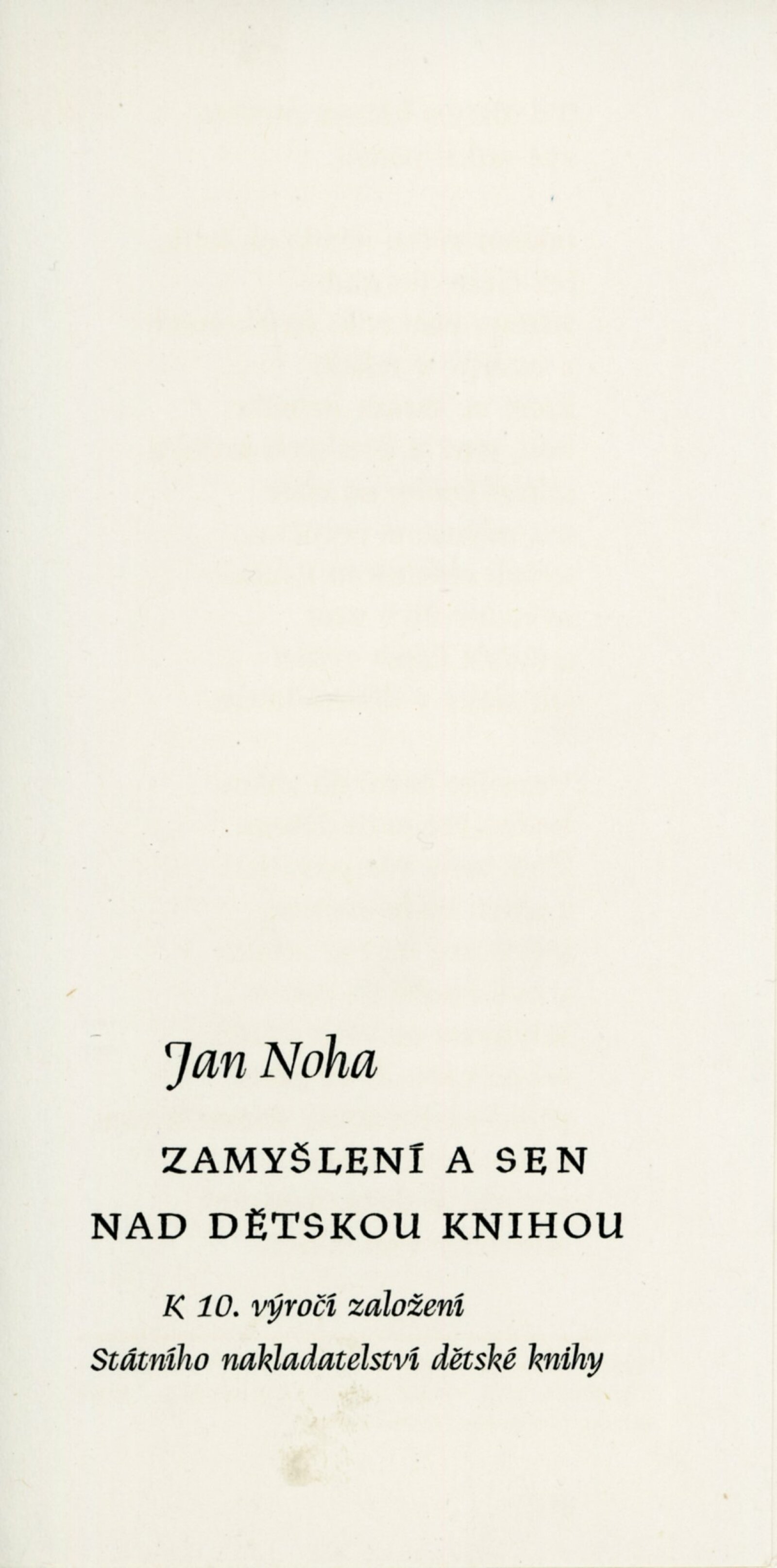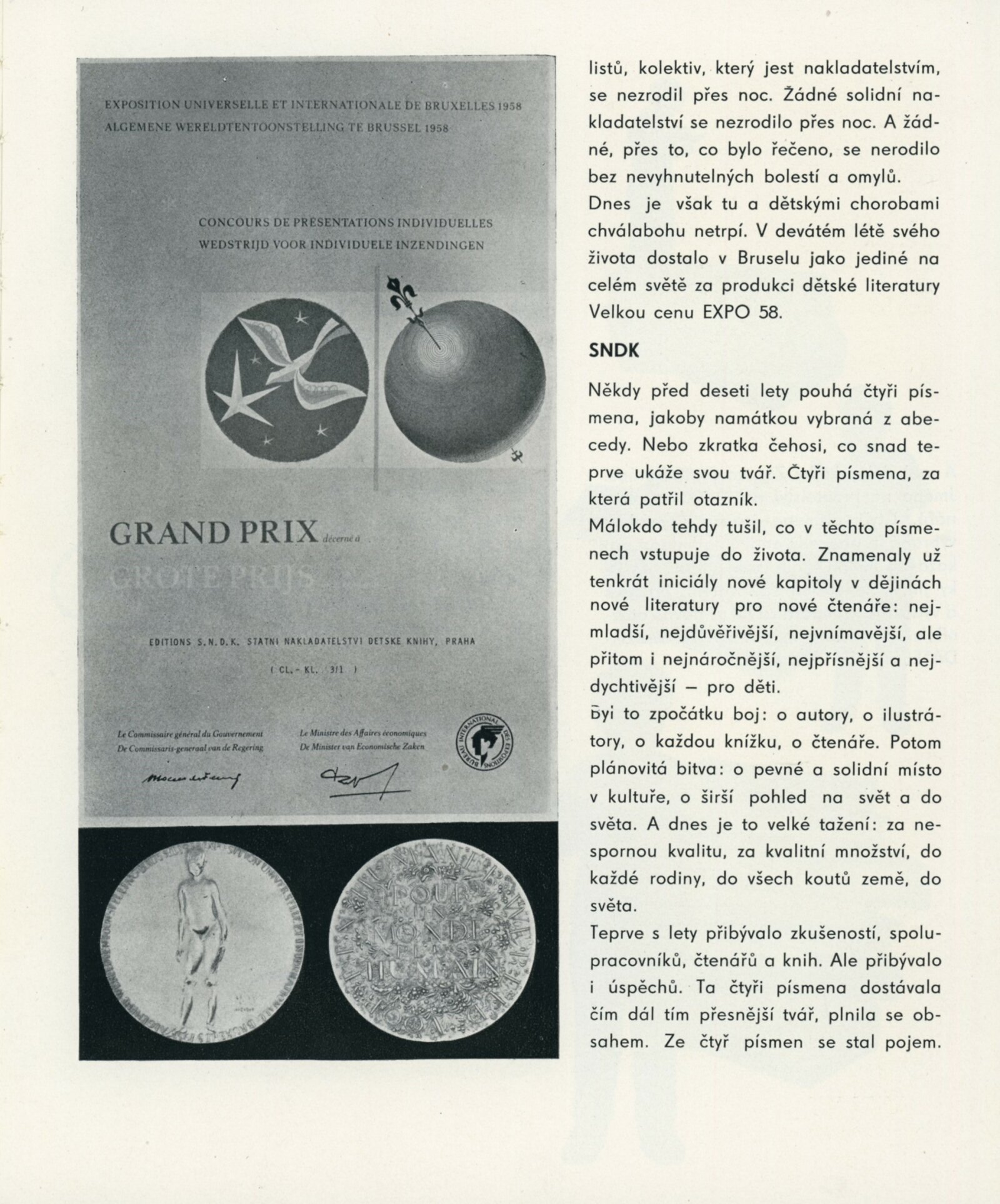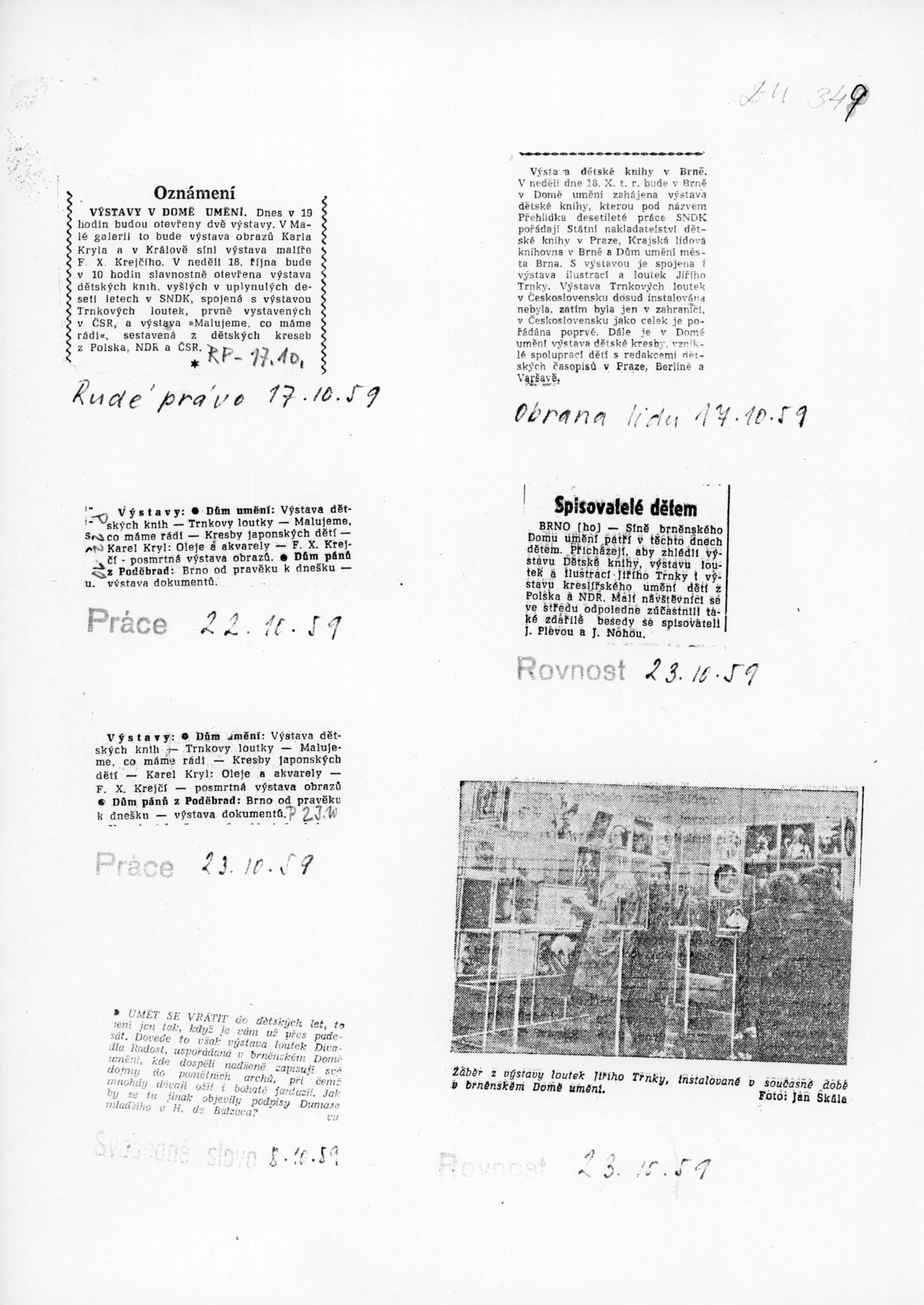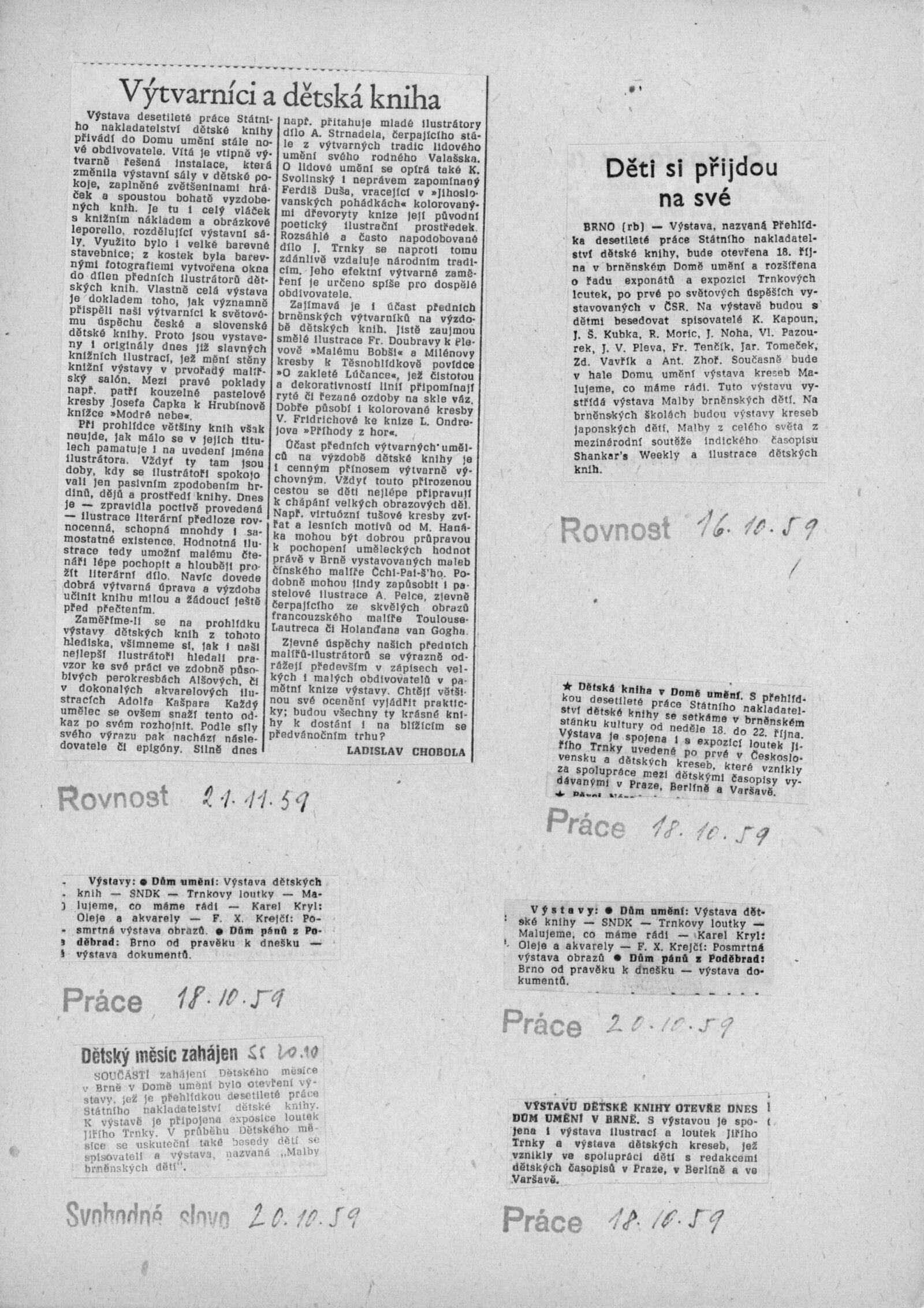 Přehlídka desetileté práce SNDK. Trnkovy loutky: Dům umění města Brna, 18. 10. – 22. 11. 1959. / K výstavě vydány příležitostné publikace. – DU 347–350: Milan Korejs – Vladimír Svoboda, Průvodce po Státním nakladatelství dětské knihy, Praha: SNDK, np., 1959. – 56 s., obr. Zamyšlení a sen nad dětskou knihou. K 10. výročí založení Státního nakladatelství dětské knihy. – Praha: SNDK, 1959. – 4 s., báseň Jan Noha