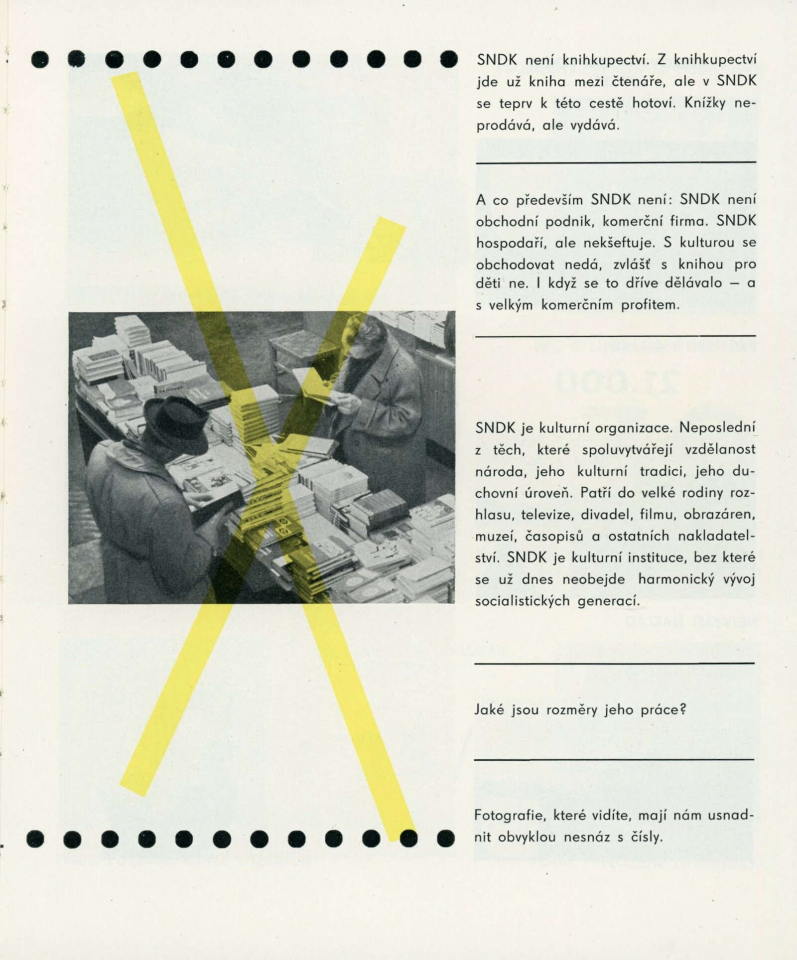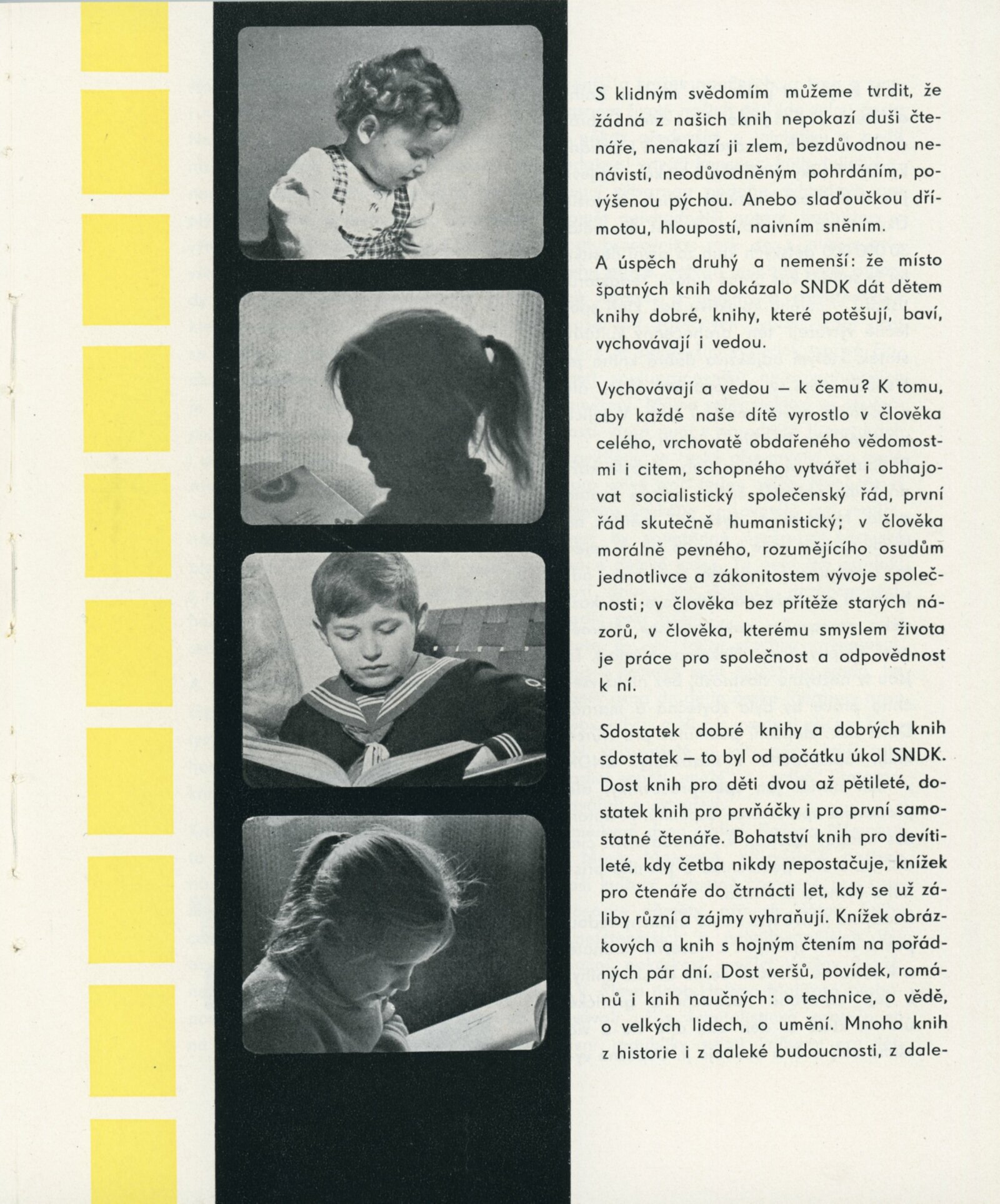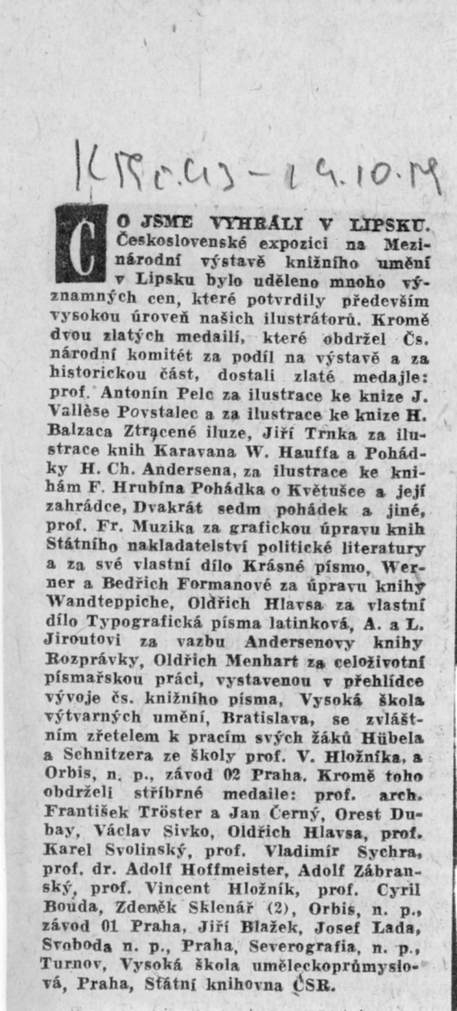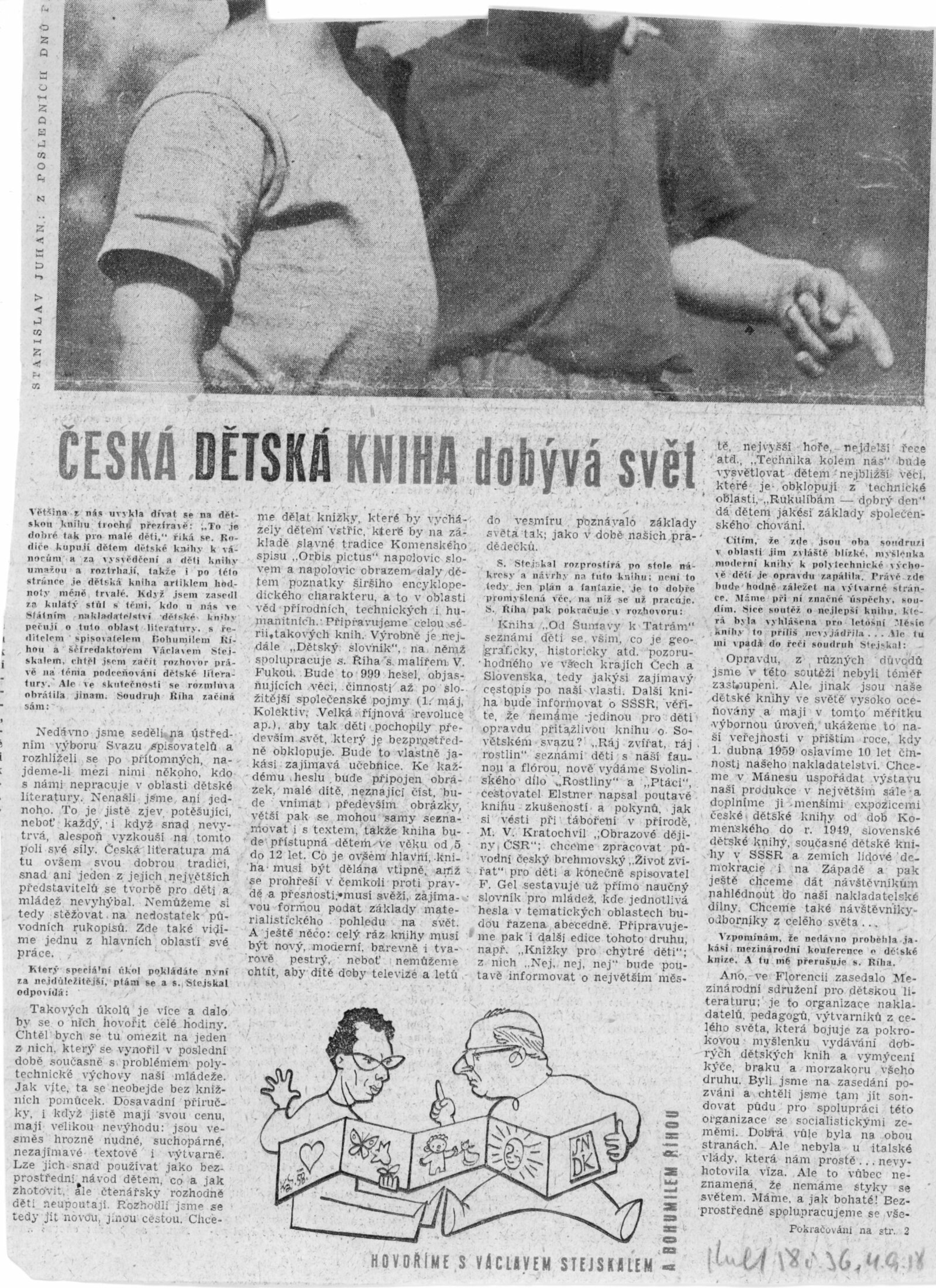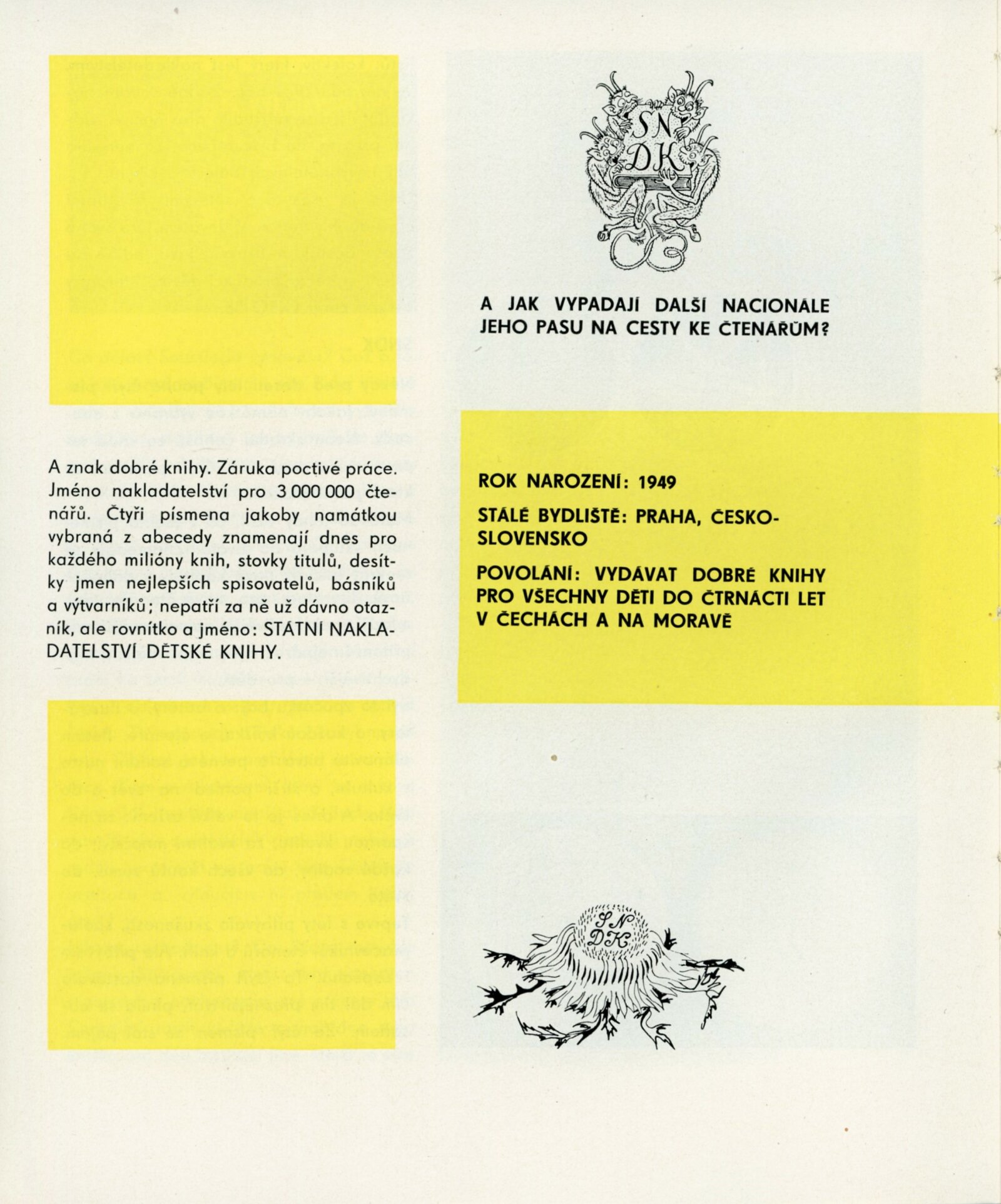 Přehlídka desetileté práce SNDK. Trnkovy loutky: Dům umění města Brna, 18. 10. – 22. 11. 1959. / K výstavě vydány příležitostné publikace. – DU 347–350: Milan Korejs – Vladimír Svoboda, Průvodce po Státním nakladatelství dětské knihy, Praha: SNDK, np., 1959. – 56 s., obr. Zamyšlení a sen nad dětskou knihou. K 10. výročí založení Státního nakladatelství dětské knihy. – Praha: SNDK, 1959. – 4 s., báseň Jan Noha