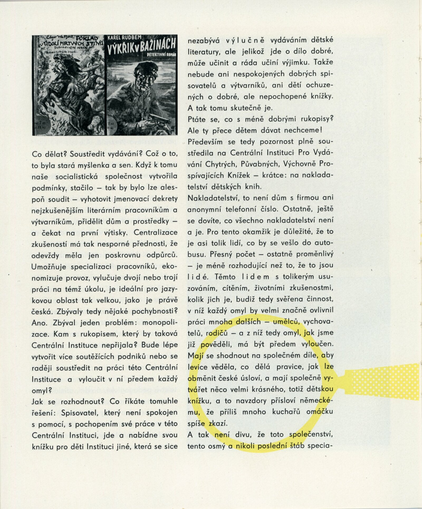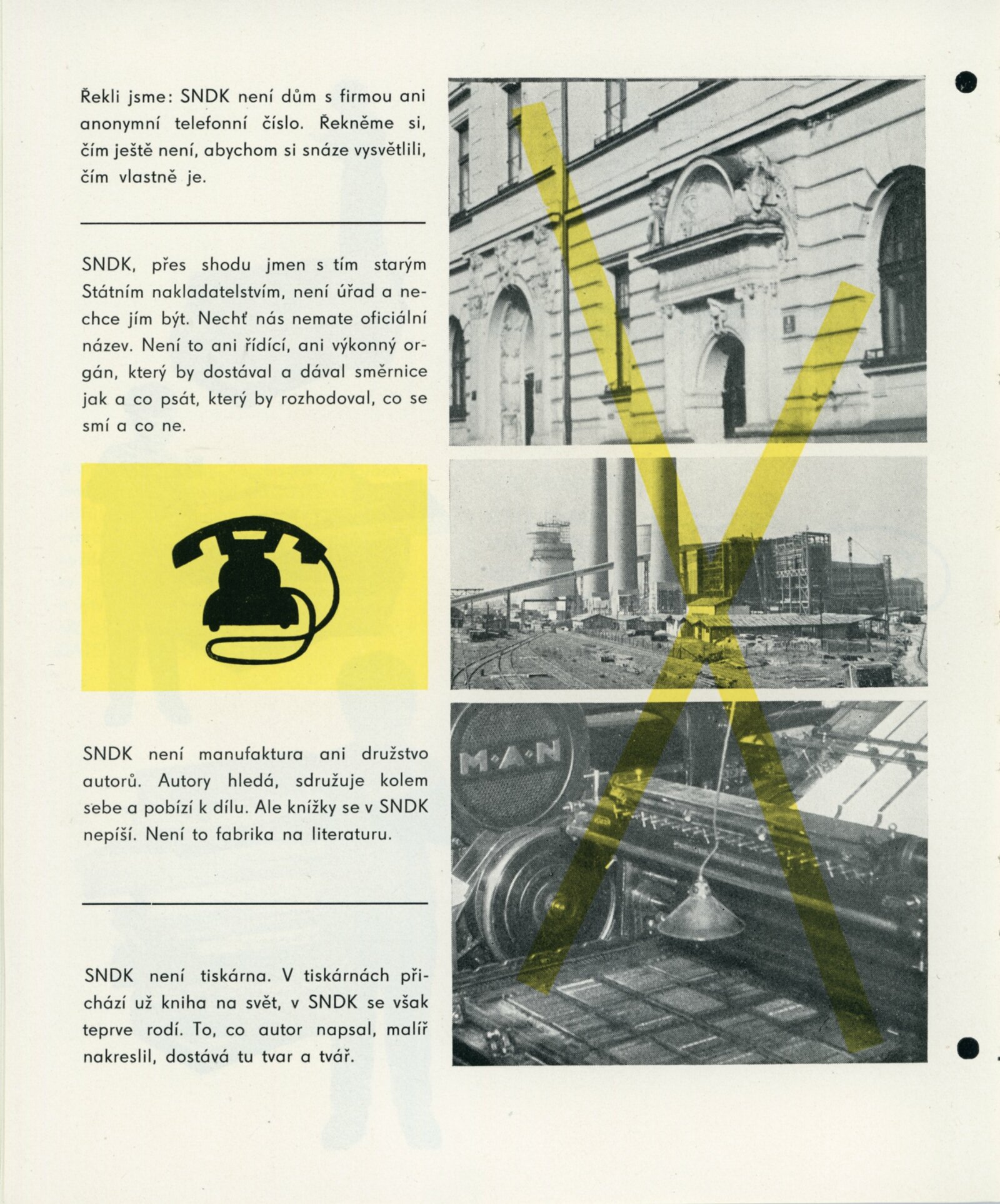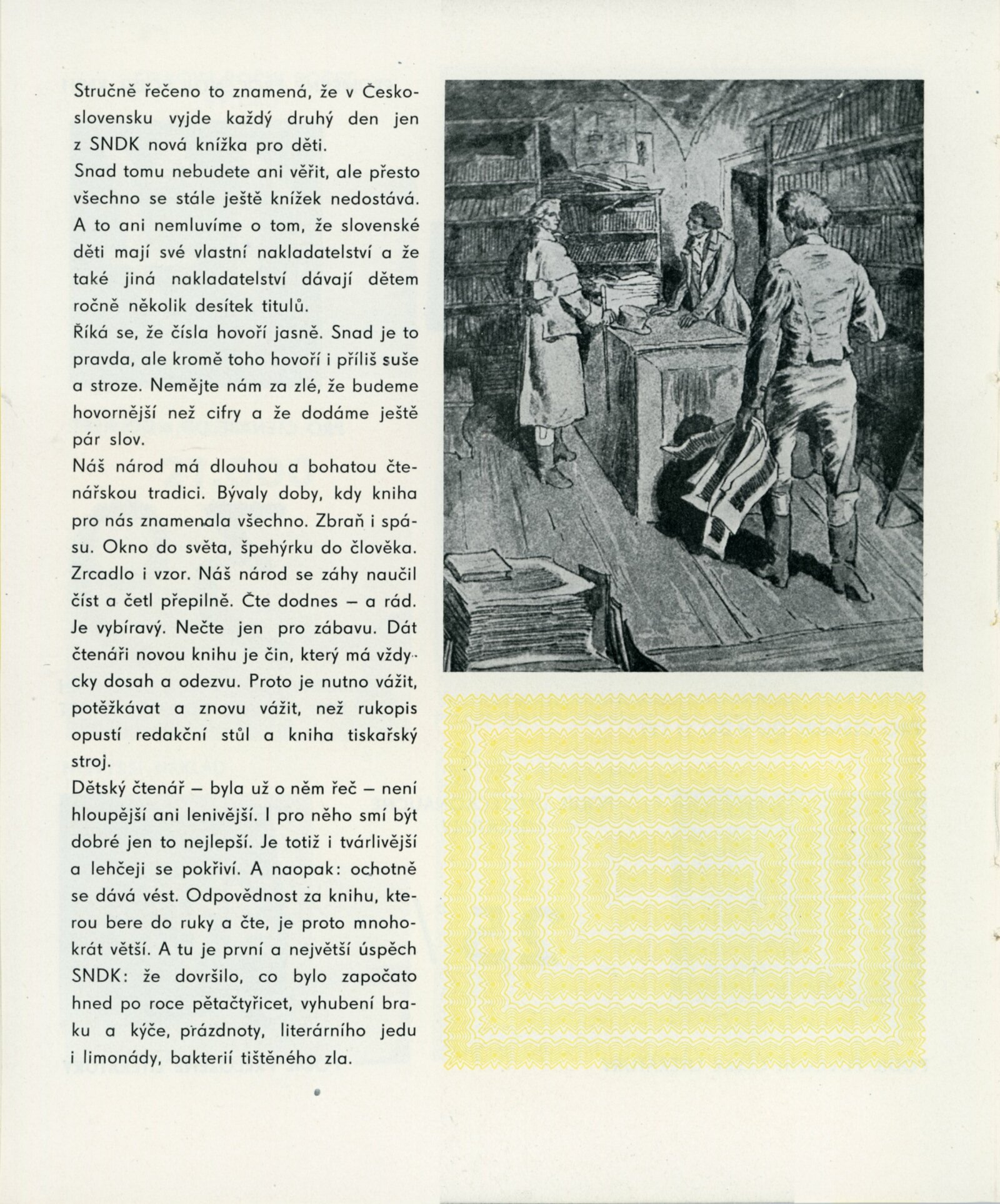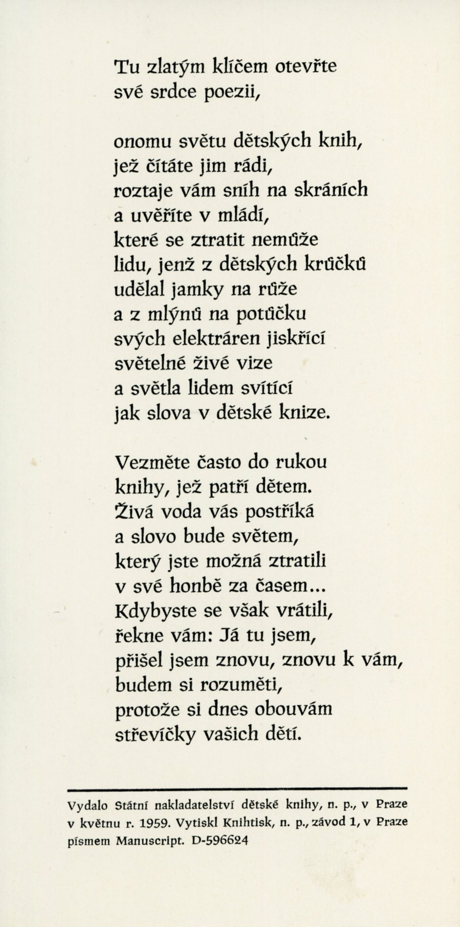 Přehlídka desetileté práce SNDK. Trnkovy loutky: Dům umění města Brna, 18. 10. – 22. 11. 1959. / K výstavě vydány příležitostné publikace. – DU 347–350: Milan Korejs – Vladimír Svoboda, Průvodce po Státním nakladatelství dětské knihy, Praha: SNDK, np., 1959. – 56 s., obr. Zamyšlení a sen nad dětskou knihou. K 10. výročí založení Státního nakladatelství dětské knihy. – Praha: SNDK, 1959. – 4 s., báseň Jan Noha
