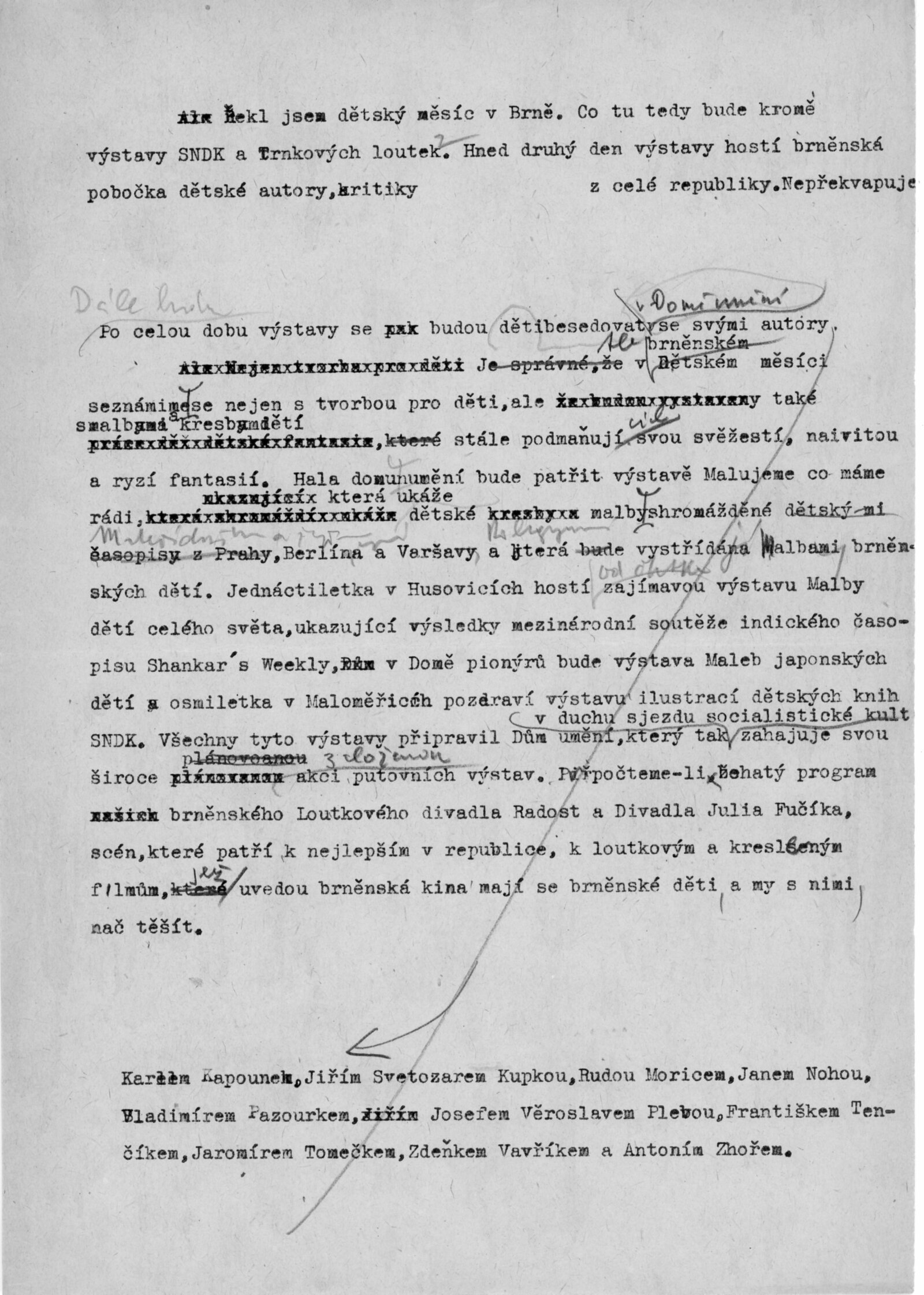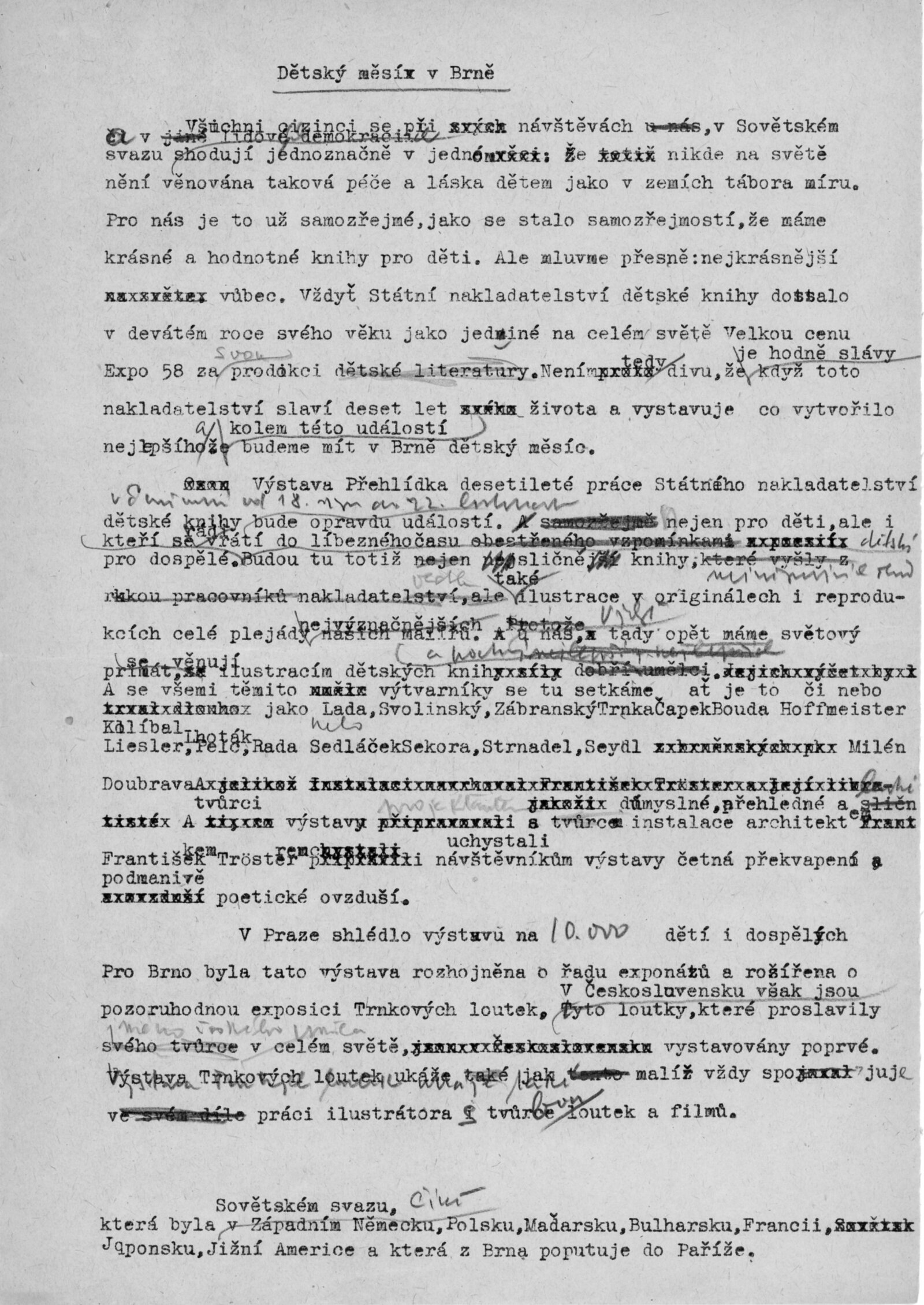 Architektem výstavy byl Zdeněk Rossmann. Výstava byla rozšířená o expozici Trnkových loutek, poprvé vystavených v Československu. Současně probíhala v hale Domu umění výstava kreseb Malujeme, co máme rádi, kterou připravily redakce dětských časopisů z Prahy, Berlína a Varšavy. Výstavy realizovány v rámci oslav Dětského měsíce v Brně v roce 1959.