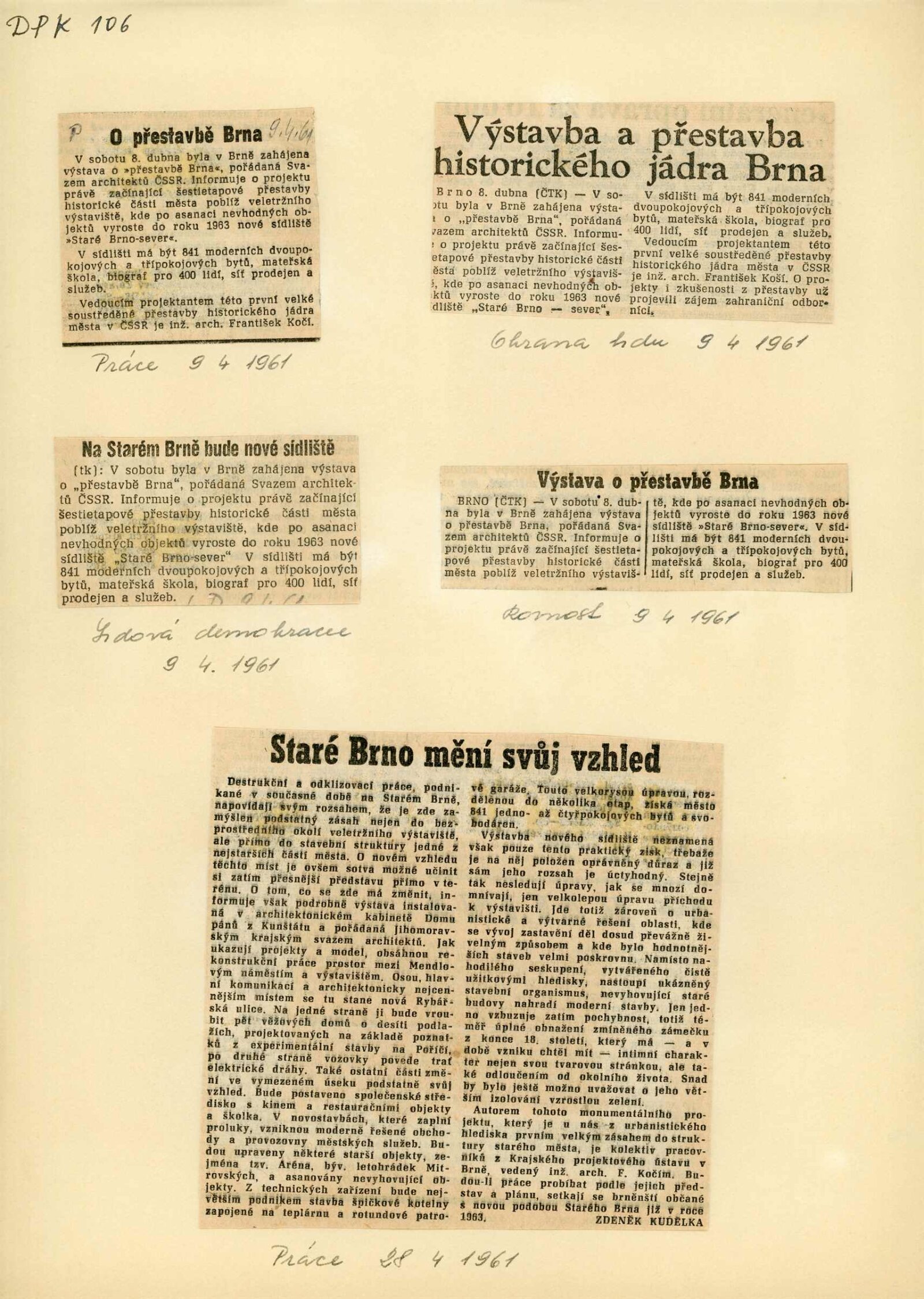Přestavba Brna. Projekt sídliště Staré Brno–sever: Dům umění města Brna / Dům pánů z Kunštátu, 14. výstava Kabinetu architektury Svazu architektů ČSSR, 8. 4. – 27. 4. 1961 / Brno: Svaz architektů ČSSR, 1961. – 4 s., obr., DPK 106
