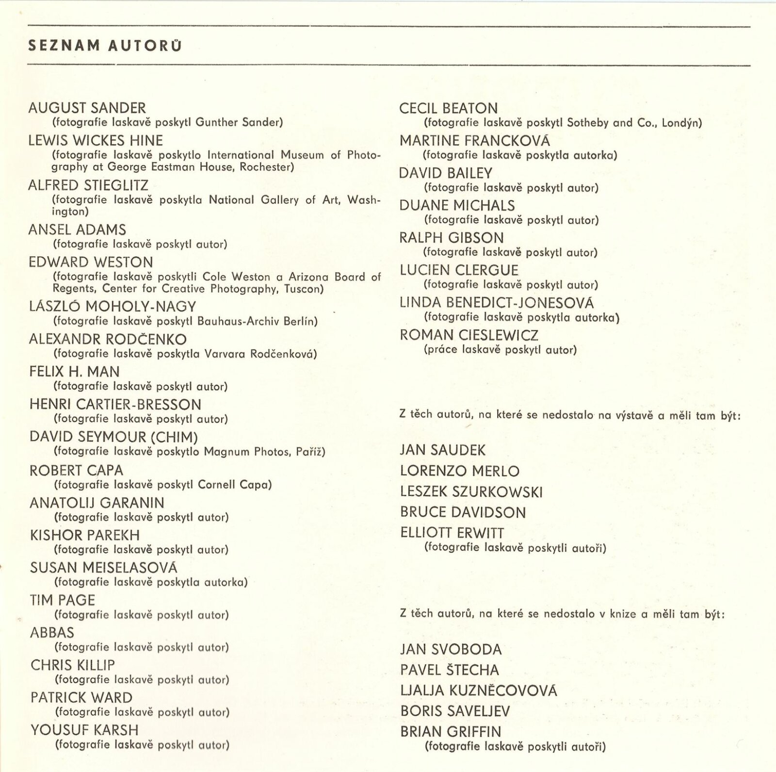 Abbas, Ansel Adams, David Bailey, Cecil Beaton, Linda Benedict-Jonesová, Robert Capa, Henri Cartier-Bresson, Roman Cieslewicz, Lucien Clergue, Martine Francková, Anatolij Garanin, Ralph Gibson, Yousuf Karsh, Chris Killip, Felix H. Man, Duane Michals, Susan Meiselasová, László Moholy-Nagy, Tim Page, Kishor Parekh, Alexandr Rodčenko, August Sander, David Seymour, Alfred Stieglitz, Patrick Ward, Edward Weston, Lewis Wickes Hine
