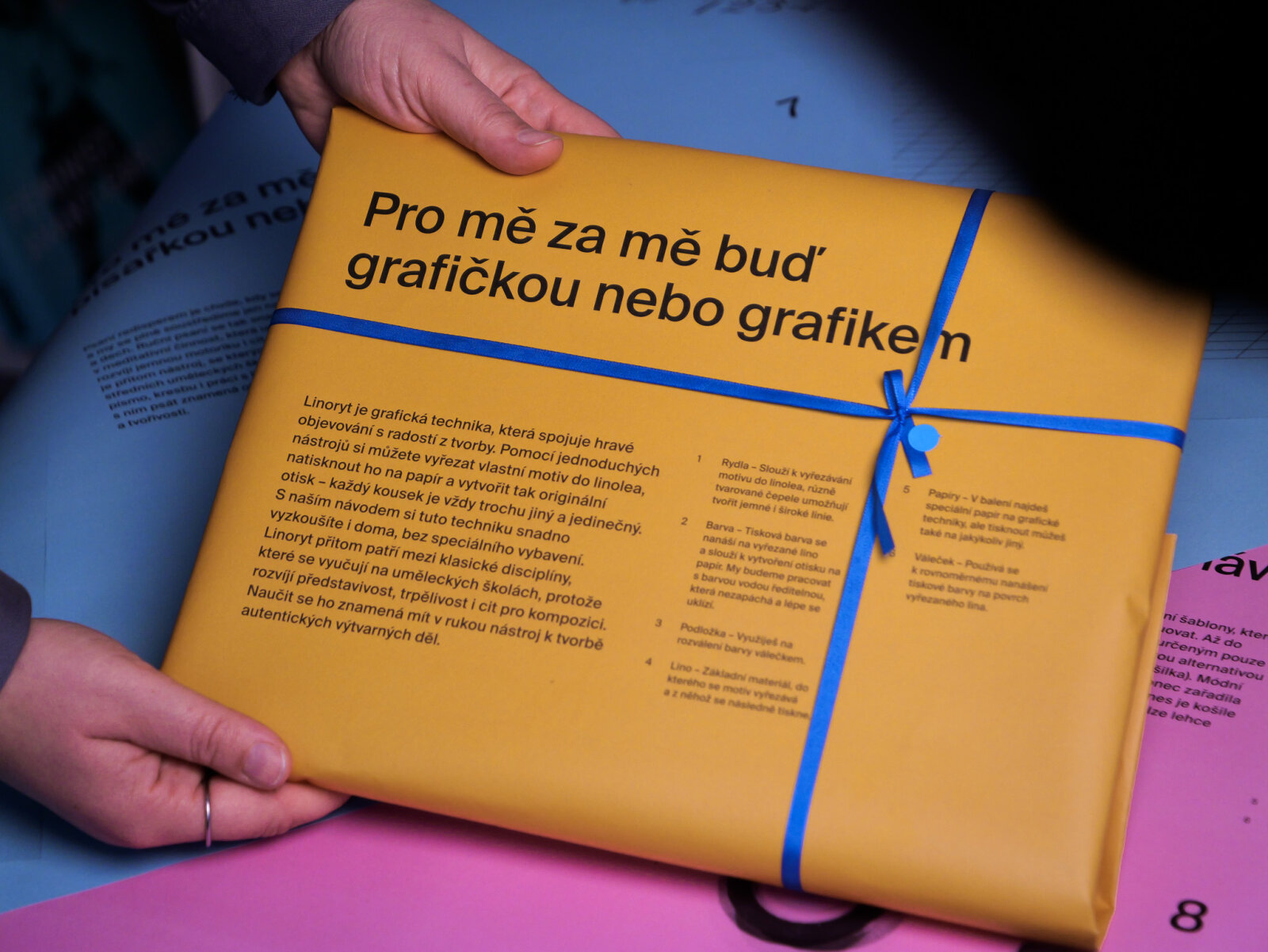 Balíček obsahuje podrobný postup a všechny potřebné rady spolu s těmito pomůckami: lino, rozval, rydlo, váleček, grafické papíry, čtvrtky, barva