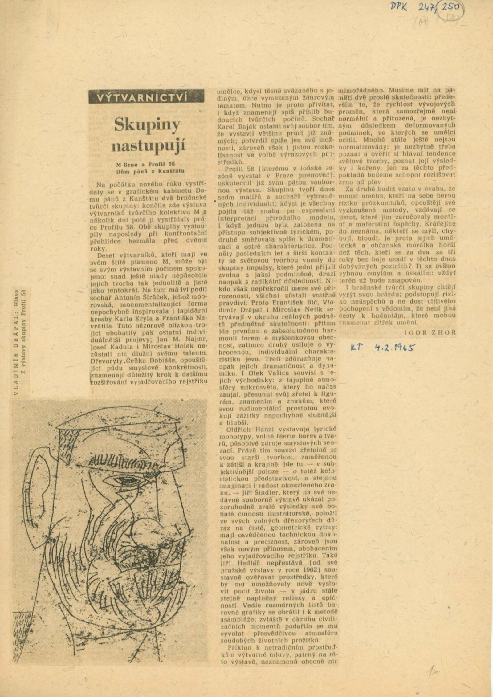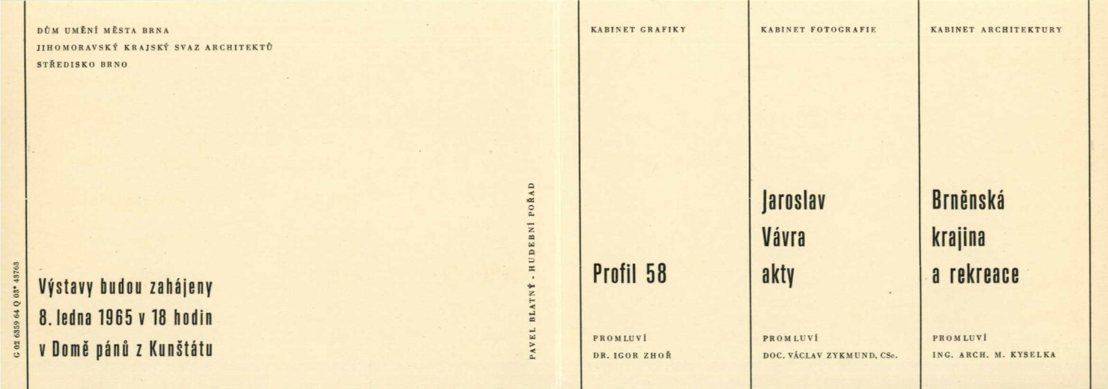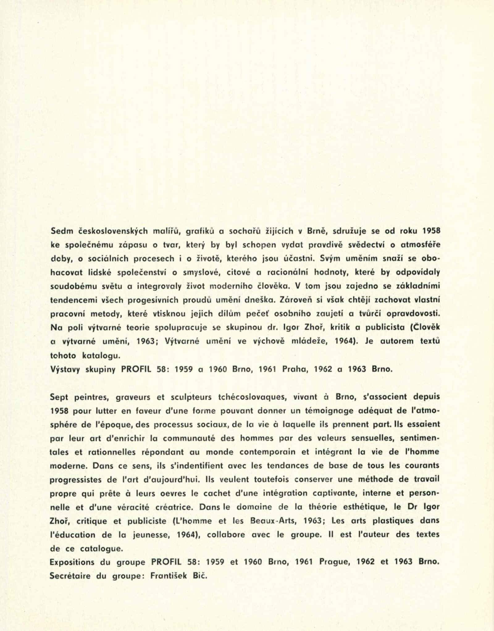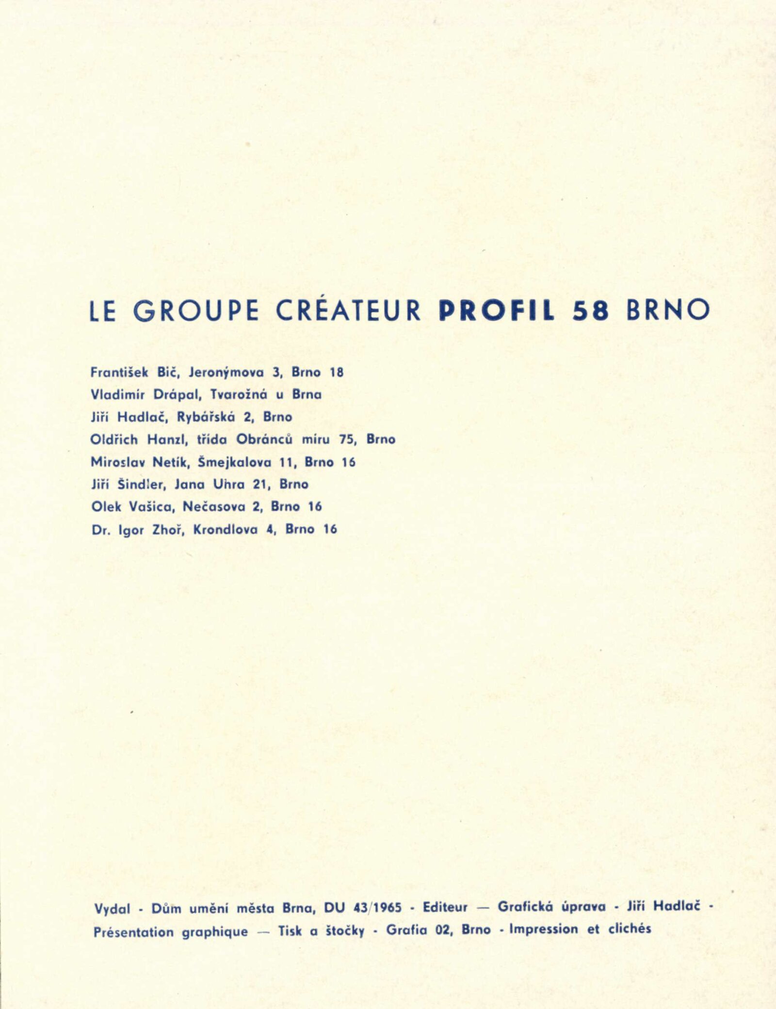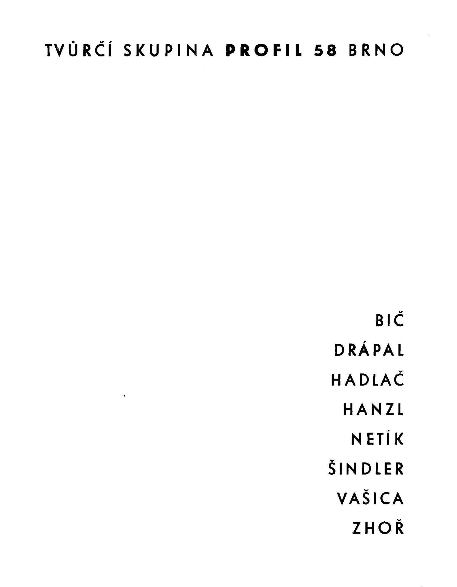 Tvůrčí skupina Profil 58 Brno: Dům umění města Brna / Dům pánů z Kunštátu, 8. 1. – 31. 1. 1965 / Text: Igor Zhoř. – Brno: DUMB, 1965. – 16 s., obr., DPK 250
