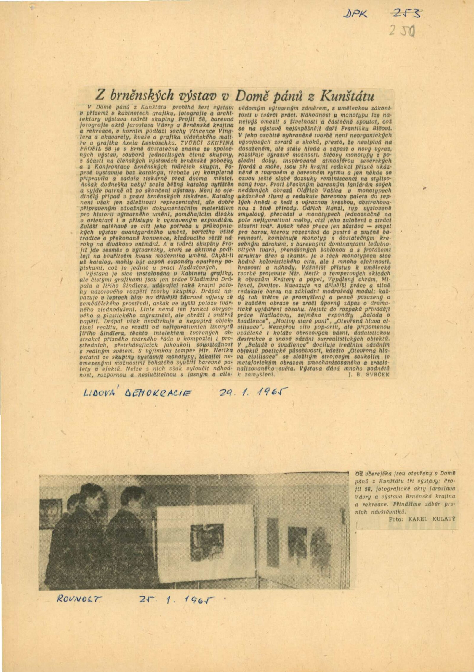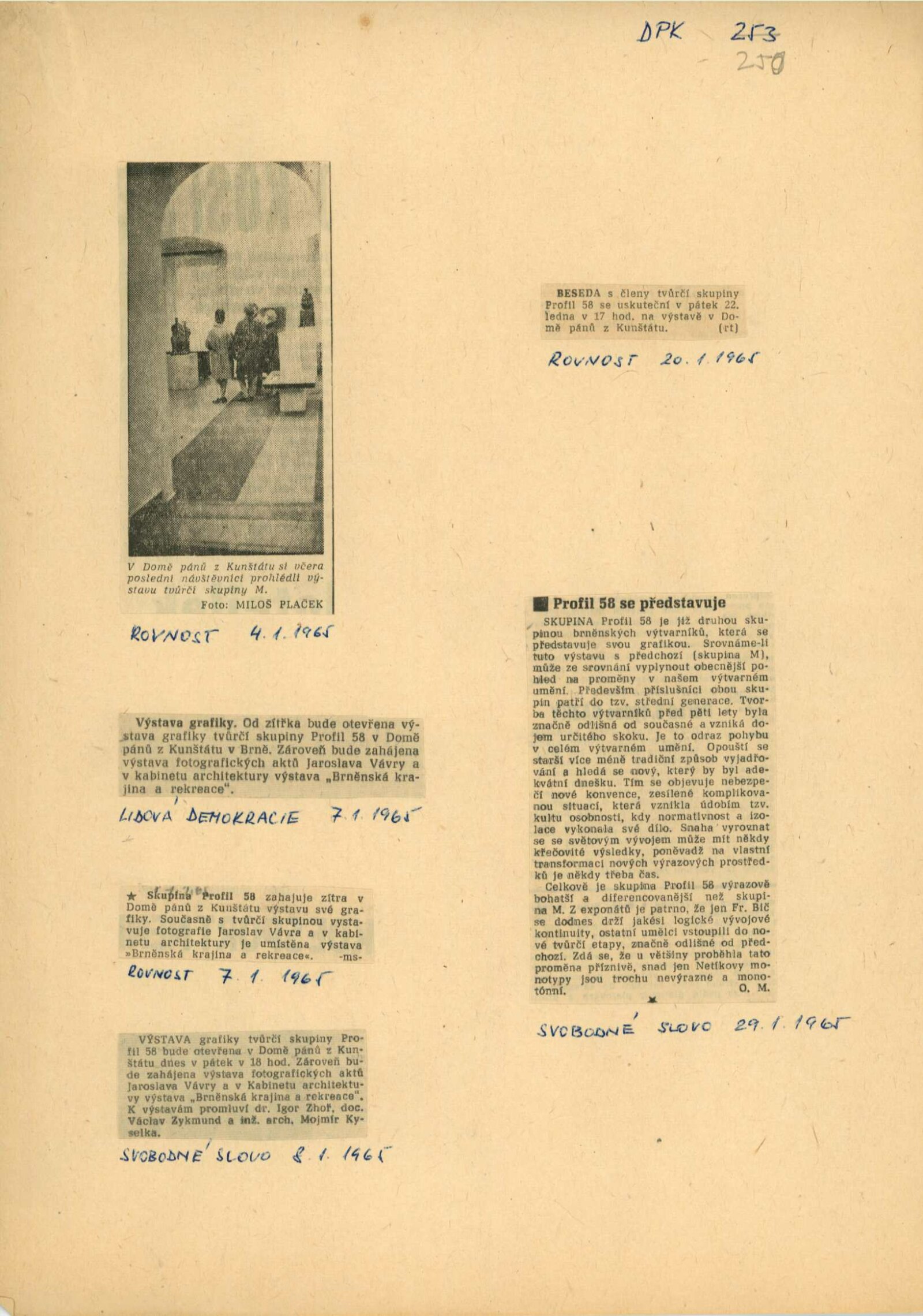 společná pozvánka DPK 250–252, katalog, strojopis katalogu, medailony umělců (ČJ, FJ), provozní korespondence, recenze v tisku