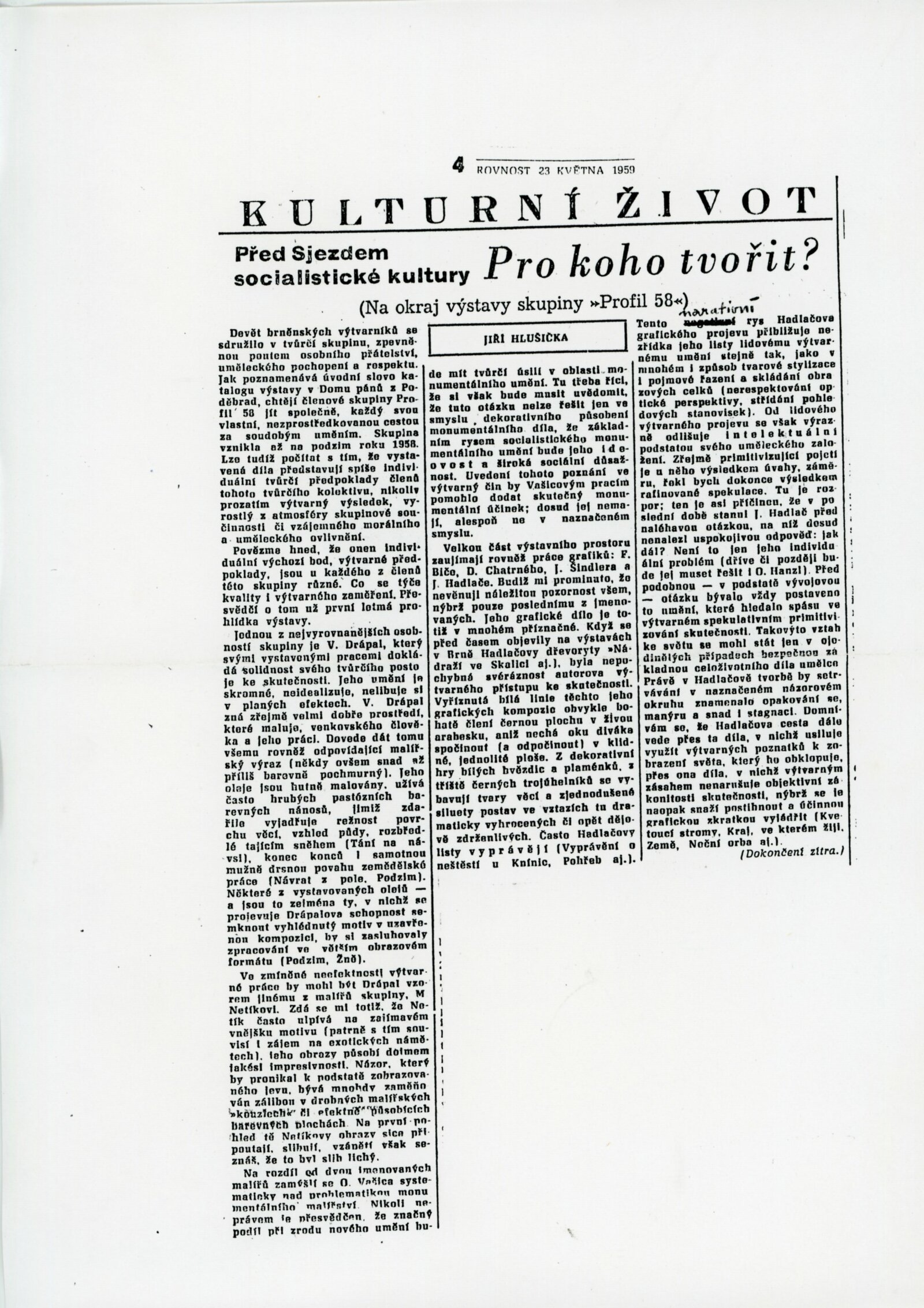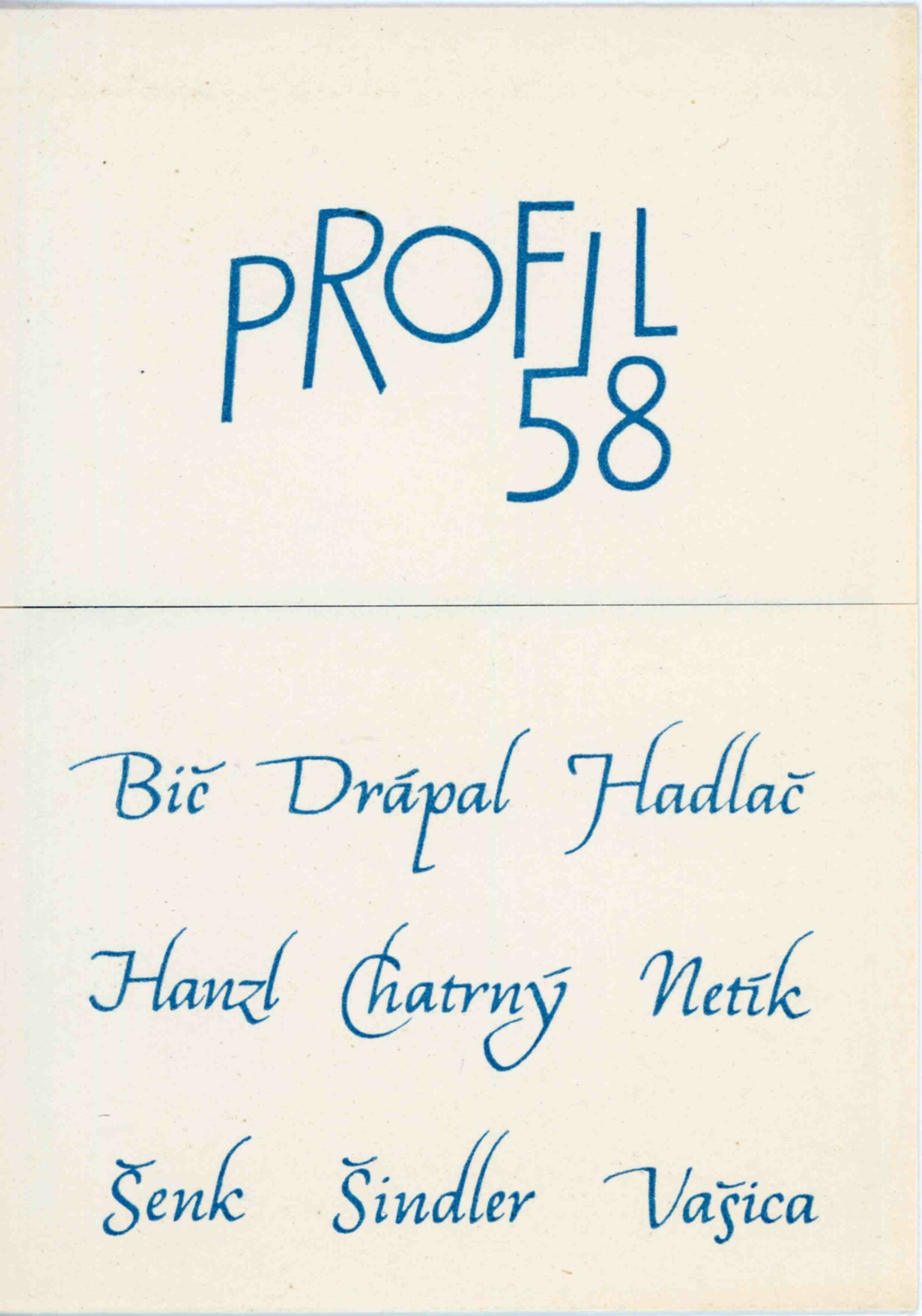 Výstava skupiny Profil 58 v tehdejším Domě pánů z Poděbrad na jaře roku 1959 byla prvním společným vystoupením nové brněnské umělecké skupiny, která byla založena na podzim předcházejícího roku. Skupina vznikla v období, kdy po téměř deseti letech politického tlaku a kontroly vládnoucí komunistické strany tehdejšího socialistického Československa s dogmatickými požadavky na socialistický realismus v umění docházelo k pozvolnému a postupnému uvolňování. Ve druhé polovině padesátých let byl vlivem nové organizační struktury Svazu československých výtvarných umělců, zastřešující monopolní organizace dohlížející na ideologickou náplň ve výtvarné kultuře, umožněn vznik ideových skupin umělců a následné zakládání menších tvůrčích skupin. Skupiny musely být registrovány a garantovány členem Svazu a poté mohly vystavovat nejen jako součást svazových přehlídek, ale také v menších, názorově spřízněných skupinových výstavách. Program jednotlivých skupin, v Praze to byl například Máj 57 nebo Trasa 54 a v Brně vedle Profilu Brno 57 a o pár let později M Brno a Parabola, byl často v počátku formulován obecně a sdružoval především spřátelené okruhy výtvarníků, kteří hledali adekvátní soudobý výtvarný projev navazující na umělecké postupy předválečné moderny. Výtvarníci se pravidelně setkávali v ateliérech a živě diskutovali o situaci současného umění a jeho směřování v české i světové tvorbě. Na společných výstavách měli příležitost konfrontovat své tvůrčí výsledky a získávat reflexi veřejnosti i odborné obce. První výstava skupiny Profil 58 představila ve výstavních sálech ukázky z aktuální tvorby všech svých zakládajících členů - malířů, grafiků a sochařů - Františka Biče, Vladimíra Drápala, Jiřího Hadlače, Oldřicha Hanzla, Dalibora Chatrného, Miroslava Netíka, Františka Šenka, Jiřího Šindlera a Olega Vašicy. Krátce po založení skupiny se jednalo spíše o díla individuálních uměleckých pozic, které teoretik skupiny Igor Zhoř popsal v katalogu výstavy jako “vlastní, nezprostředkované cesty k soudobému umění”. Společným rysem jinak svébytných umělců byl zájem o subjektivní a smyslové vnímání skutečnosti, nikoliv jeho pouhý neosobní popis. Dobové recenze Františka Kubišty nebo Jiřího Hlušičky hodnotily kladně představení mladé umělecké generace a ocenili její úsilí k osobitému uměleckému přehodnocení viděné skutečnosti. Právě z těchto důvodů byla výstava kritizována z ideologických pozic a zastánci oficiální kultury se setkali se členy skupiny přímo na výstavě, kde požadovali debatu nad orientací jejich umělecké tvorby. Skupina Profil 58 působila po celá následující šedesátá léta a pravidelně vystavovala (např. v roce 1961 v Praze, v roce 1963 na přehledové výstavě Konfrontace brněnských tvůrčích skupin (Dům umění města Brna) nebo v roce 1965 v grafickém kabinetu Domu pánů z Kunštátu). Složení skupiny se v průběhu let nepatrně proměňovalo (Dalibor Chatrný přešel do skupiny Parabola, novým členem skupiny se stal Leonid Ochrymčuk), ale větší část členů zde působila po celou dobu její existence. Na konci šedesátých let se Profil 58 z důvodu politických událostí a zvýšení ideologických tlaků sdružil s ostatními skupinami do Bloku brněnských tvůrčích skupin, který se v roce 1969 ještě společně představil na výstavě v Domě umění. Poslední výstava skupiny se uskutečnila v roce 1971 v Praze, byla již ale předčasně ukončena. Činnost uměleckých skupin byla z důvodu obnovené centralizované politické a ideologické kontroly nastupující normalizace na dlouhou dobu zakázána. (ms)