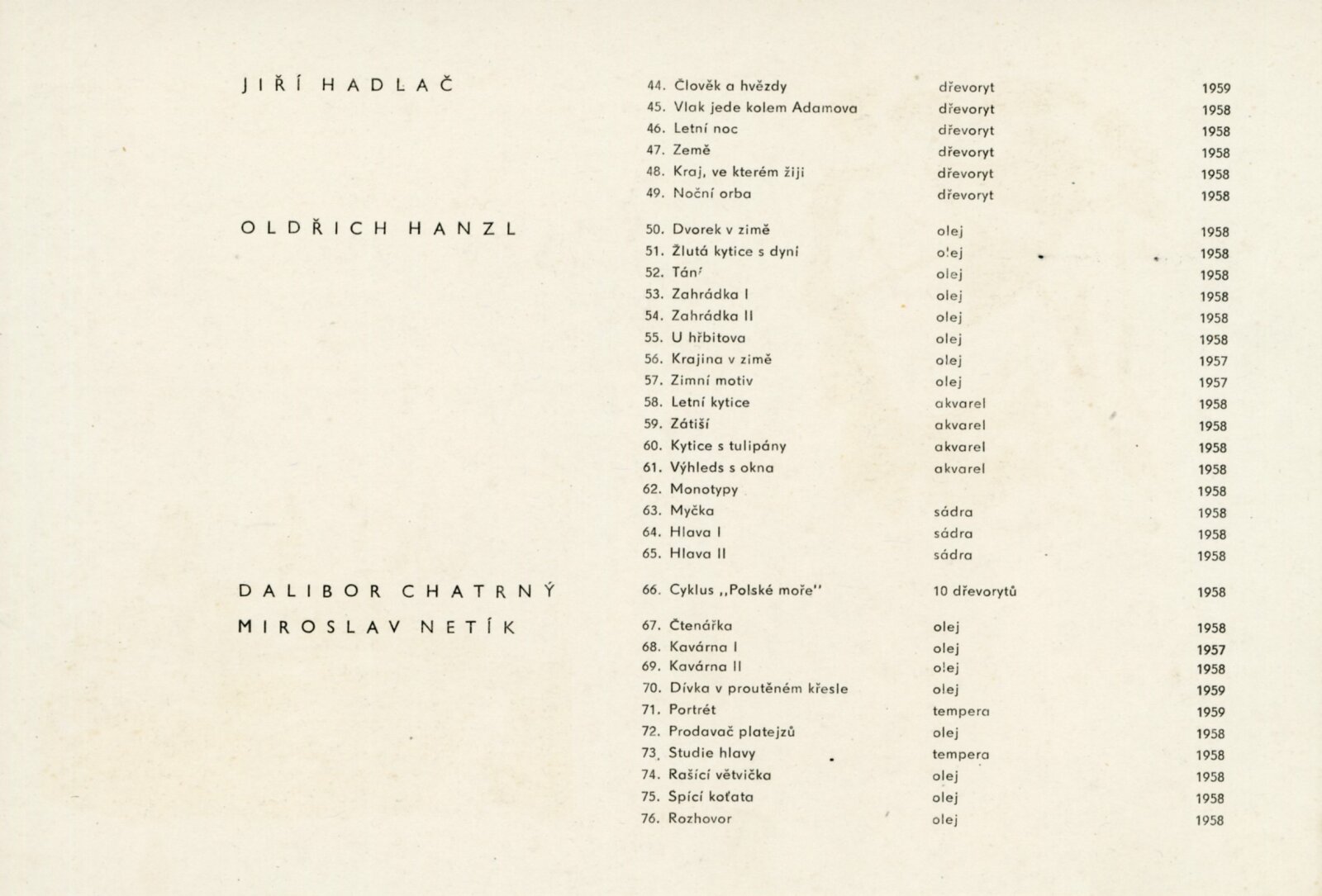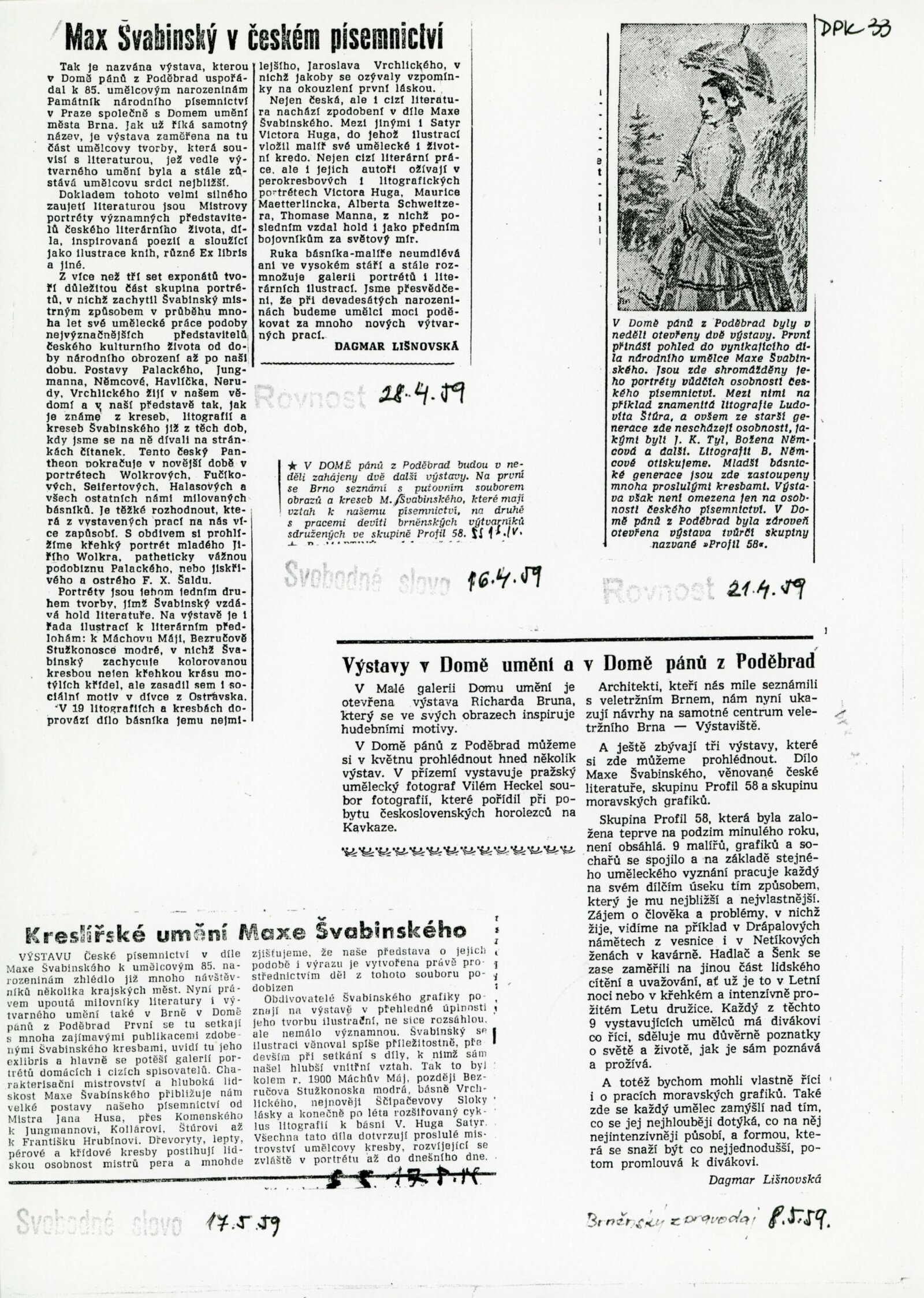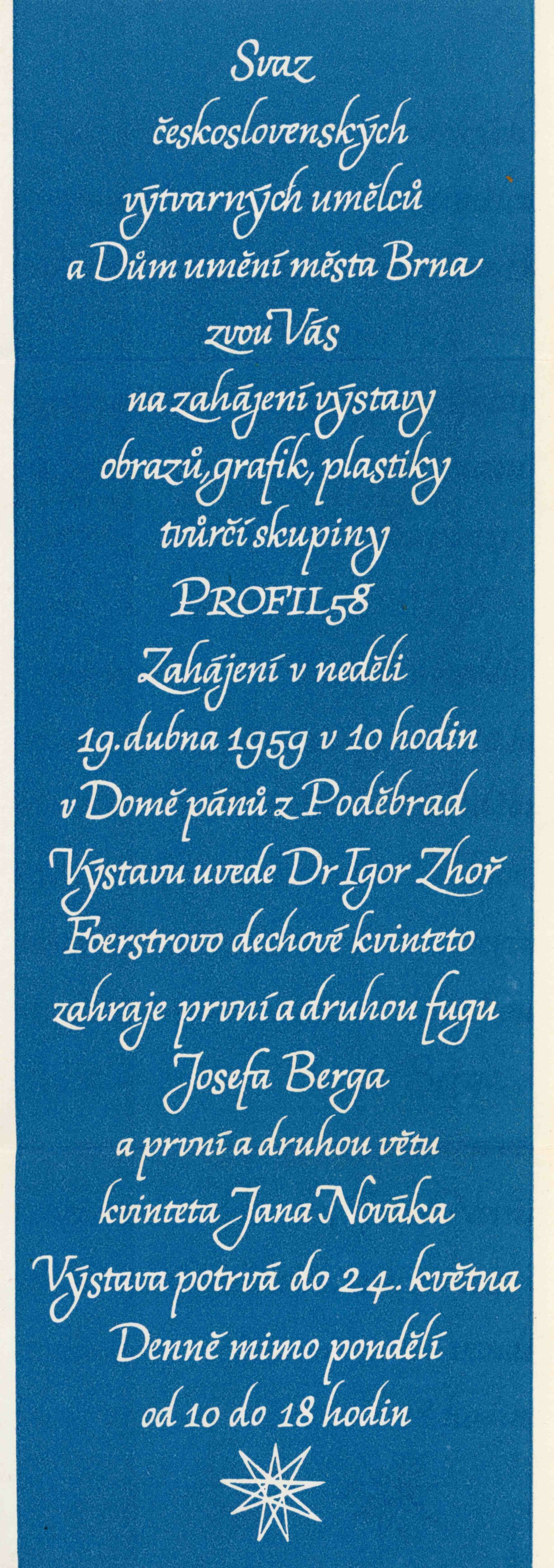 Profil 58: Dům umění města Brna / Dům pánů z Poděbrad v Brně, 19. 4. – 24. 5. 1959 / Text: Igor Zhoř. – Brno: DUmB, 1959. – 8 s., obr., DPK 33. – MG; MZK