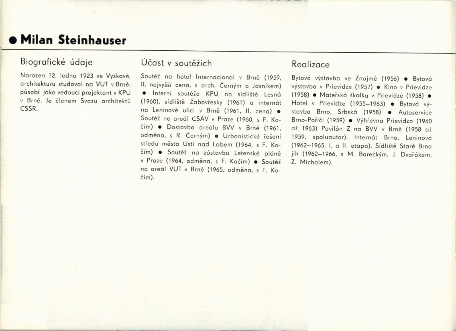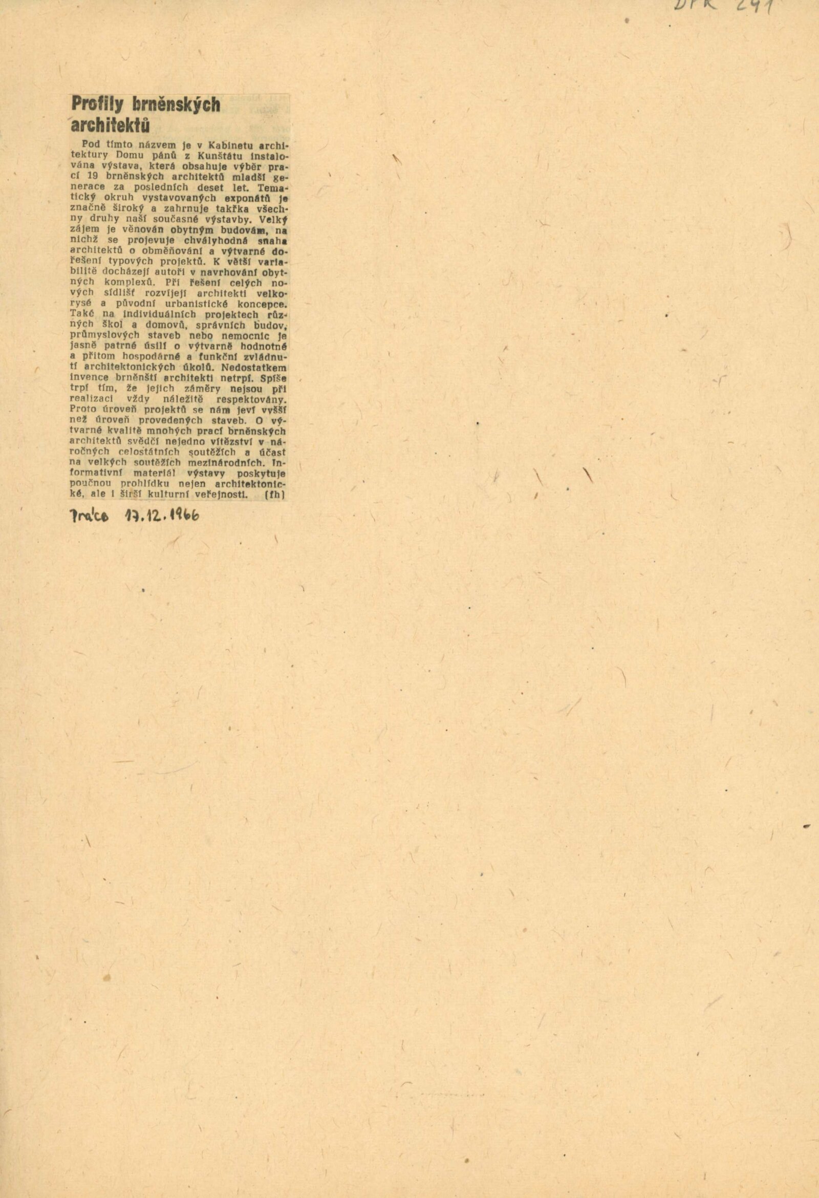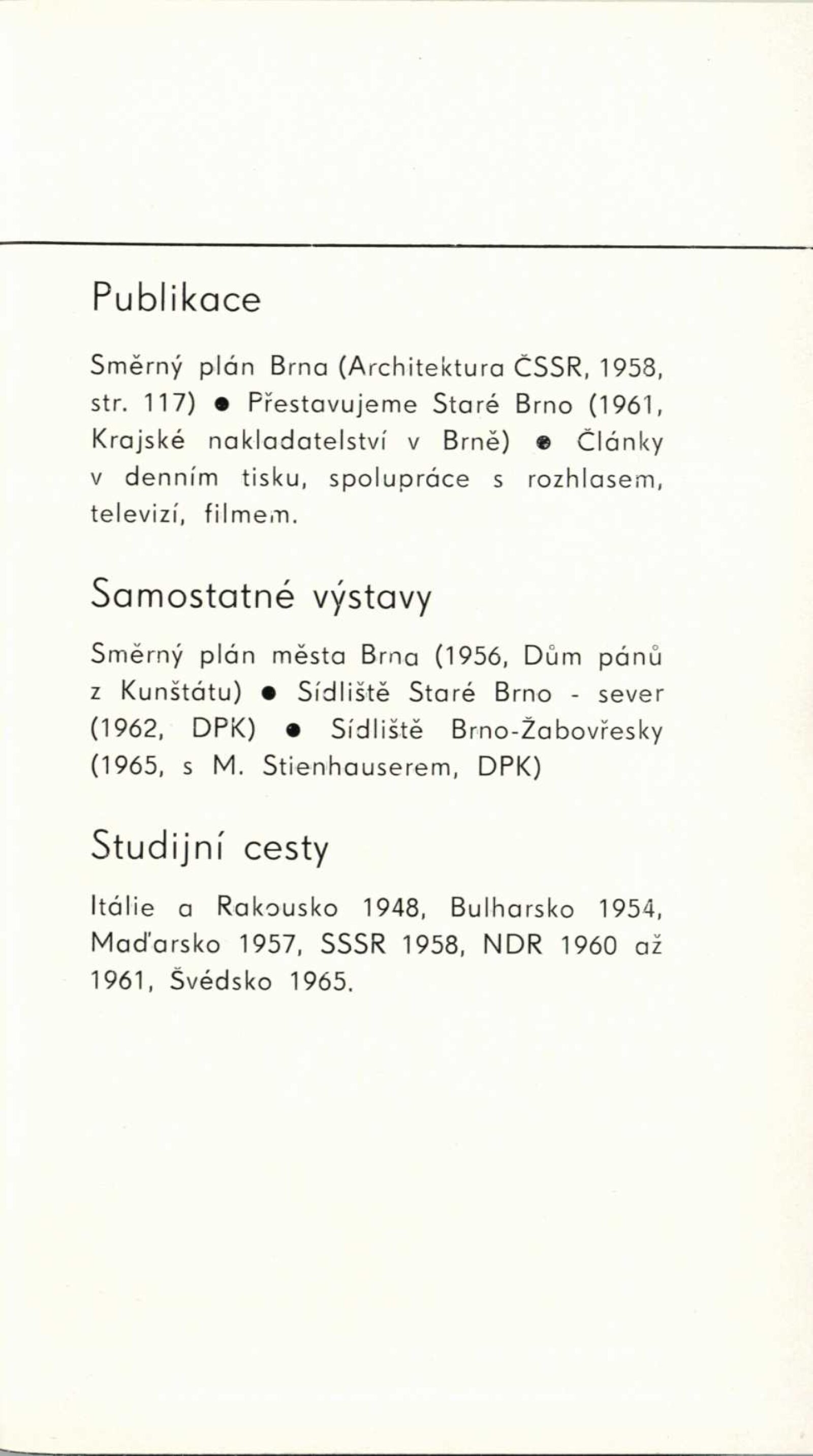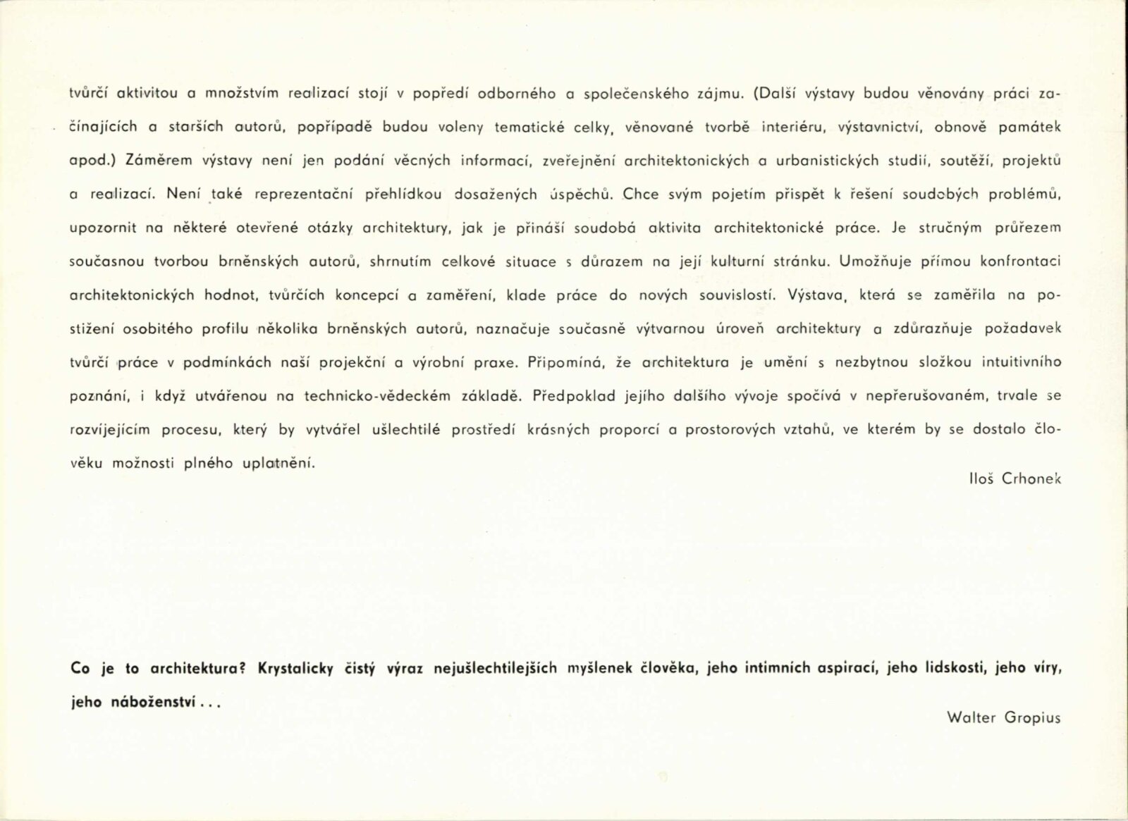 Profily brněnských architektů I: Dům umění města Brna / Dům pánů z Kunštátu, Kabinet architektury Svazu architektů ČSSR, 3. 12. 1965 – 12. 1. 1966 / Text: Iloš Crhonek. – Brno: Svaz architektů ČSSR, 1965. – 76 s., obr., životopisy, soutěže, realizace, studijní cesty + 4 s., obr., DPK 291. – MG; MMB