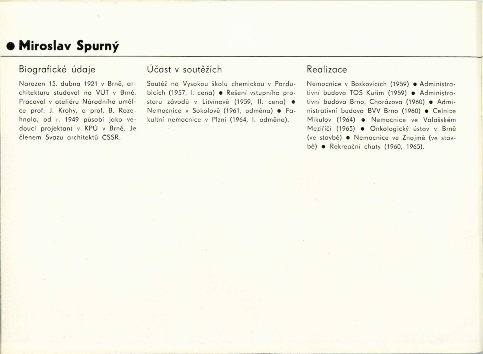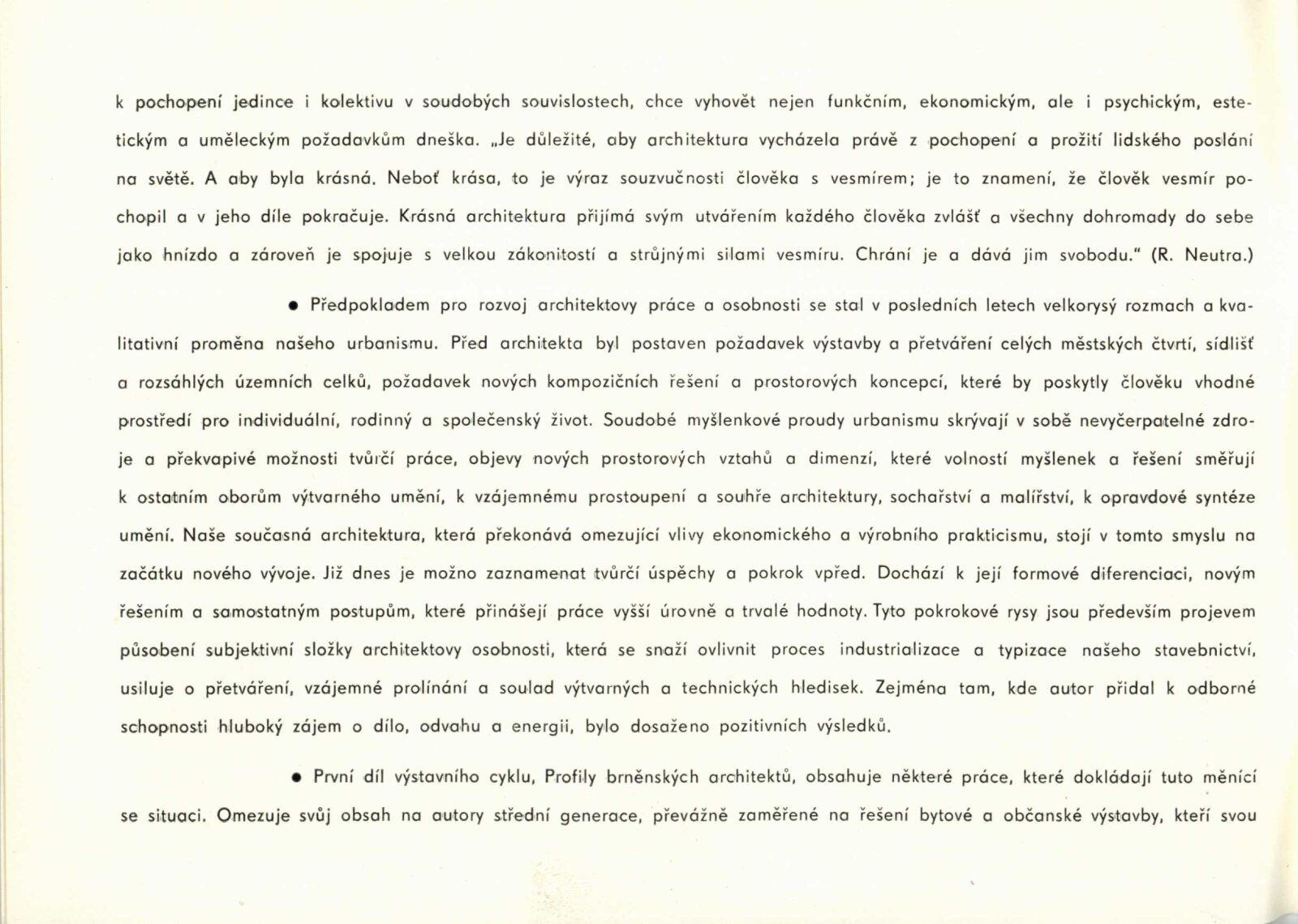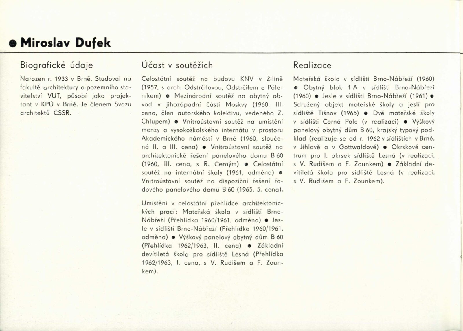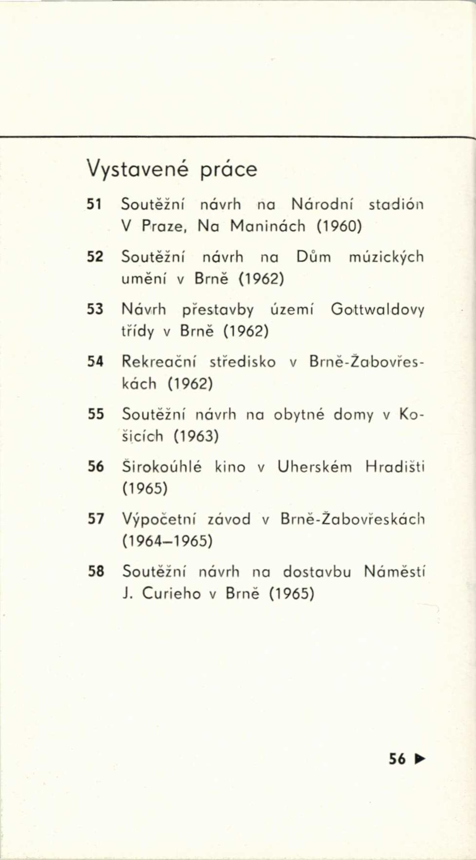 Profily brněnských architektů I: Dům umění města Brna / Dům pánů z Kunštátu, Kabinet architektury Svazu architektů ČSSR, 3. 12. 1965 – 12. 1. 1966 / Text: Iloš Crhonek. – Brno: Svaz architektů ČSSR, 1965. – 76 s., obr., životopisy, soutěže, realizace, studijní cesty + 4 s., obr., DPK 291. – MG; MMB